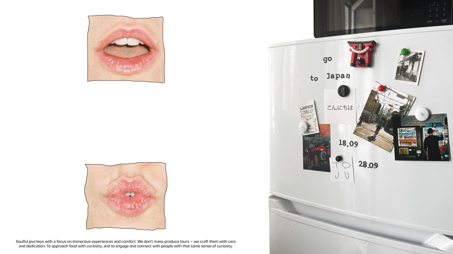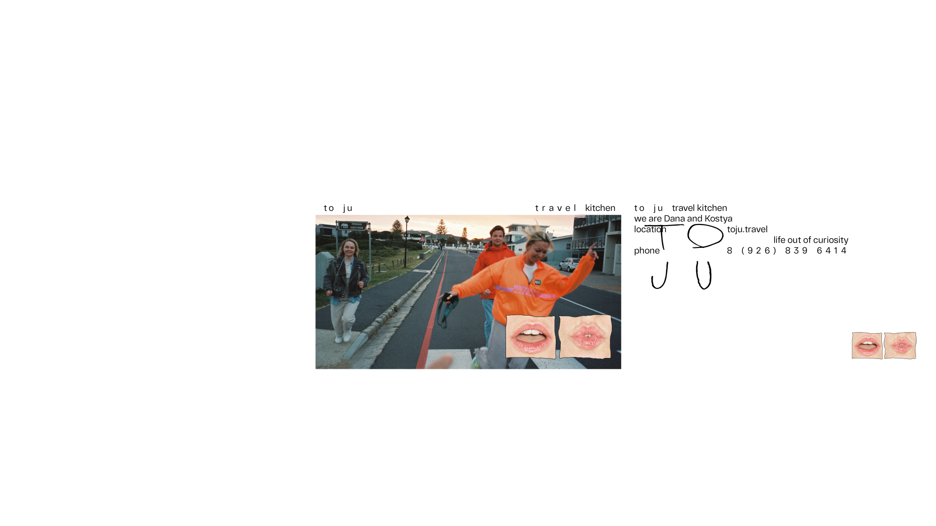 Ключевое сообщение проекта — «жизнь из любопытства». Это способ исследовать мир на чувственном уровне: пробовать, чувствовать, впитывать, смотреть с интересом, как ребёнок, впервые познающий мир на вкус. Эта идея выражена и в логотипе — фотографии рта основательницы проекта, которые «произносят» название to ju. Они символизируют орган чувств, через который мы познаём жизнь — едим, говорим, смеёмся, удивляемся. Рты становятся образом живого диалога с миром, открытого, искреннего и душевного.