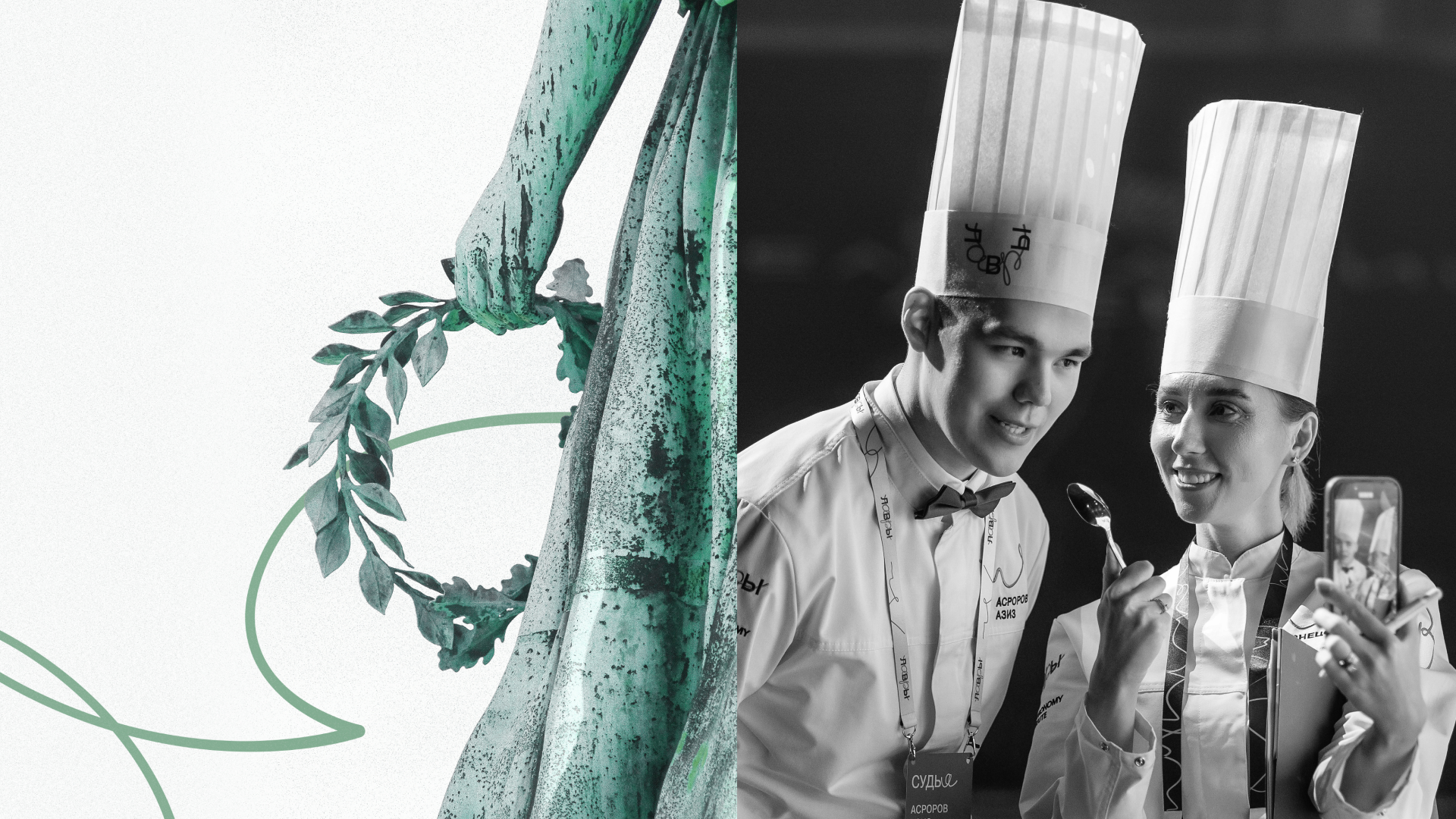 В айдентике собрана правда профессиональной кухни: порядок и выверенные процессы рождают творчество и вкус. Базовый логотип дополнен изогнутым знаком-венком — маркер качества, который работает на форме, бейджах и трофеях.