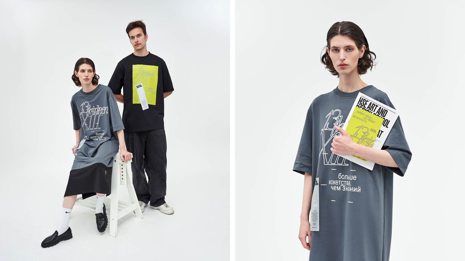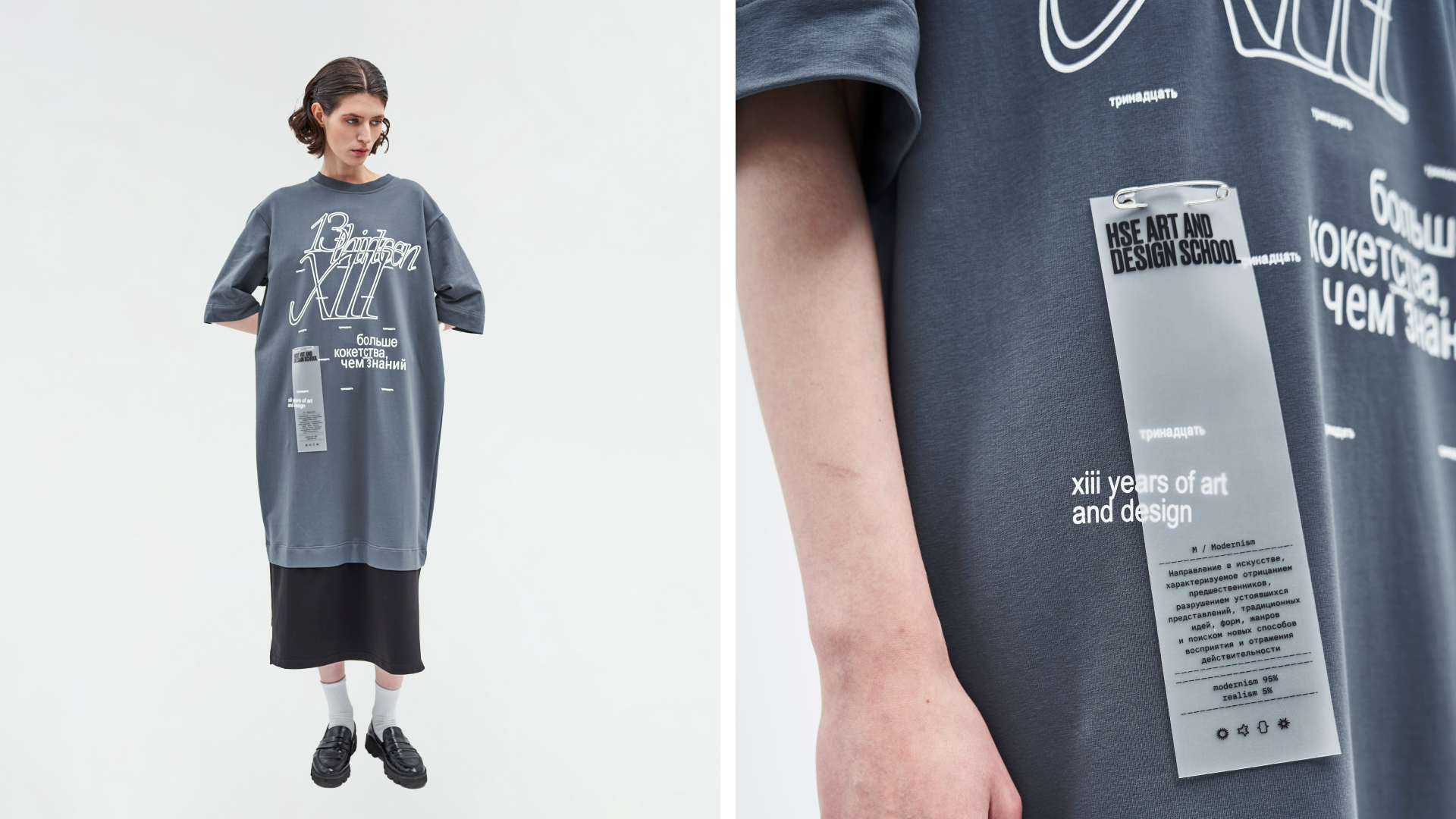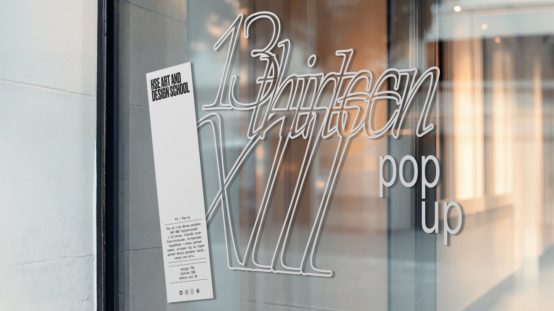 Айдентика 13-летия построена вокруг архивных комментариев кураторов — лаконичных, ярких и безжалостно честных фраз, оставленных после собеседований с абитуриентами. Эти высказывания стали одновременно манифестом и шуткой, автофикшеном и точкой входа в культуру школы. Айдентика одновременно строга и иронична, честна и принципиально «антигламурна». Стиль живёт в системе упорядоченного хаоса: он сочетает в себе разные по настроению, пластике и характеру элементы, которые складываются в уникальный, выразительный визуальный язык.