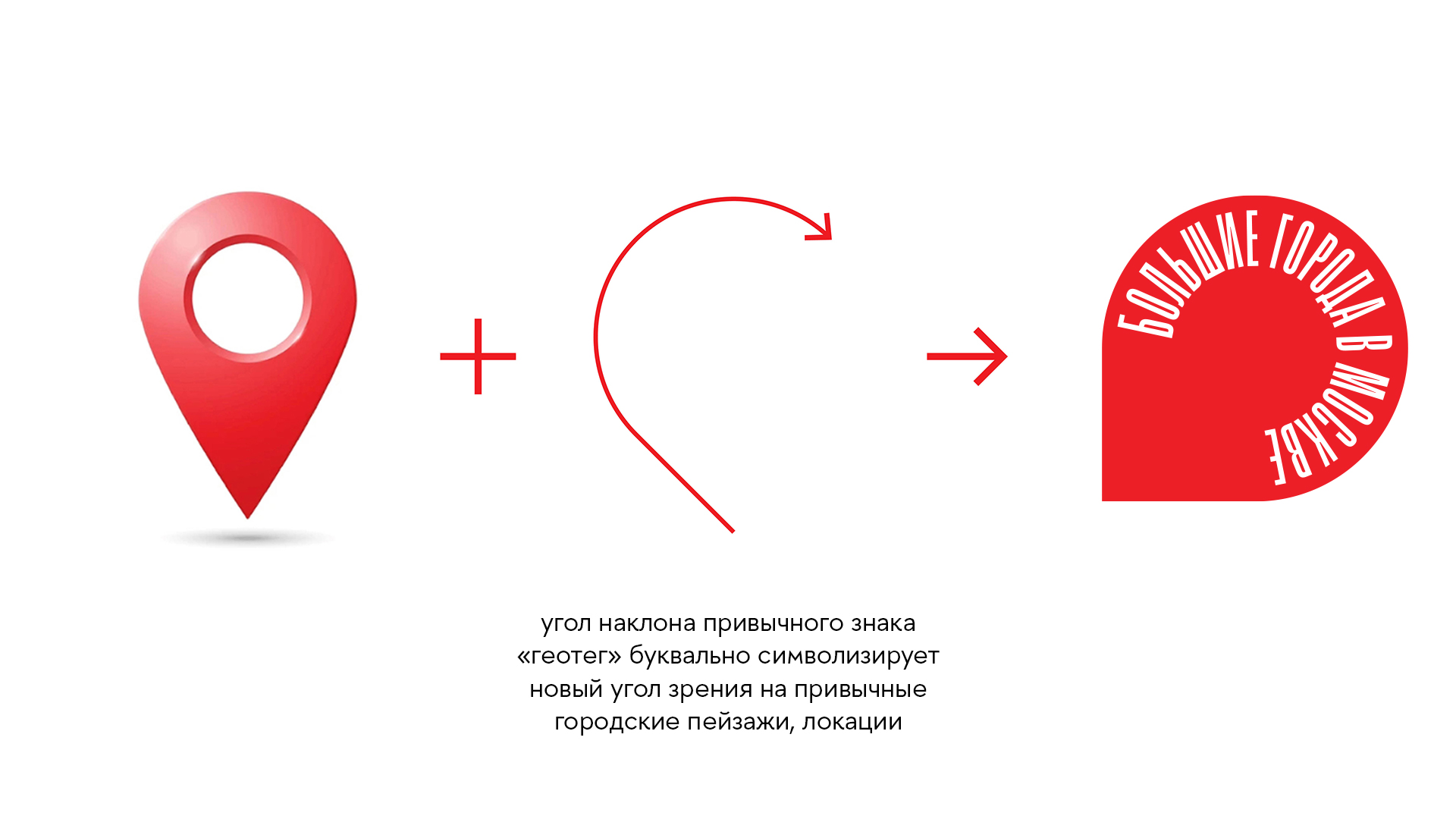 Основой для айдентики, подчеркивающей ключевые смыслы проекта, стали переосмысленный знак геотега и уникальное шрифтовое решение. В то время, как угол наклона фирменного знака символизирует новый угол зрения на пейзажи города, типографический фон играет со «множественностью», представляя колоссальный объем участников проекта — представителей разных стран и городов мира.