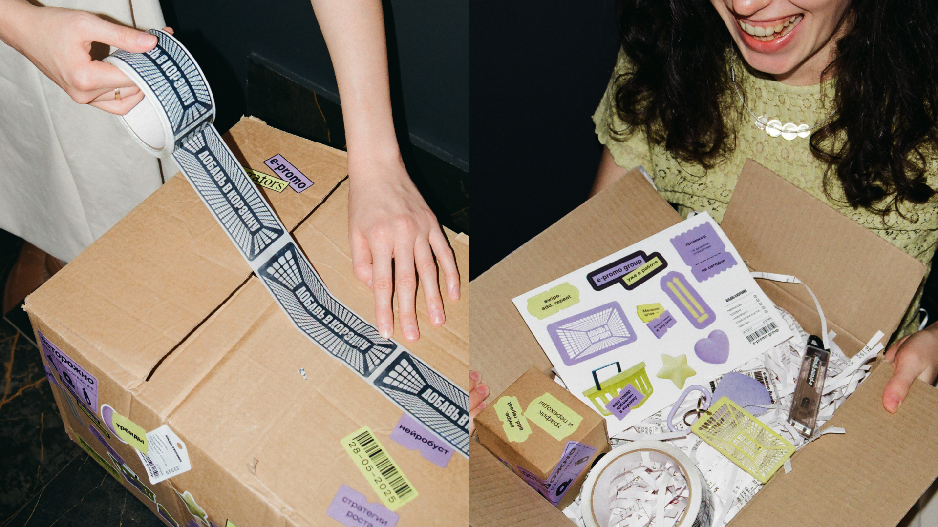 В подарках продолжили вайб проекта: авоська с брендированной коробкой, оклеенной фирменным скотчем и стикерами. Внутри — набор «гейм-ченджер» для работы с маркетплейсами: