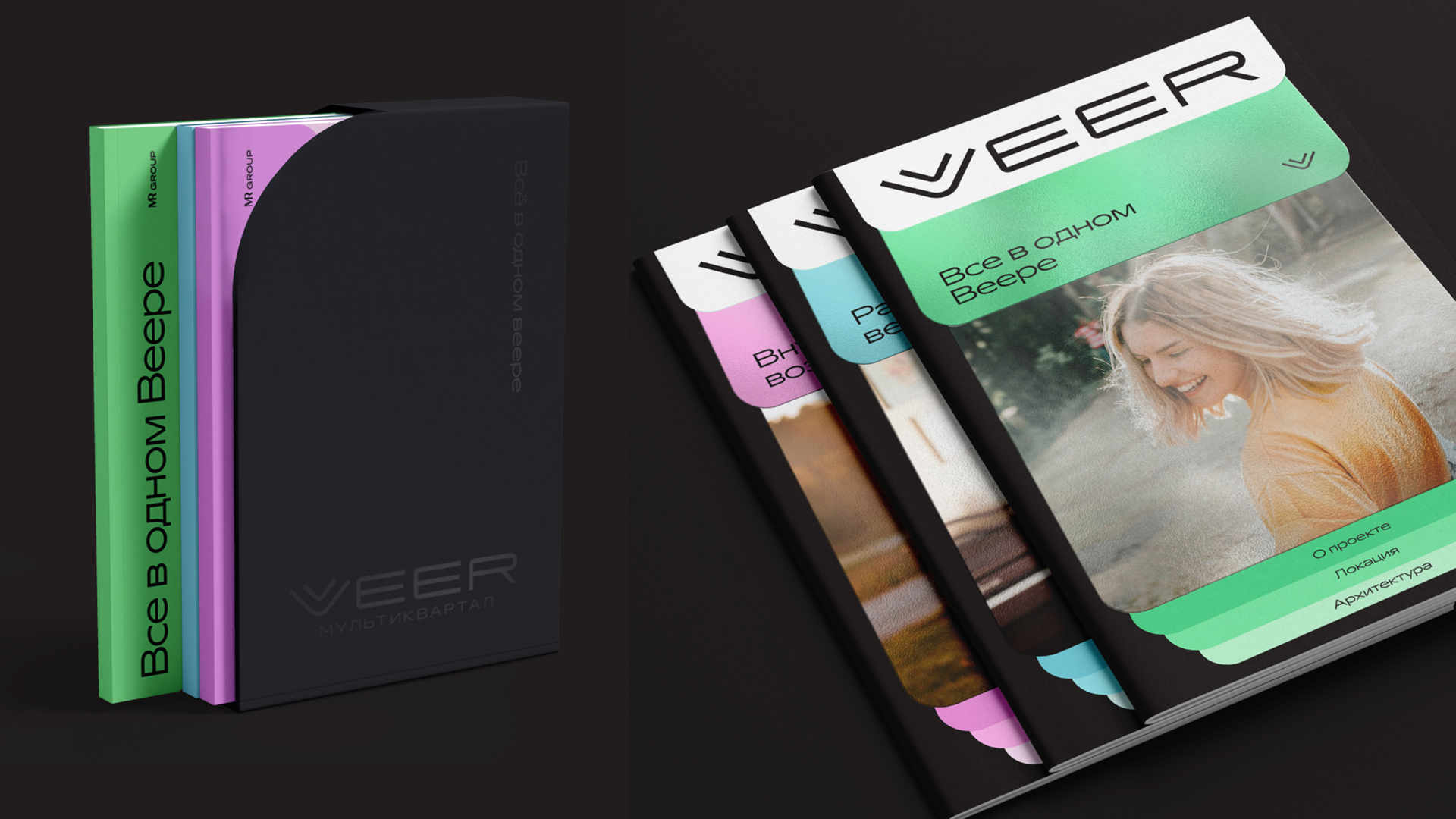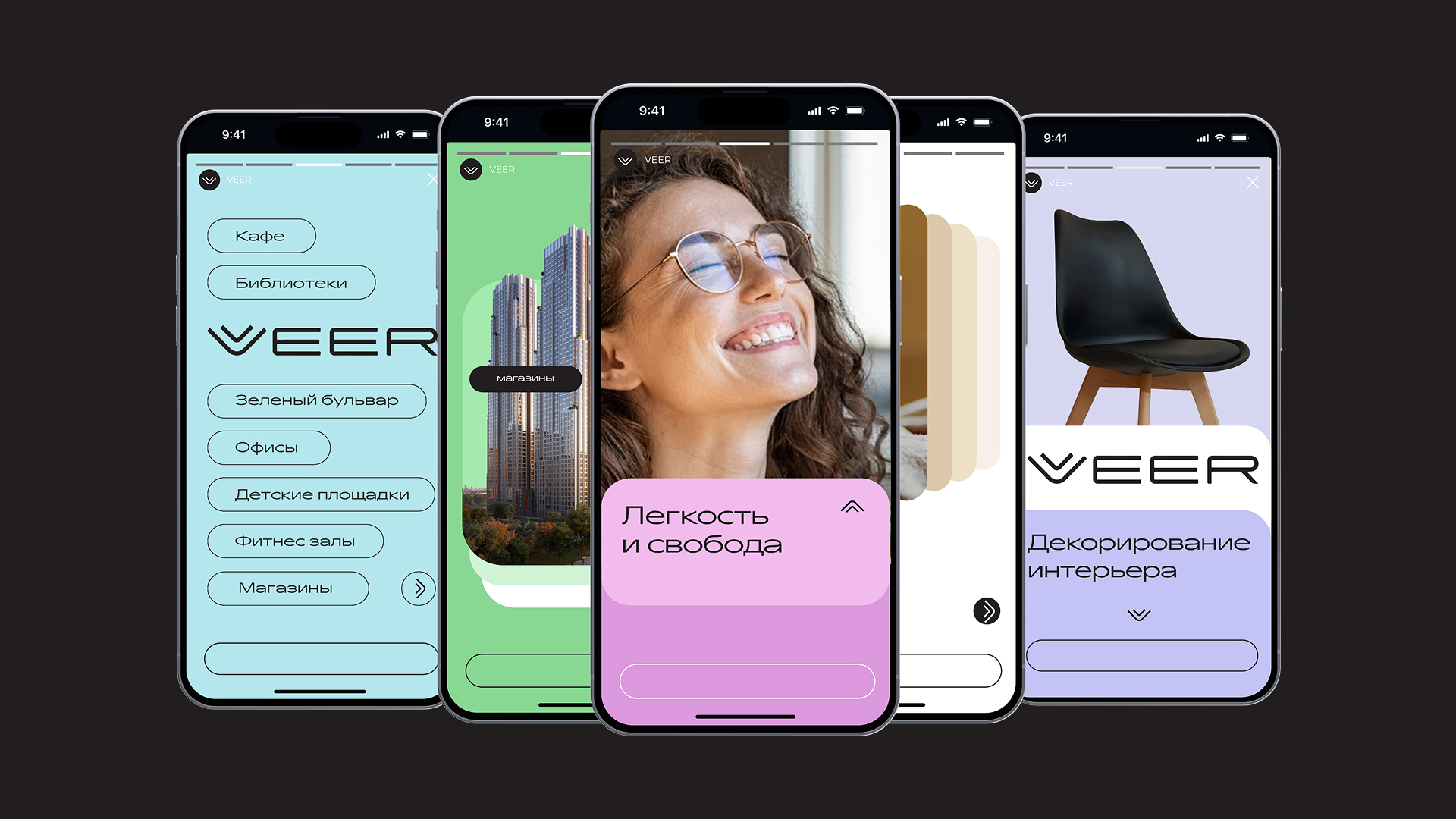 Визуальный стиль VEER — гибкий, многослойный, динамичный, исследует возможности использования цифровых метафор в таких «аналоговых» индустриях, как девелопмент.