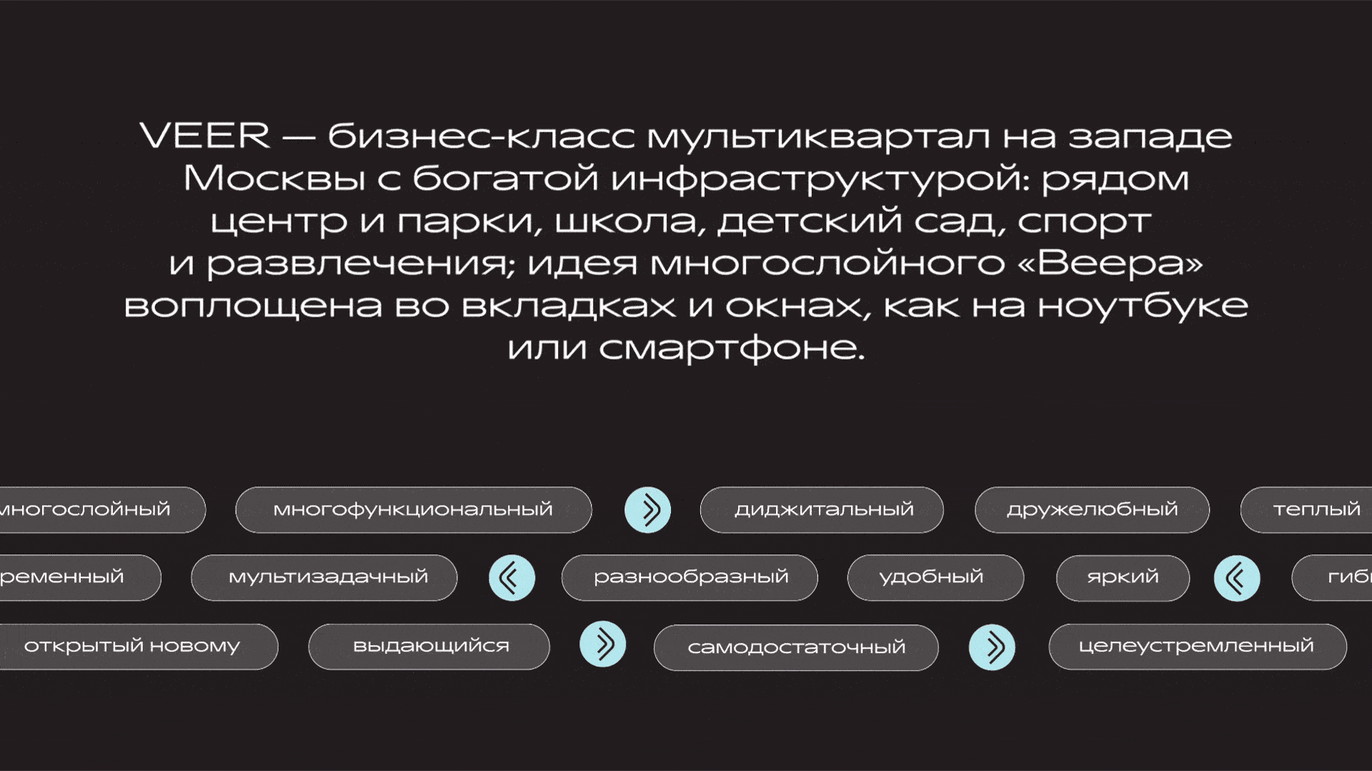 VEER — футуристичный мультиквартал бизнес-класса в 5 минутах от Кутузовского проспекта. Это новая экосистема в престижном ЗАО, поражающая масштабностью инфраструктуры и расположенная всего в 15 минутах от центра и от Сколково. VEER — не просто дом, а дом-смартфон, удобный технологичный гаджет, подстраивающийся под запрос и открывающий вселенную мультивозможностей своим резидентам: от функциональных планировок до чайной во дворе дома. Здесь все сервисы города собраны в один VEER.