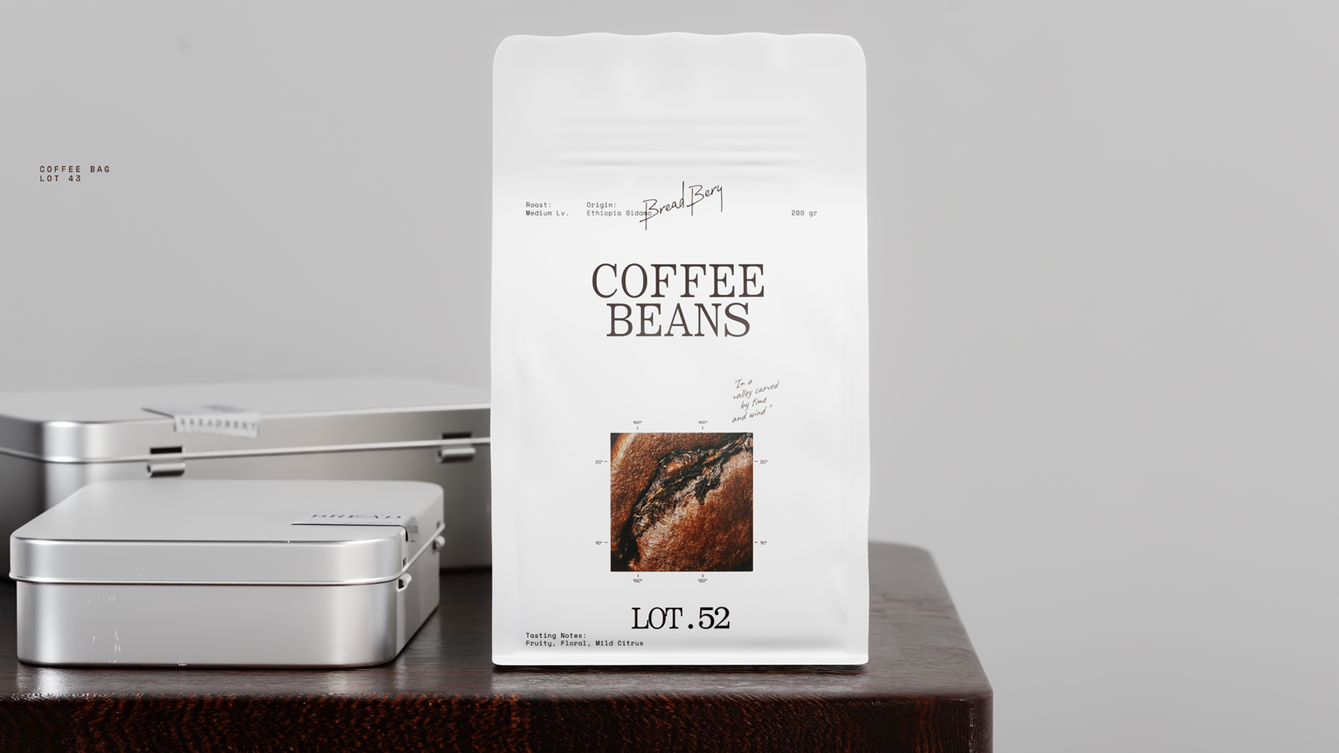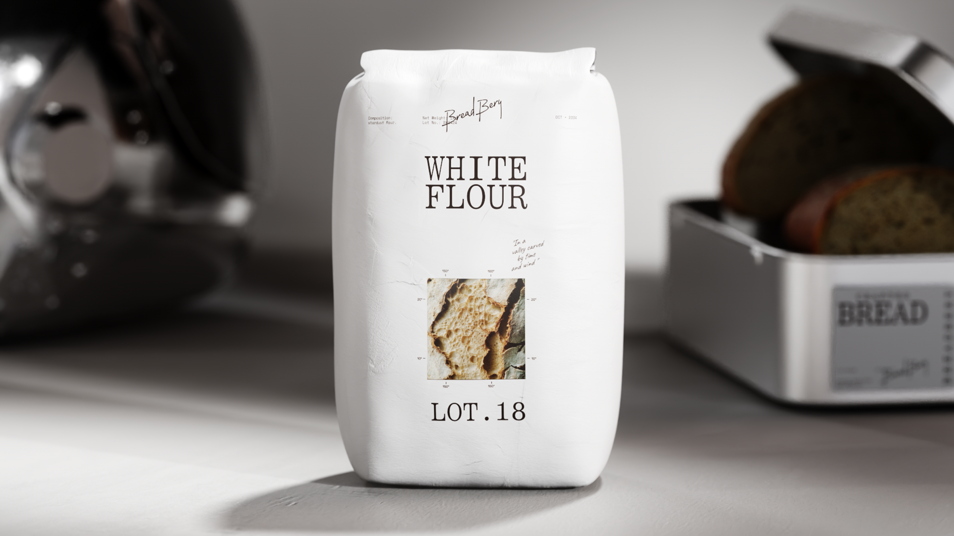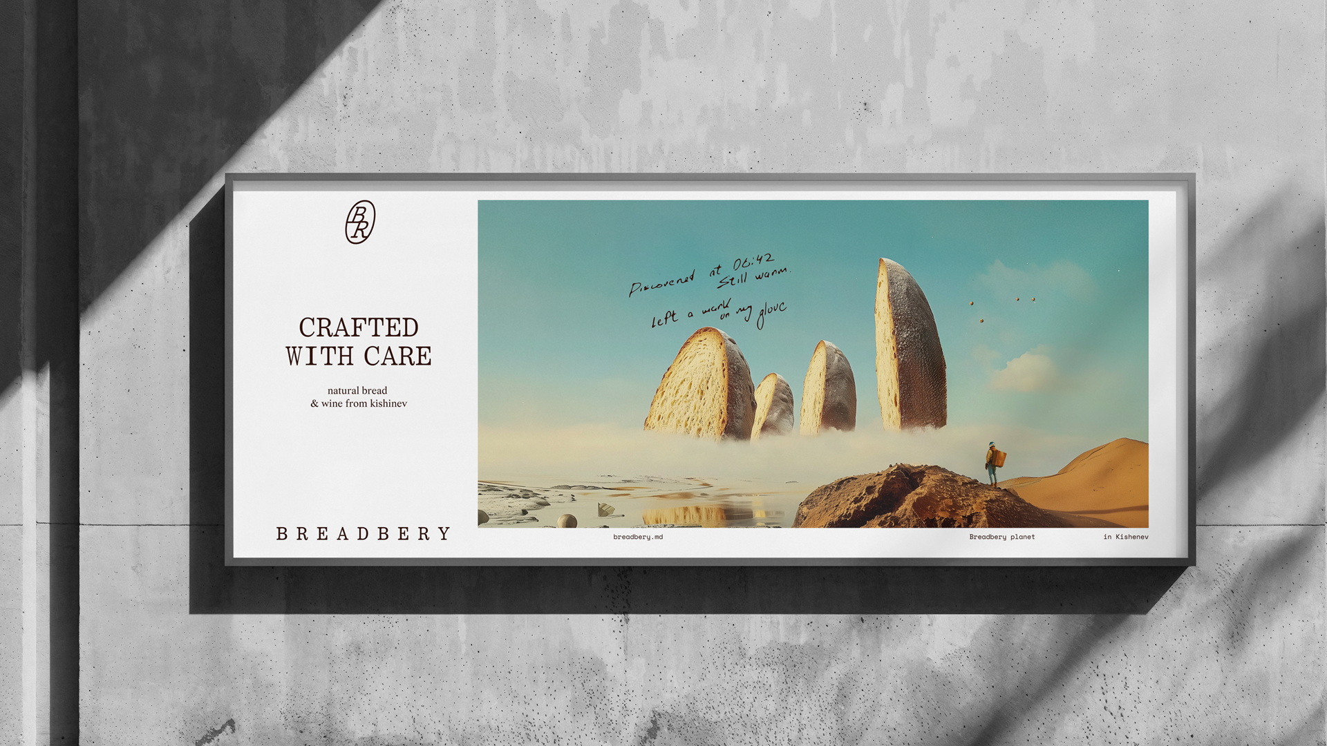 Образ Брэдбери воплощает экологичность, традиции и любознательность — отважного писателя-исследователя, отправившегося за пределы планеты в поисках лучших рецептур хлеба. Айдентика сочетает книжную верстку и эстетику утилитарной графики — центральная выключка, антиква и машинописный шрифт.