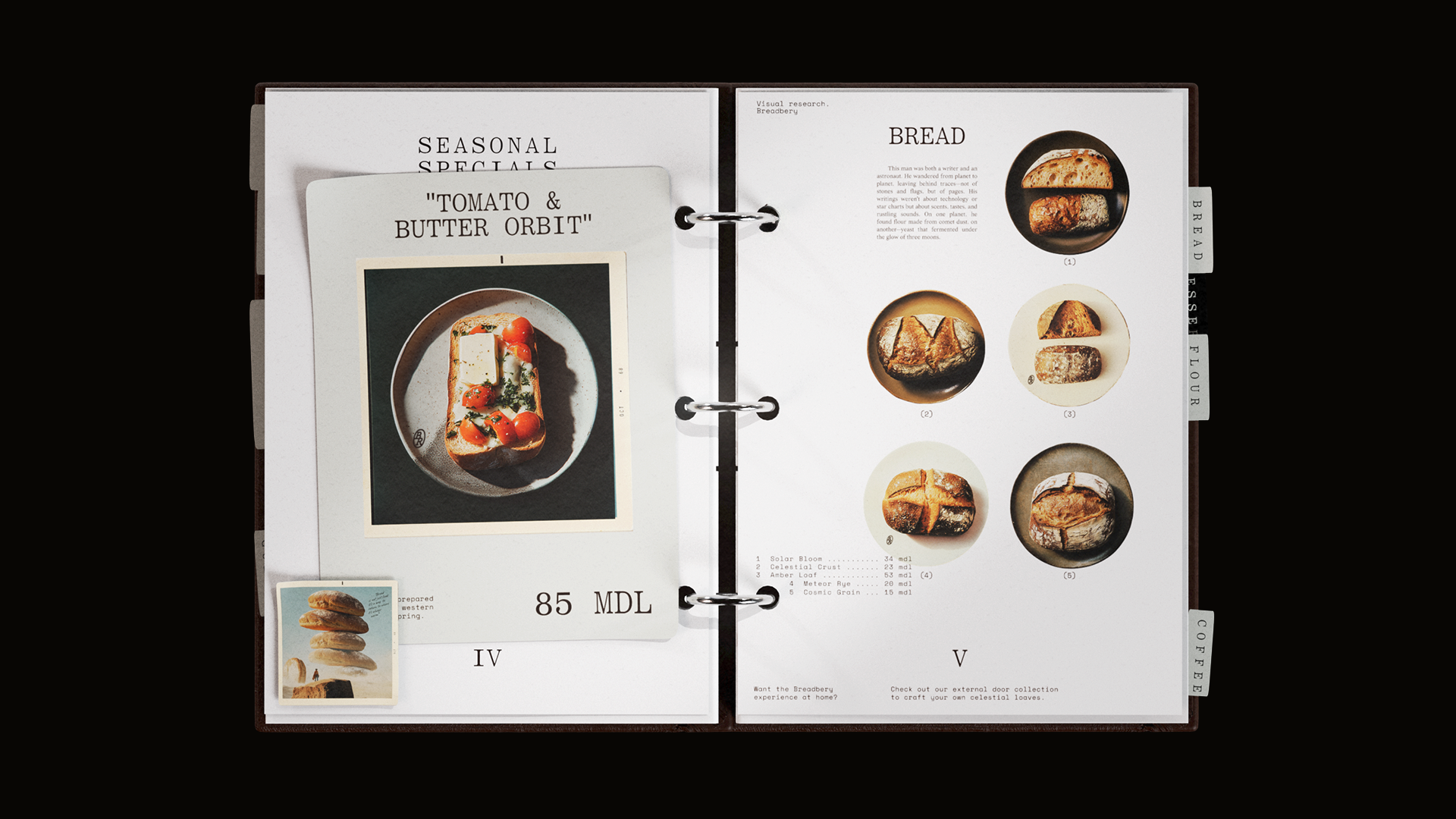 Результатом исследований Брэдбери стали уникальные натуральные сорта хлеба, выпечка и десерты, представленные в меню скрапбуке — в крафтовом «бортовом журнале» с диковинными образцами с далёкой планеты.