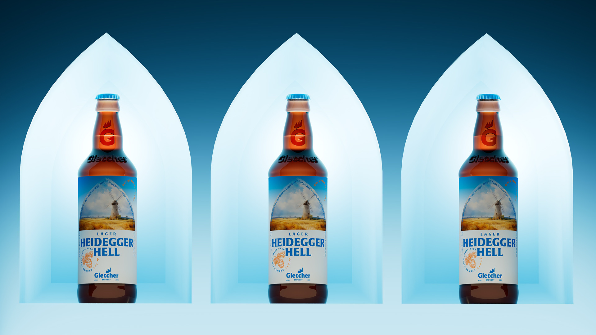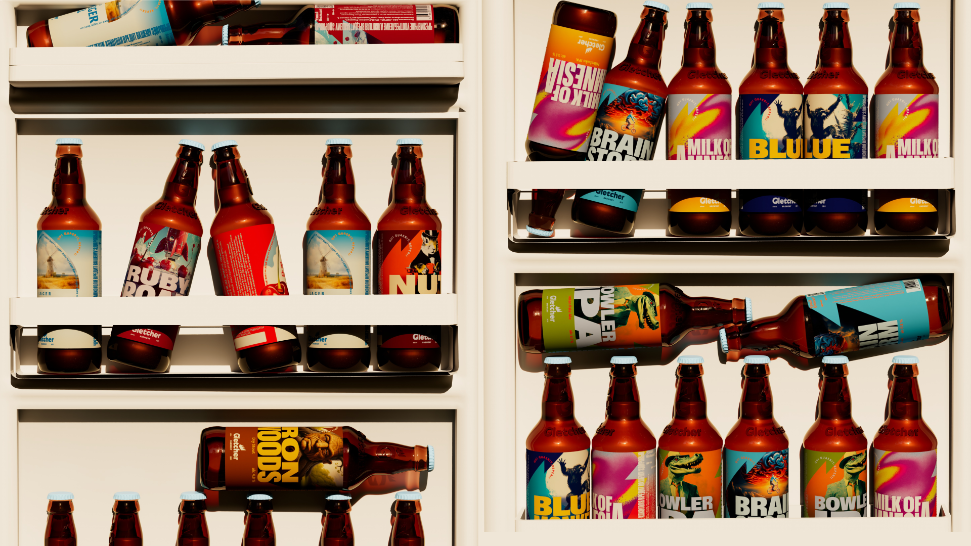 Освежили брендинг самой пивоварни, пересмотрев знак, но оставив пики движущего ледника Глетчер. С помощью нейросетей разработали иллюстрации для этикеток всех сортов, создав фантастический мир Глетчер, куда может отправиться каждый жаждущий неожиданных впечатлений. Перепридумали все носители: от уникальной формы тары пивных бутылок (новая форма позволила сделать этикетку больше, а значит заметнее в полке) до фирменных башен