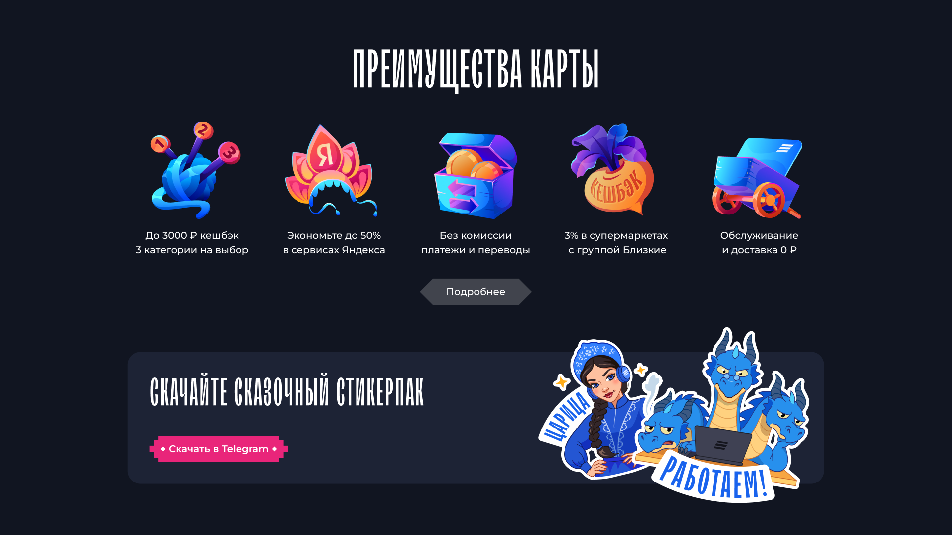 Вместе с командой банка создали лендинг, где герои русских сказок оживают в современном мире. На сайте Маша с Медведями отдыхают после дел, Василиса диджеит под звездами, Горыныч парит над городом, а домовенок Кузя с планшетом в руках открывает для себя новый волшебный мир.
