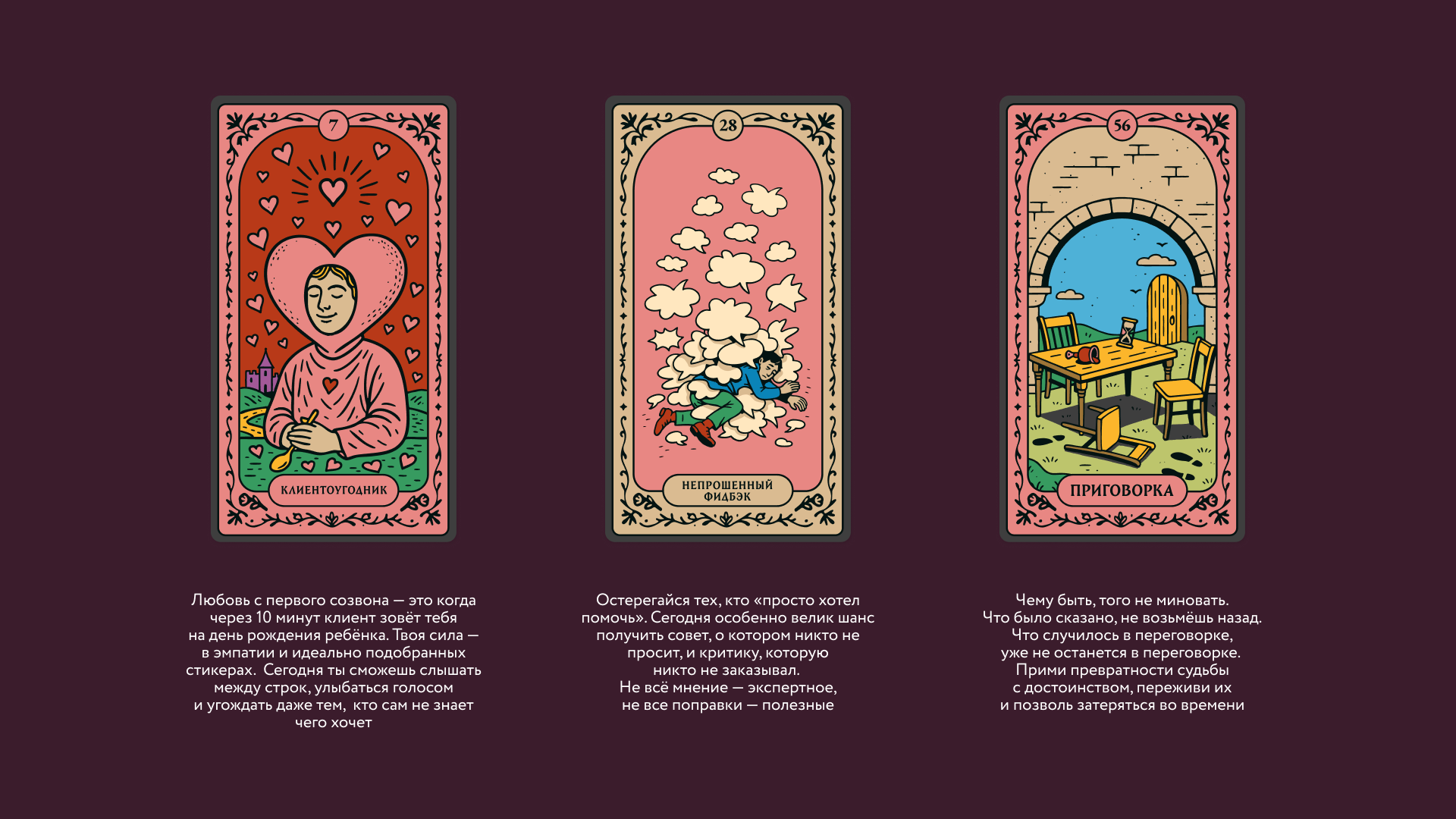 Колоды уже разошлись по рабочим столам клиентов. У кого-то они лежат рядом с клавиатурой как талисман, у кого-то стали поводом для шутки на звонке. А главное — теперь на любой вопрос в офисе есть короткий и универсальный ответ: «Расклад такой».