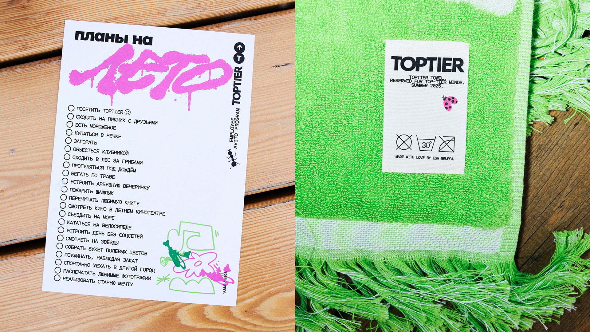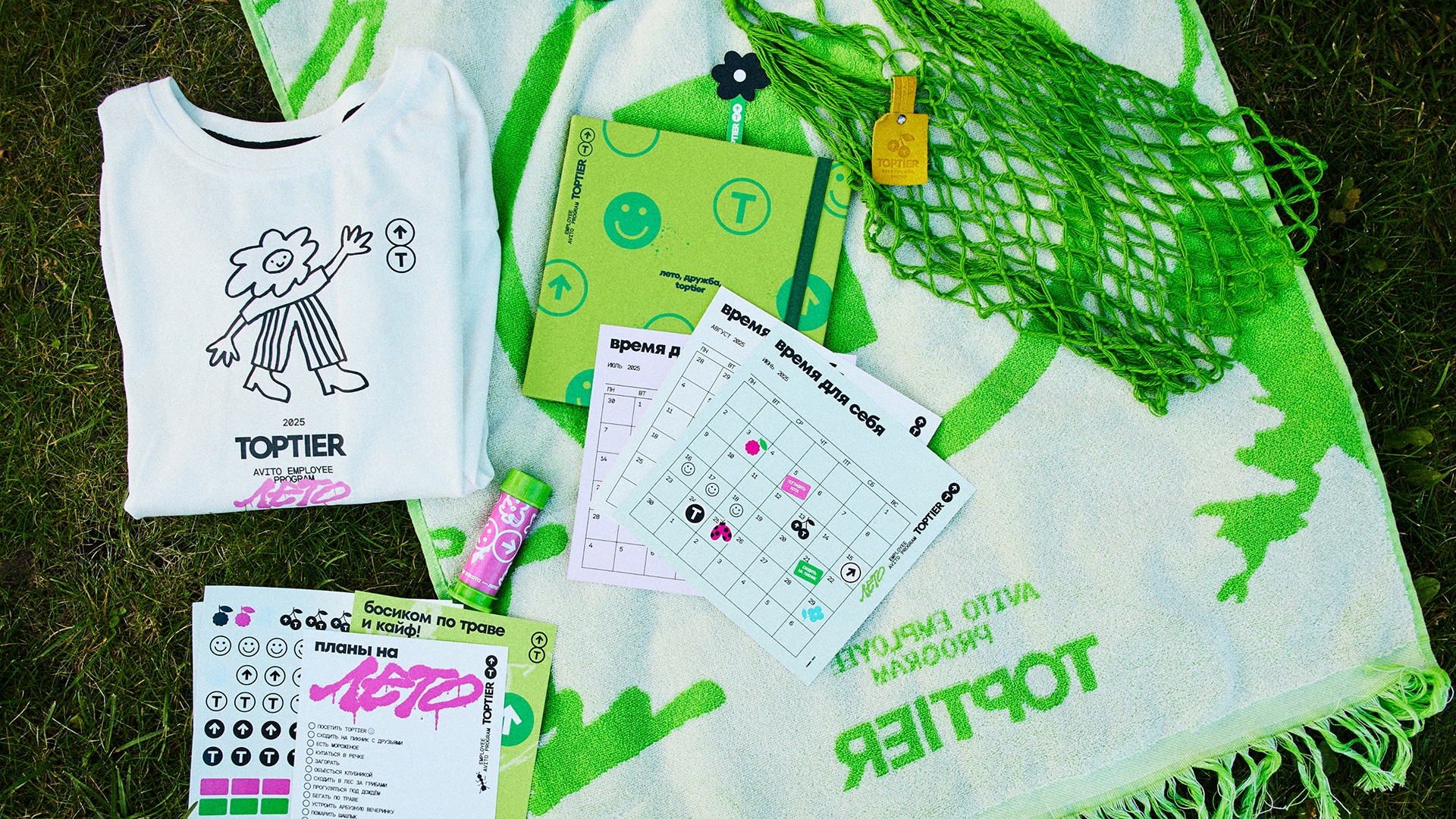 «Лето, дружба, TopTier» — главный слоган айдентики летнего мероприятия клуба Avito! Мы вспомнили наше детство и школьные каникулы, и сделали очень, очень много летнего мерча. Всё, что нужно для настоящих летних каникул: мыльные пузыри, полотенце, авоську, футболки, цветочные браслетики, летний планер и, конечно, жвачку.