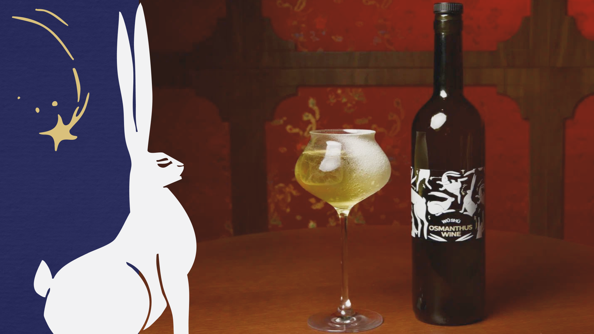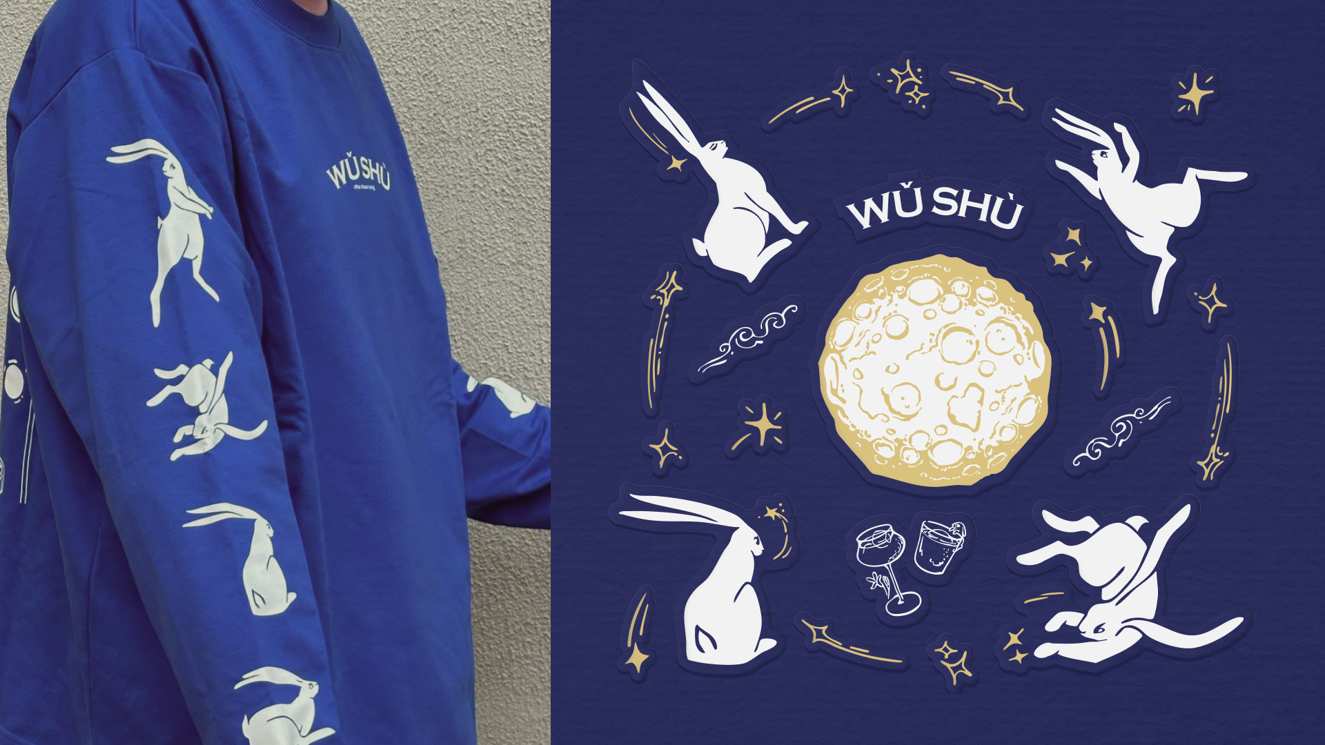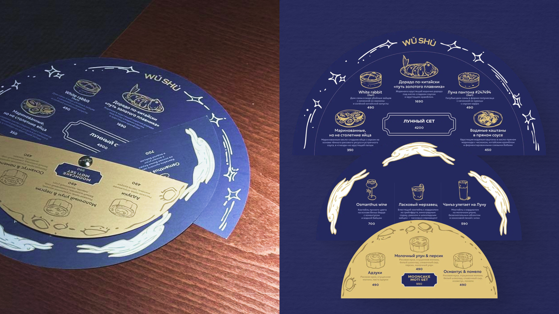 Заяц Ву, перегоняющий сам себя, скачет по луне на страницах меню, где каждое блюдо проиллюстрировано в узнаваемом стиле айдентики WU SHU.