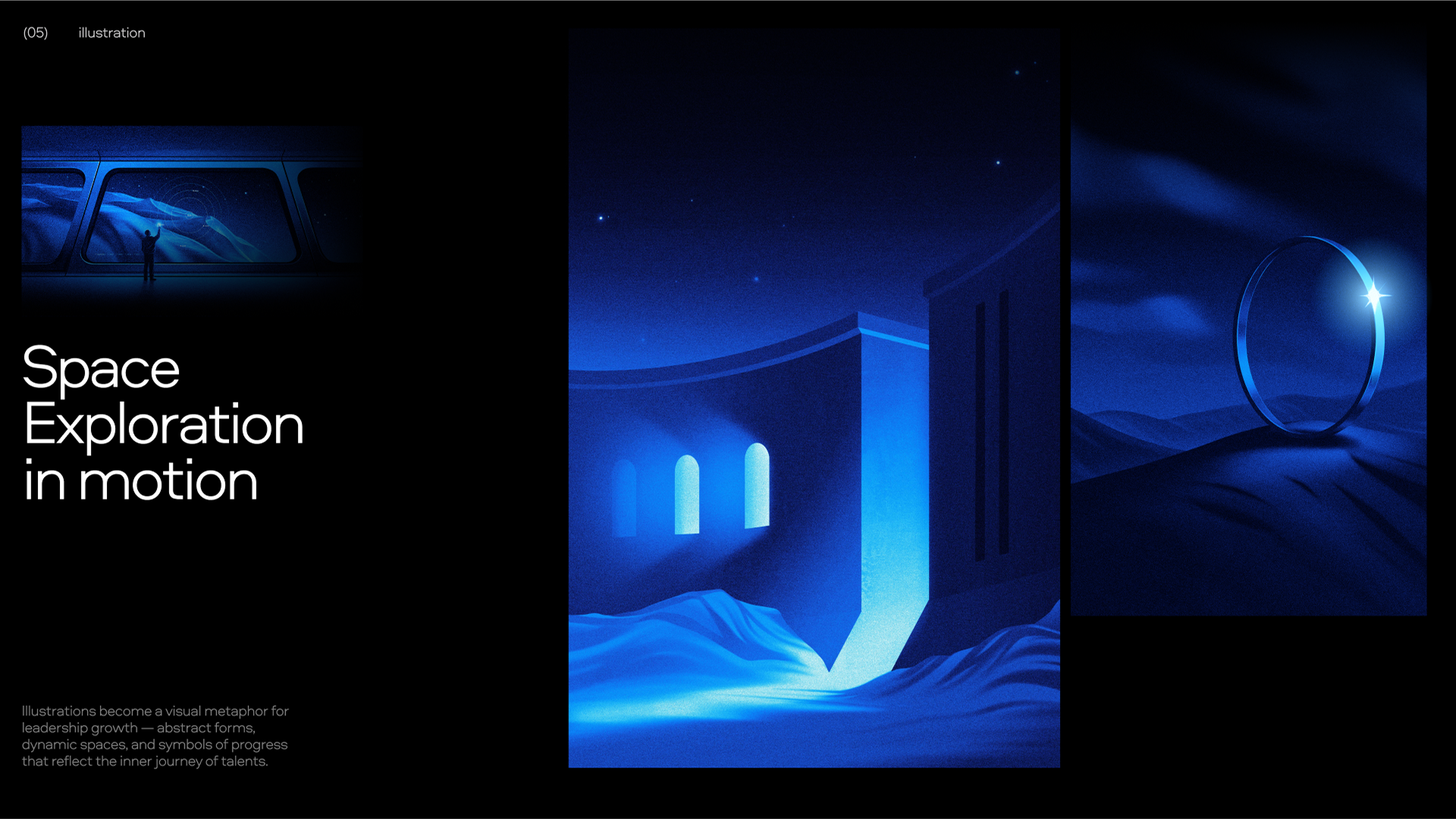 Космостиль — штука коварная, потому что есть риск провалиться в криптовалютный и киберспортивный визуал. Но мы нашли способ отстроиться: использовали шум, чёрно-белые фотографии и дуотон. Шум и ч/б отсылают к научно-документальным архивам и создают ощущение достоверности и глубины, а дуотон в сине-голубых оттенках гармонично сочетается с сюрреалистическими космическими сюжетами.