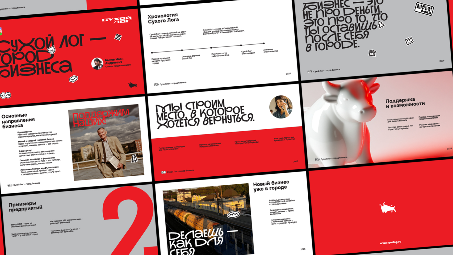 В айдентике туристического бренда Муниципального округа Сухой Лог любопытный красный бычок перекочевал из официального герба в логотип, а надпись «Сухой Лог» бережно перенесена с узнаваемой стелы при въезде в Сухой Лог. Также в логотипе легко угадывается образ скалы «Три сестры» и зеленые лога-холмы. Дополнительными элементами стиля стали иконки-стикеры в которых любой житель города узнает знакомые образы: самый высокий мост на Урале, аммониты, беседка санатория «Курьи», динозавр и даже котики, которых очень любят жители города. Специально для Сухого Лога был адаптирован акцидентный шрифт, разработанный агентством REDKEDS, приобретя новое название «Слог».