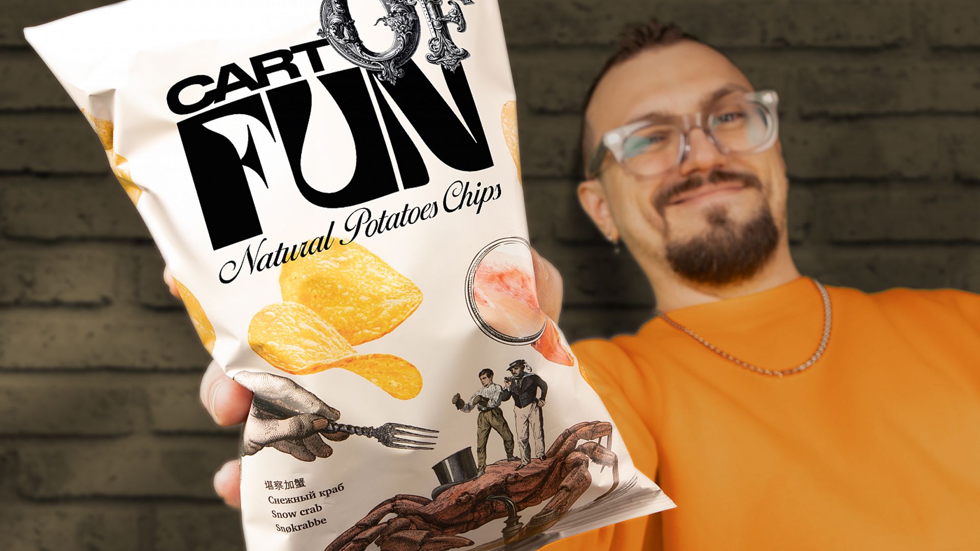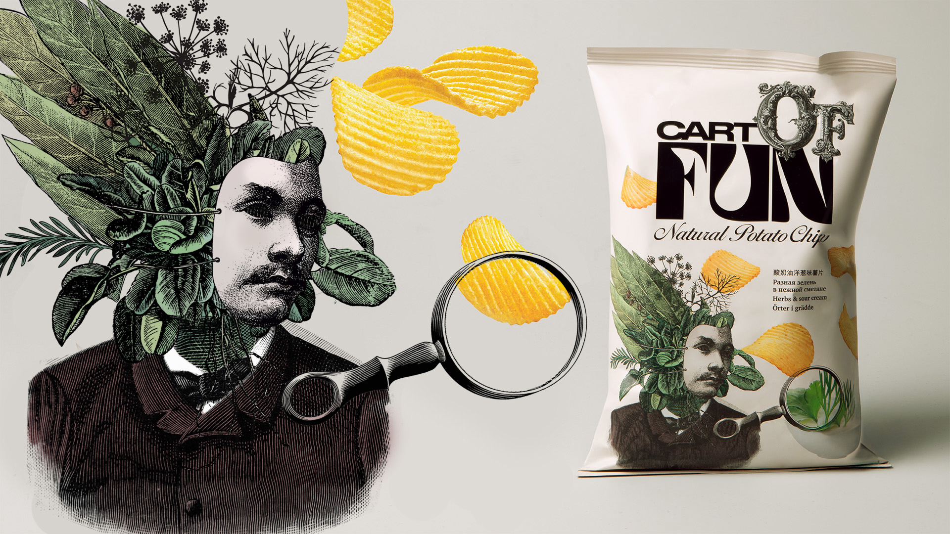 Абсурдные иллюстрации на упаковке в сочетании с эклектичным логотипом и реалистичным изображением чипсов создают иррациональное притяжение на перегруженной полке снэков.