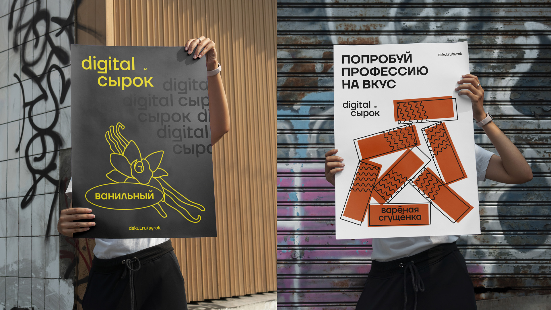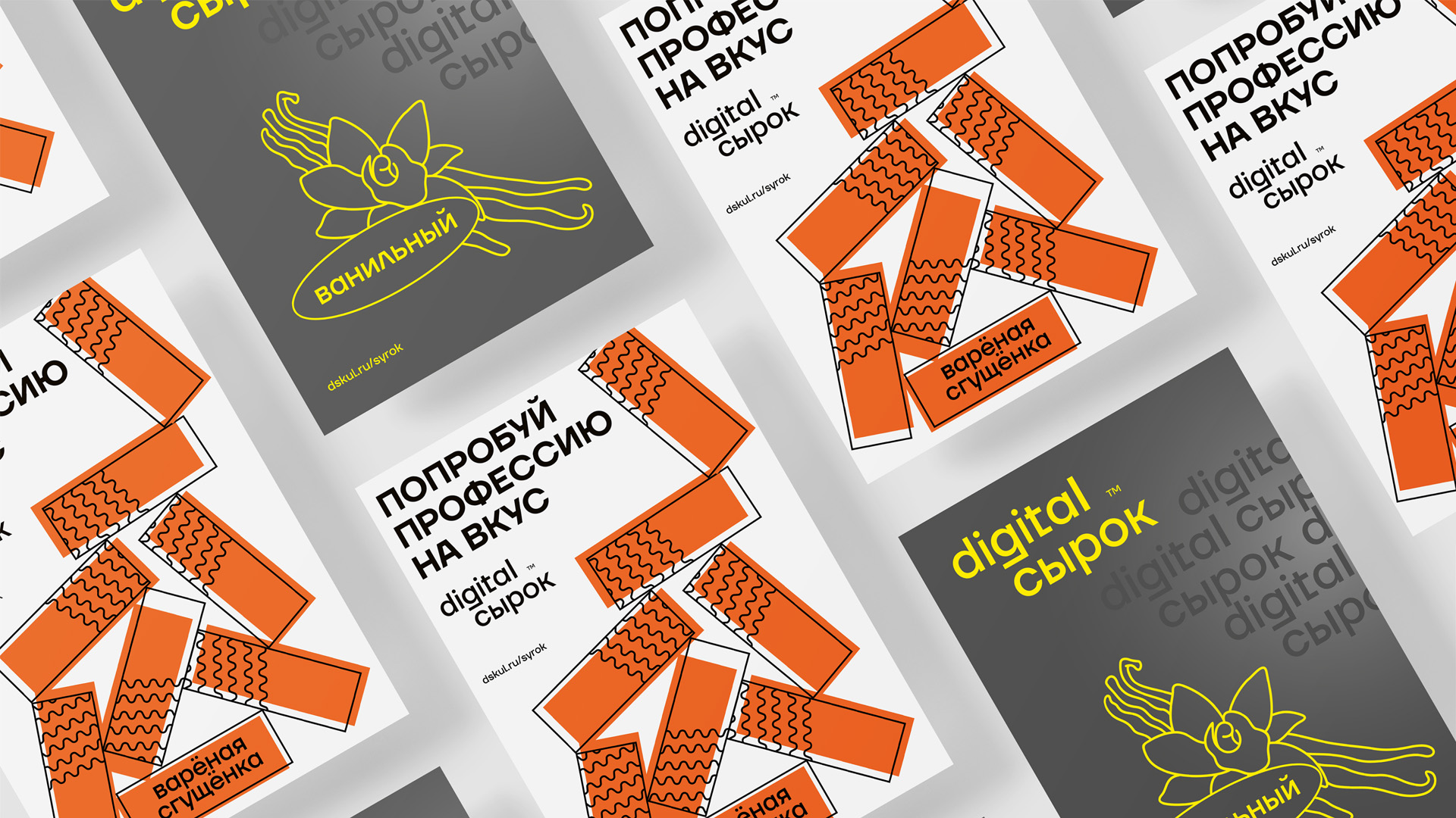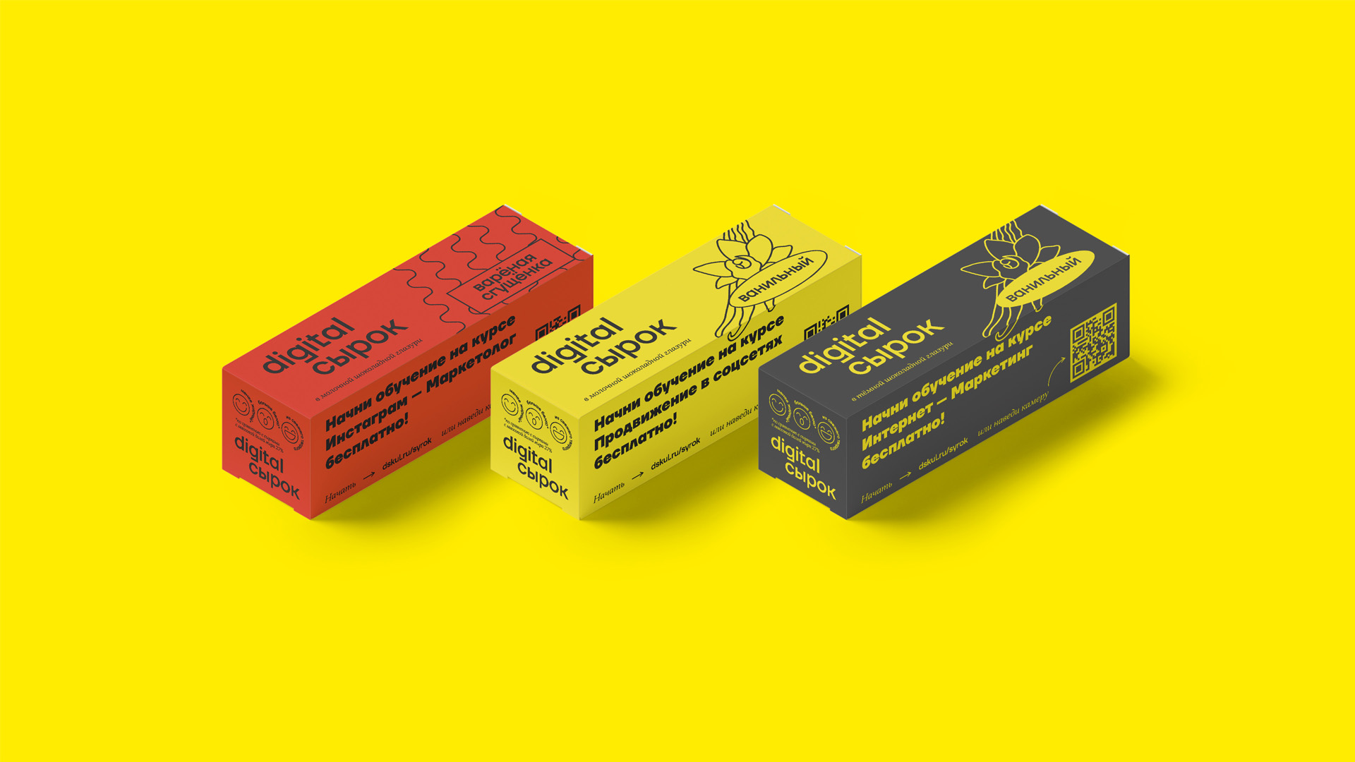 Мы объединили эти два вектора, и так родился digital сырок. Бренд создан в духе яркого минимализма. Каждая упаковка — ключ к обучению диджитал профессиям. Сканируете QR-код и попадаете на бесплатный курс интернет-маркетинг, продвижение в социальных сетях, бренд-маркетинг.