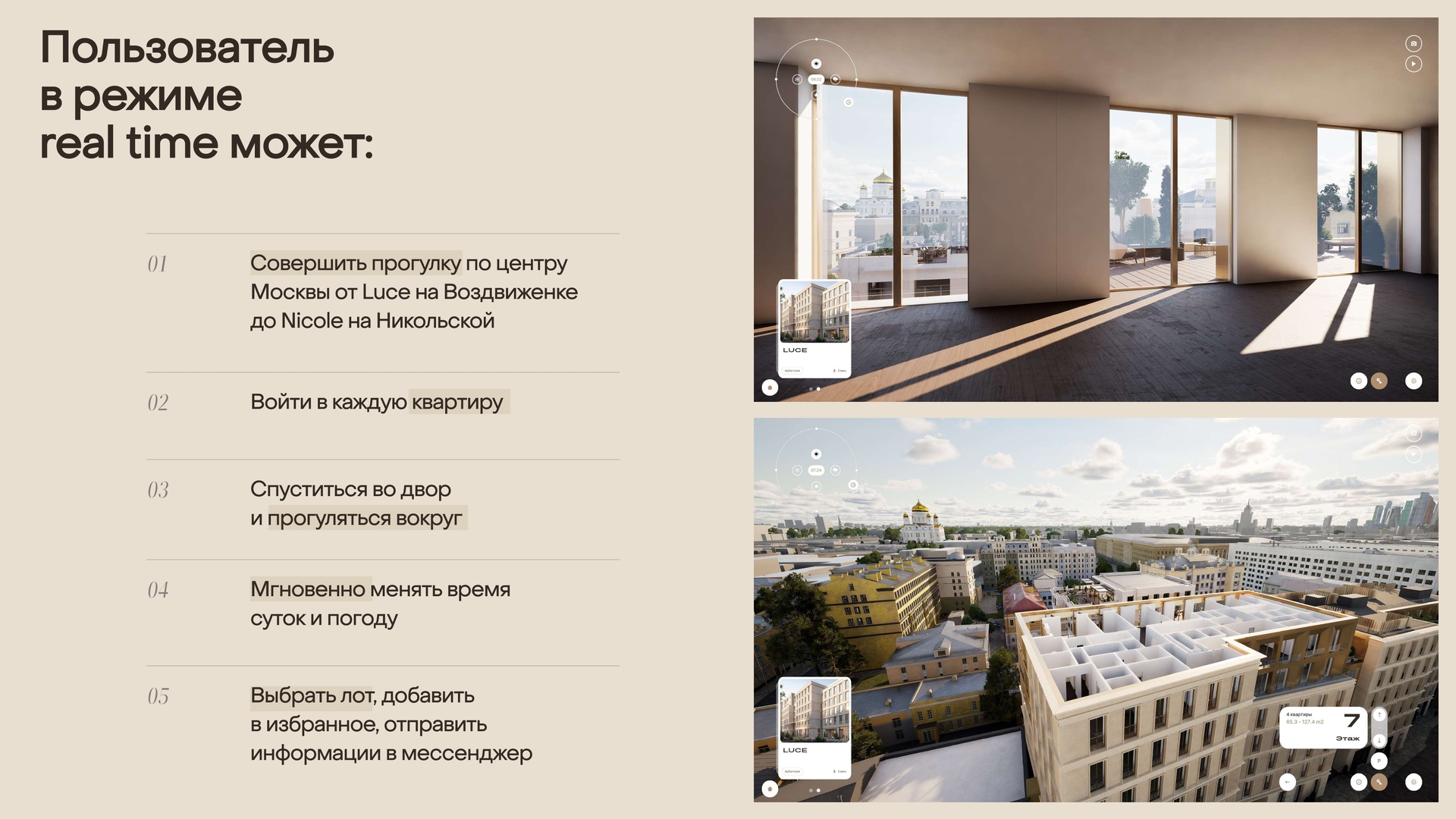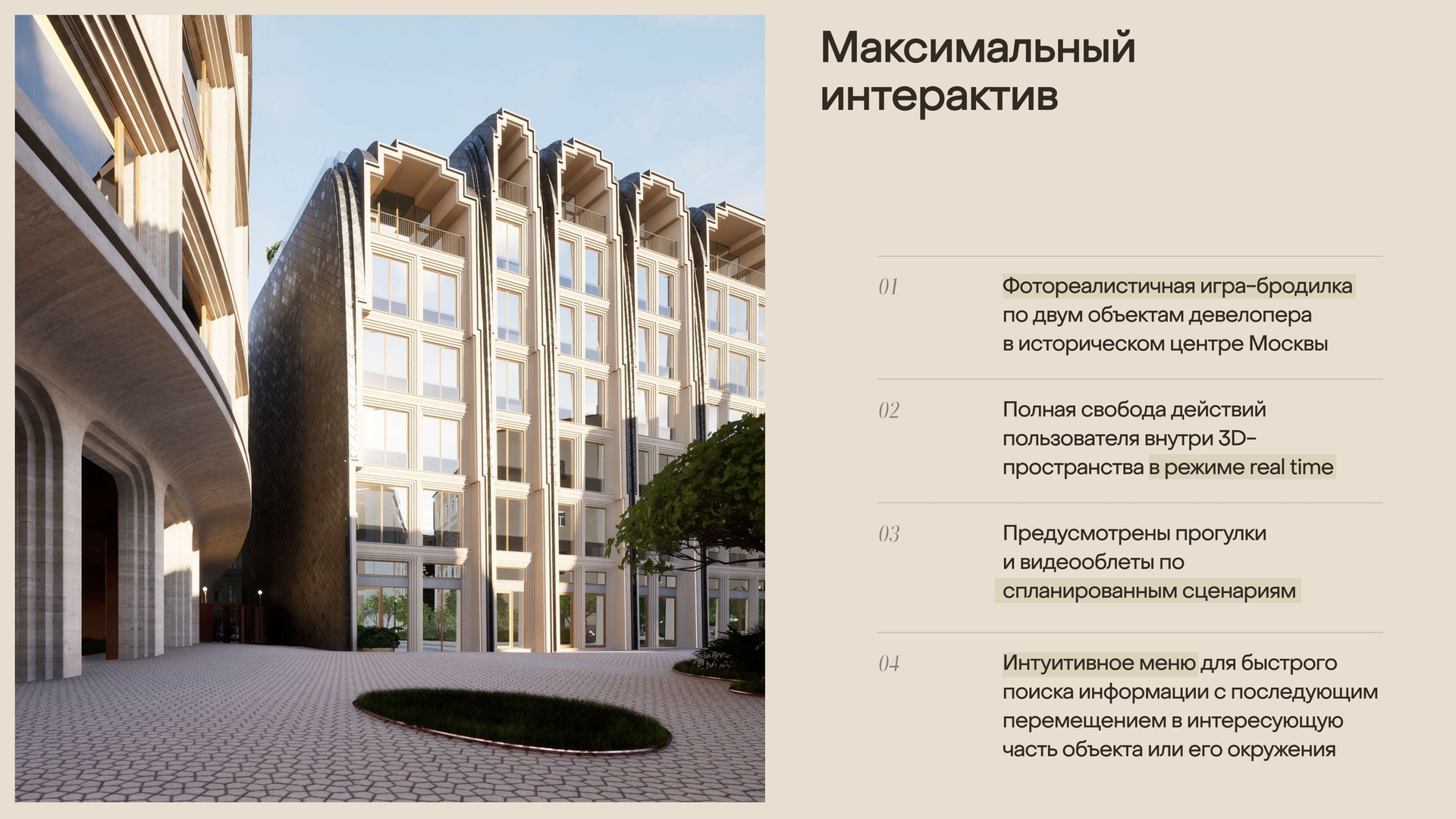 Фотореалистичная игра-бродилка по двум проектам в историческом центре Москвы предоставляет пользователю полную свободу действий внутри 3D-пространства в режиме real time. Объемное восприятие и реалистичность значительно увеличивают доверие клиента.