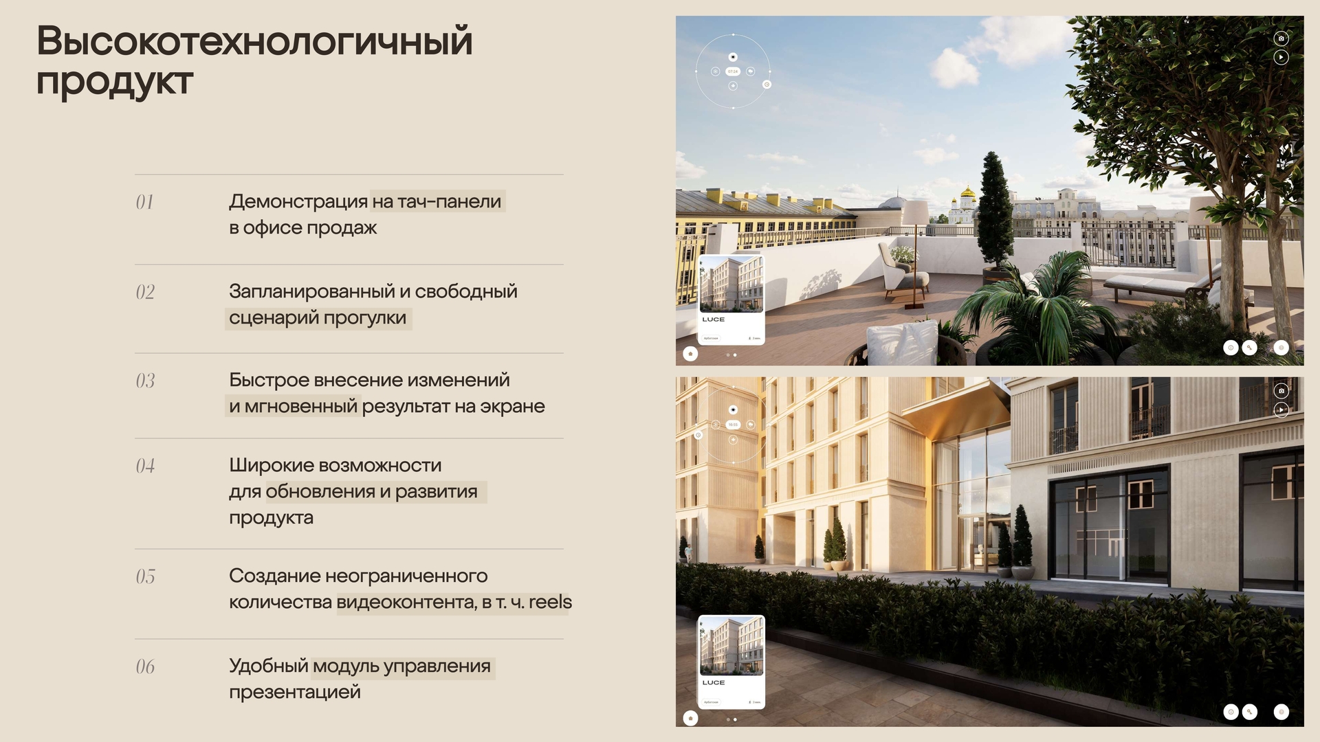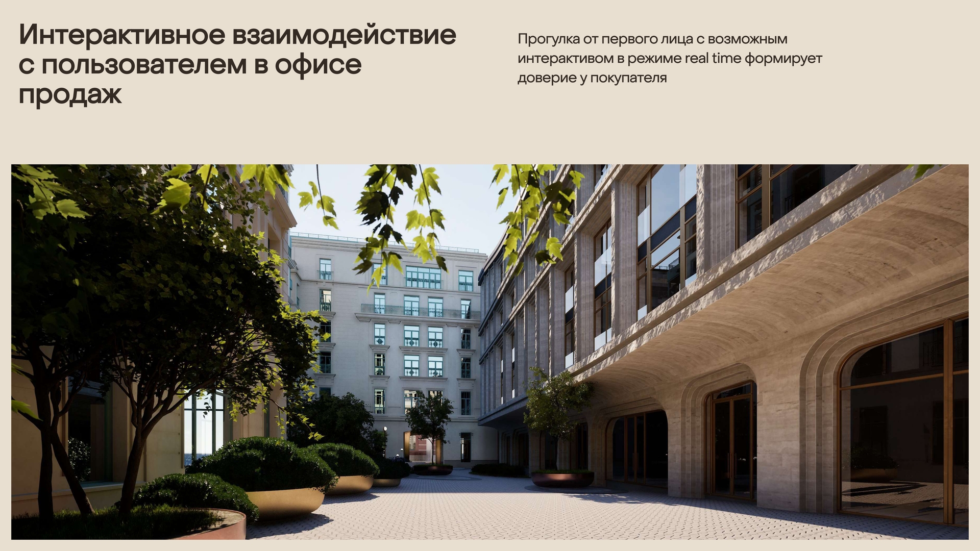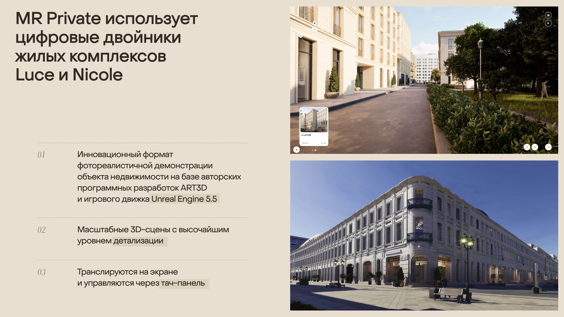 Технологичность: цифровой двойник создан на базе собственного ПО и игровой платформы Unreal Engine 5.5. Демонстрируется на экране в офисе продаж, синхронизирован с CRM-системой и управляется через тач-панель.