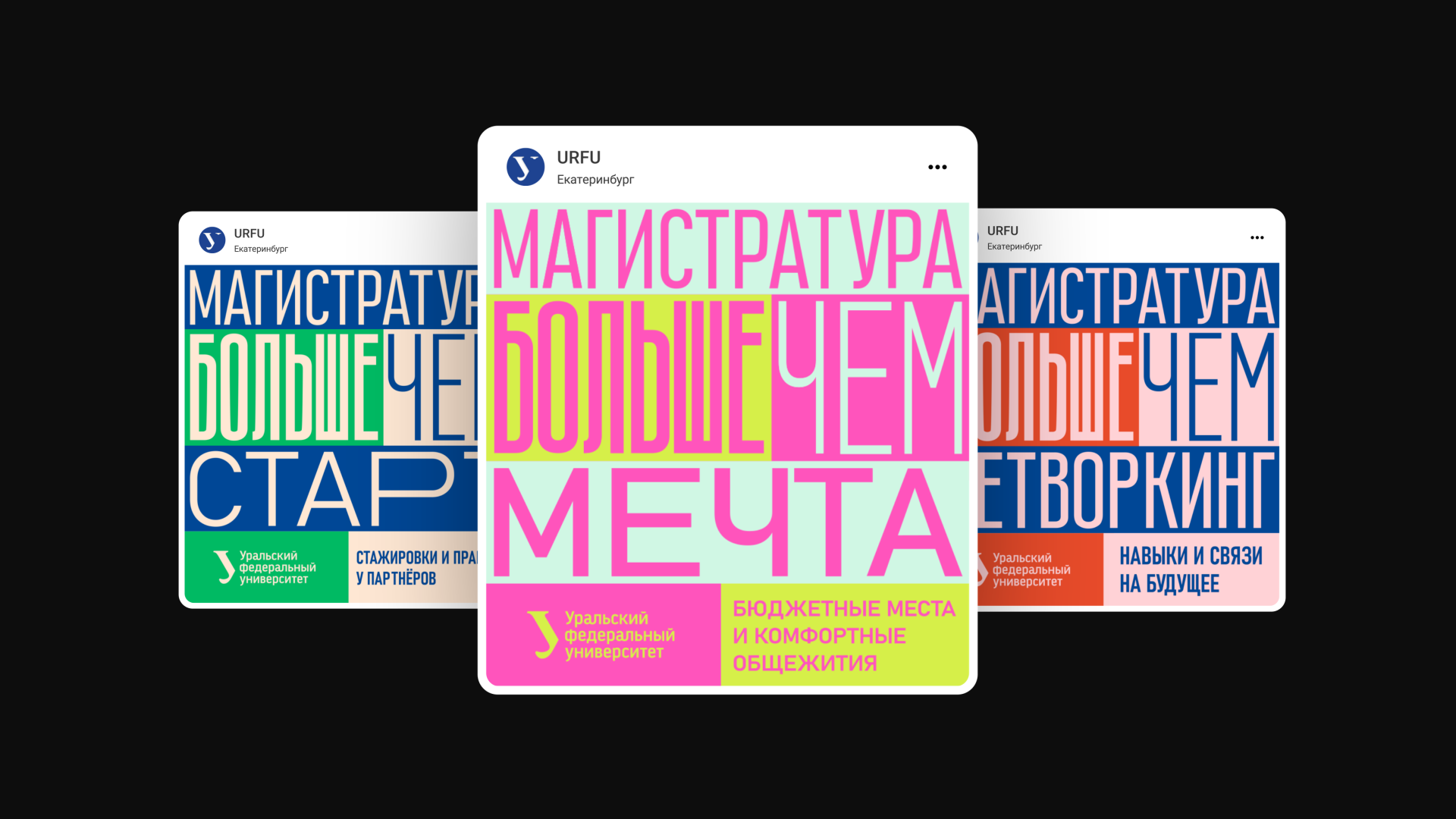 Визуальный ряд строился на смелых цветовых решениях и анимированных сообщениях, раскрывающих ключевые ценности для абитуриентов: «Мечта», «Старт», «Образование», «Нетворкинг» и «Карьера».