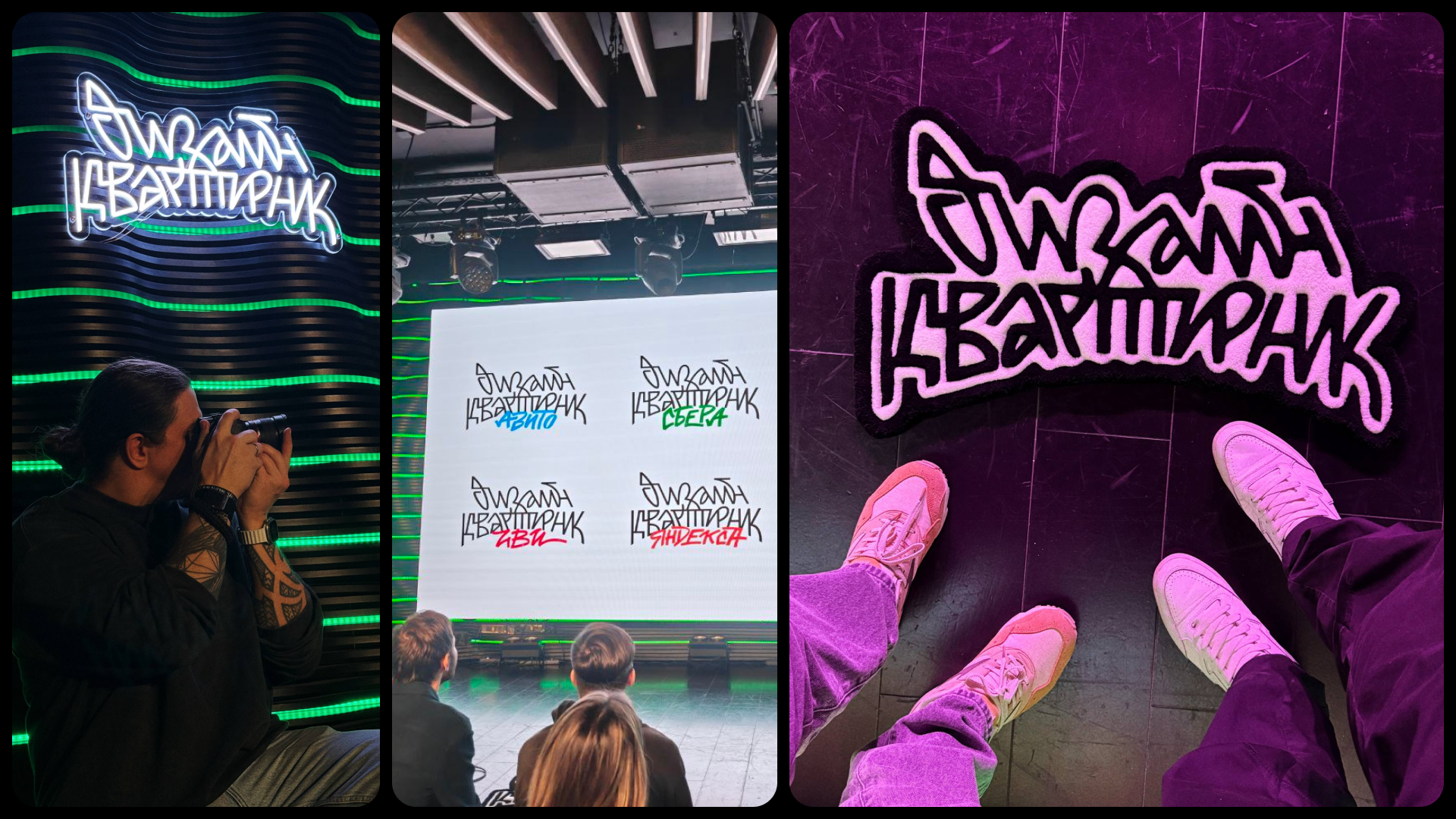 Ключевым элементом айдентики проекта стал леттеринг — нарисованная вручную композиция, которая задаёт атмосферу квартирника. Каждый следующий «квартирник» получает своё проявление леттеринга — переходящее знамя, вывеску и ковровую метку, которые визуально фиксируют уникальность события и делают его узнаваемым на рынке.