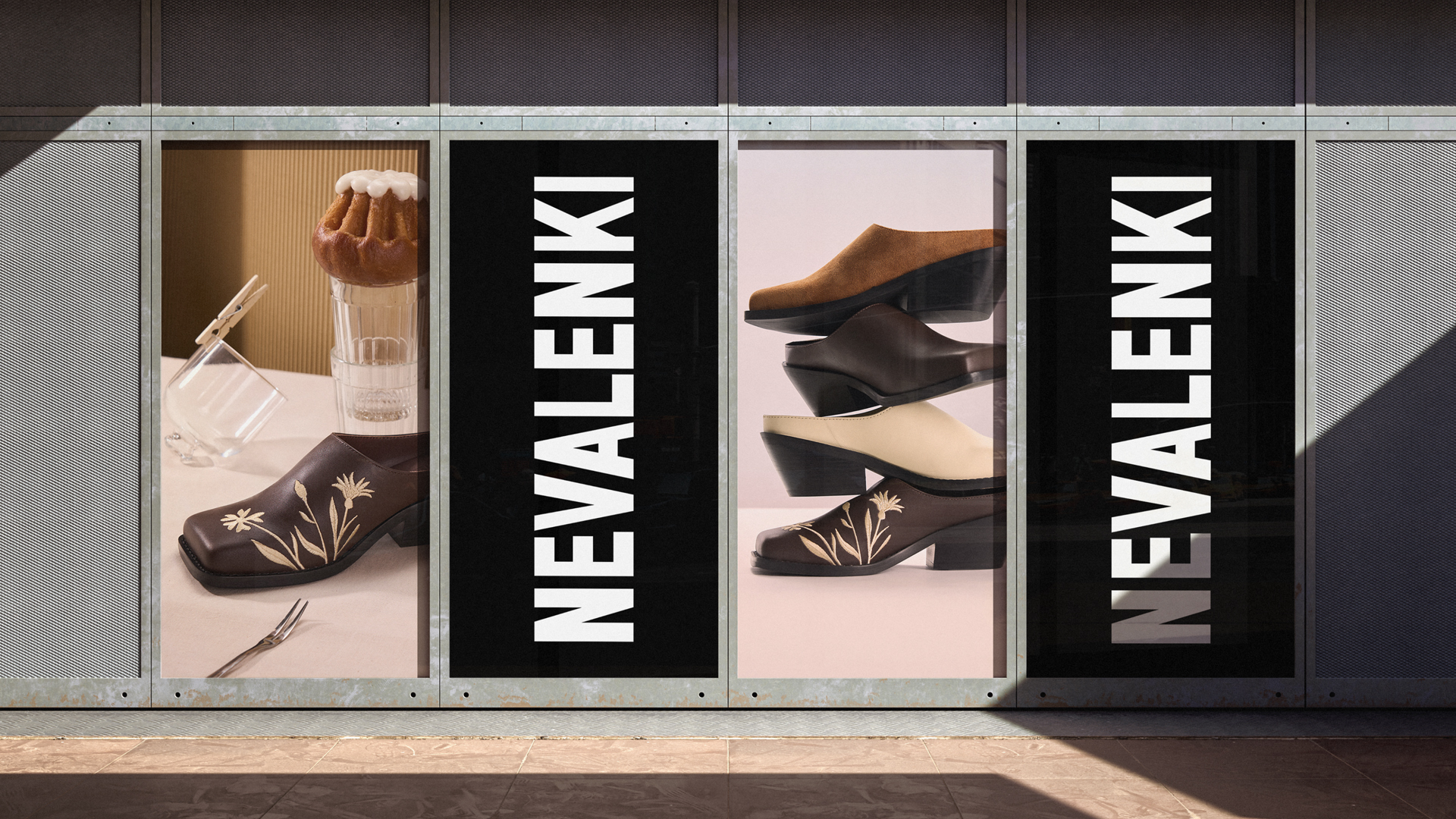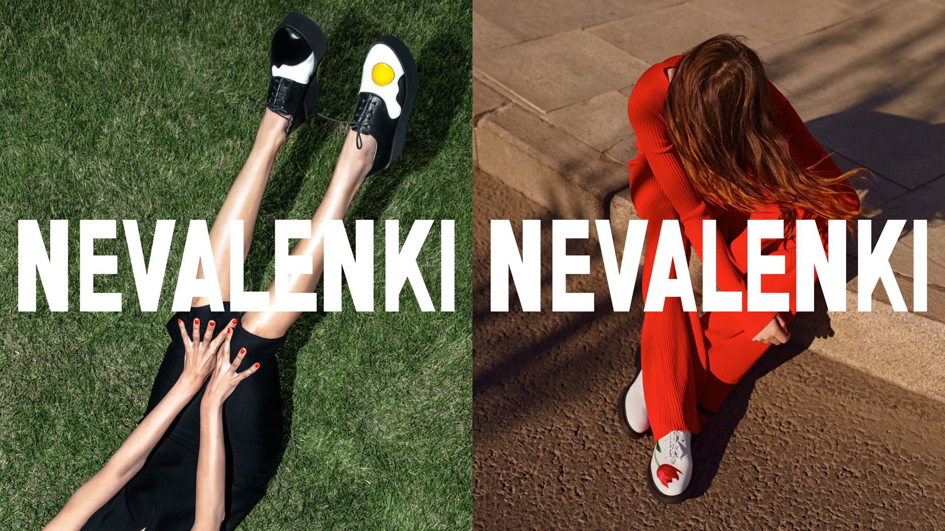 Nevalenki — это бренд яркой, смелой обуви, с асимметричной цветочной вышивкой. Он был основан в 2016 году, а к 2025 было сформулировано новое позиционирование: это обувь для тех, кому надоела обычная обувь, кто не боится выделиться из толпы и кто не лишен чувства юмора. Новый логотип точнее соответствует обновленному характеру бренда. В строгих узких буквах есть определенный привкус моды. При этом обратный контраст делает его непохожим на других: в этом проявляется смелость, динамика и любовь к асимметрии. Внутри слова появляется странное движение, которое сразу обращает на себя внимание. Привычные формы, но в необычном ракурсе. В презентации использованы фотографии Полины Твердой и Ольги Погореловой