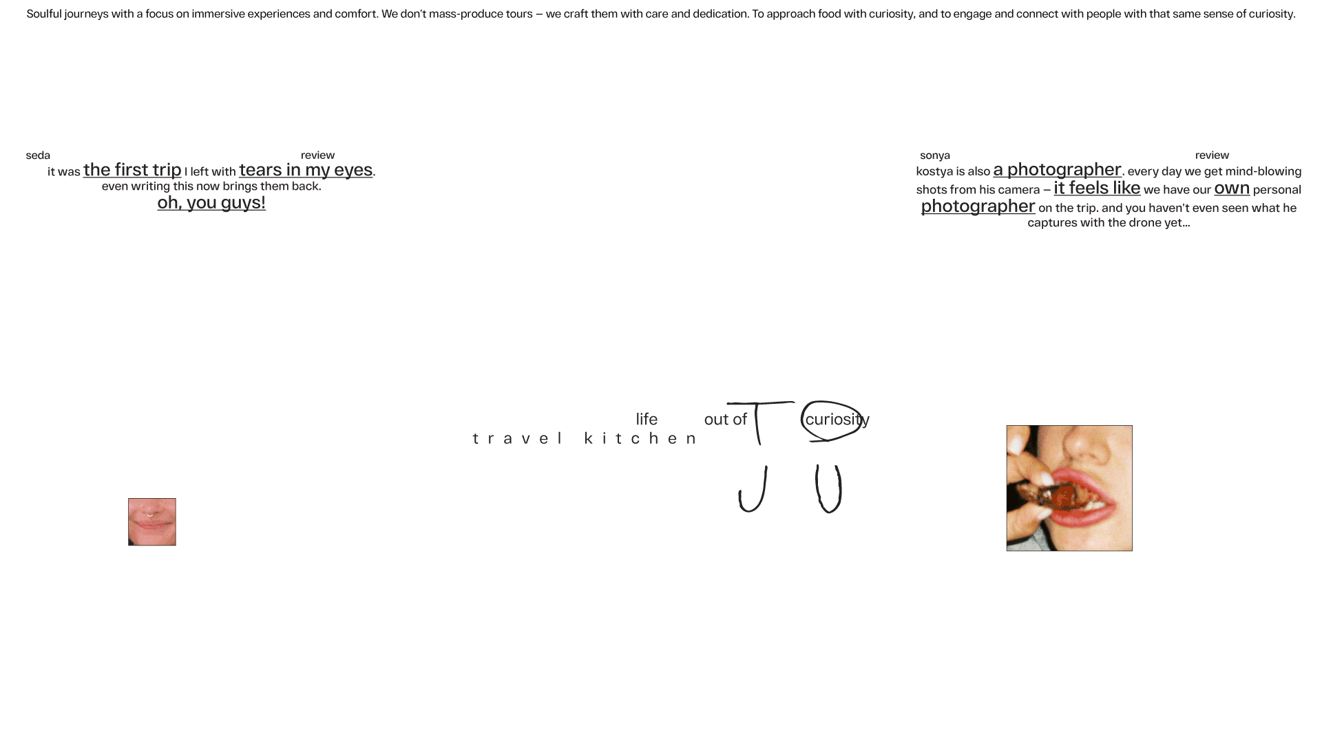 Ключевое сообщение проекта — «жизнь из любопытства». Это способ исследовать мир на чувственном уровне: пробовать, чувствовать, впитывать, смотреть с интересом, как ребёнок, впервые познающий мир на вкус. Эта идея выражена и в логотипе — фотографии рта основательницы проекта, которые «произносят» название to ju. Они символизируют орган чувств, через который мы познаём жизнь — едим, говорим, смеёмся, удивляемся. Рты становятся образом живого диалога с миром, открытого, искреннего и душевного.