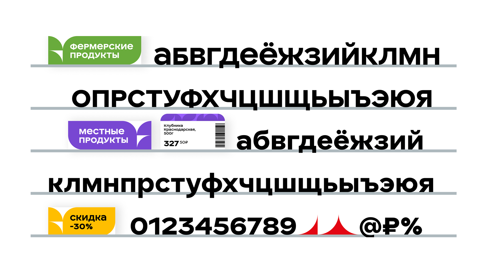 Для оформления всех торговых точек сети мы задизайнили Магнитус — дружелюбный неогротеск, наполненный интересными и свежими деталями. Прямо как товары в супермаркете!