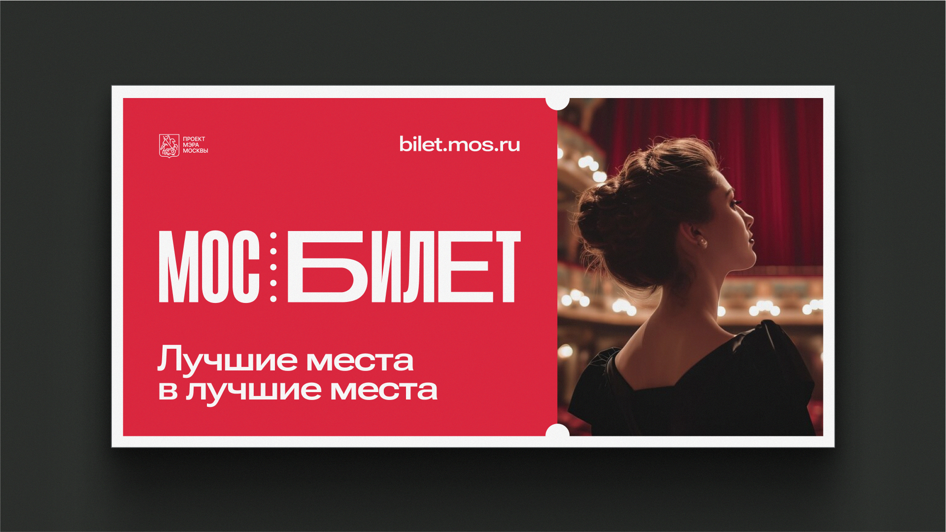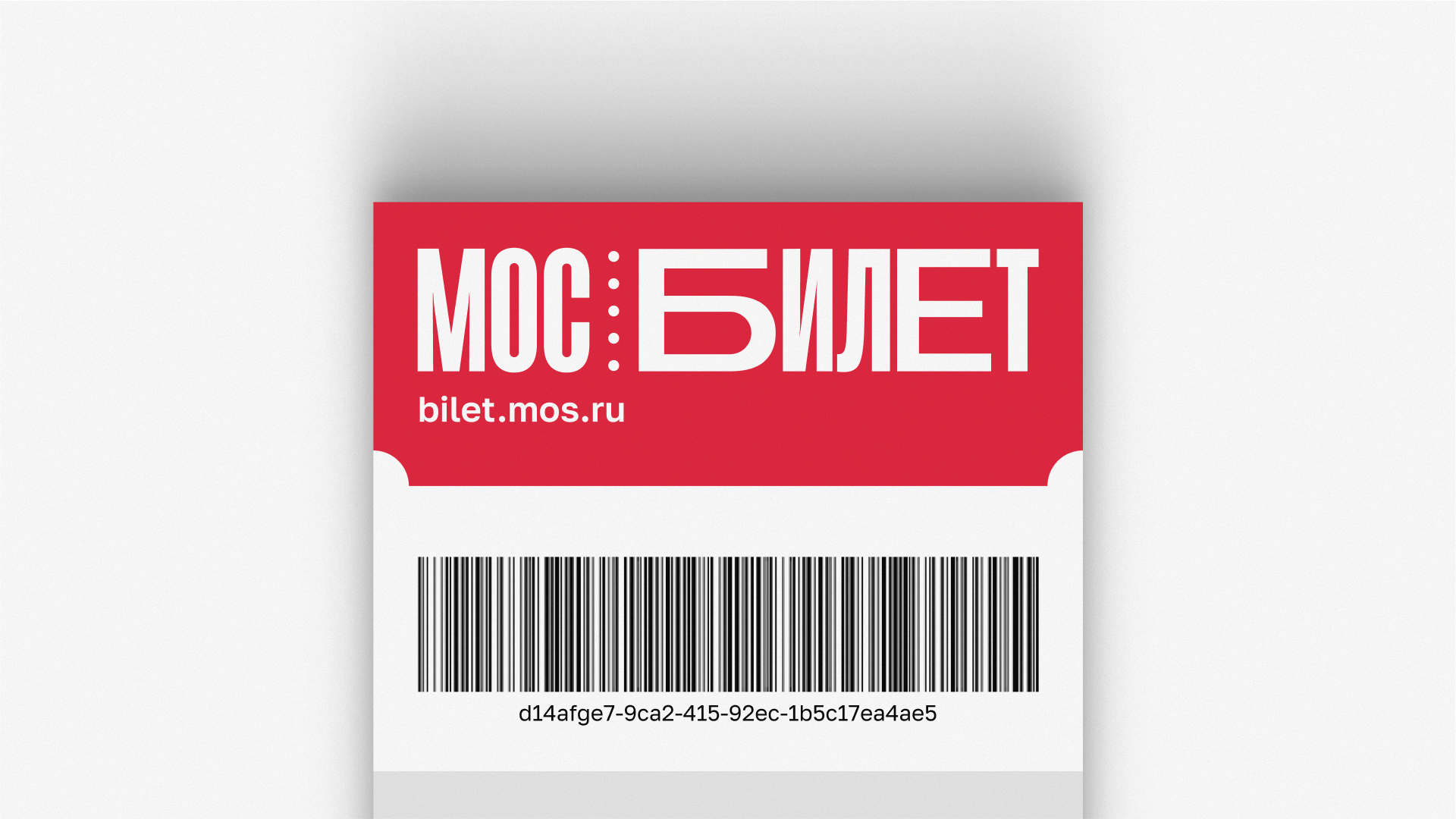 Логотип построен по принципу настоящего билета. Левая часть символизирует корешок — компактные, вытянутые, максимально плотные буквы «МОС». Правая часть — «тело» билета, с более широкими буквами «БИЛЕТ», передающими разнообразие культурных направлений и масштаб событий. Между ними — пунктирный разделитель, отсылающий к линии перфорации на отрывной части билета. Этот приём стал смысловым центром логотипа.