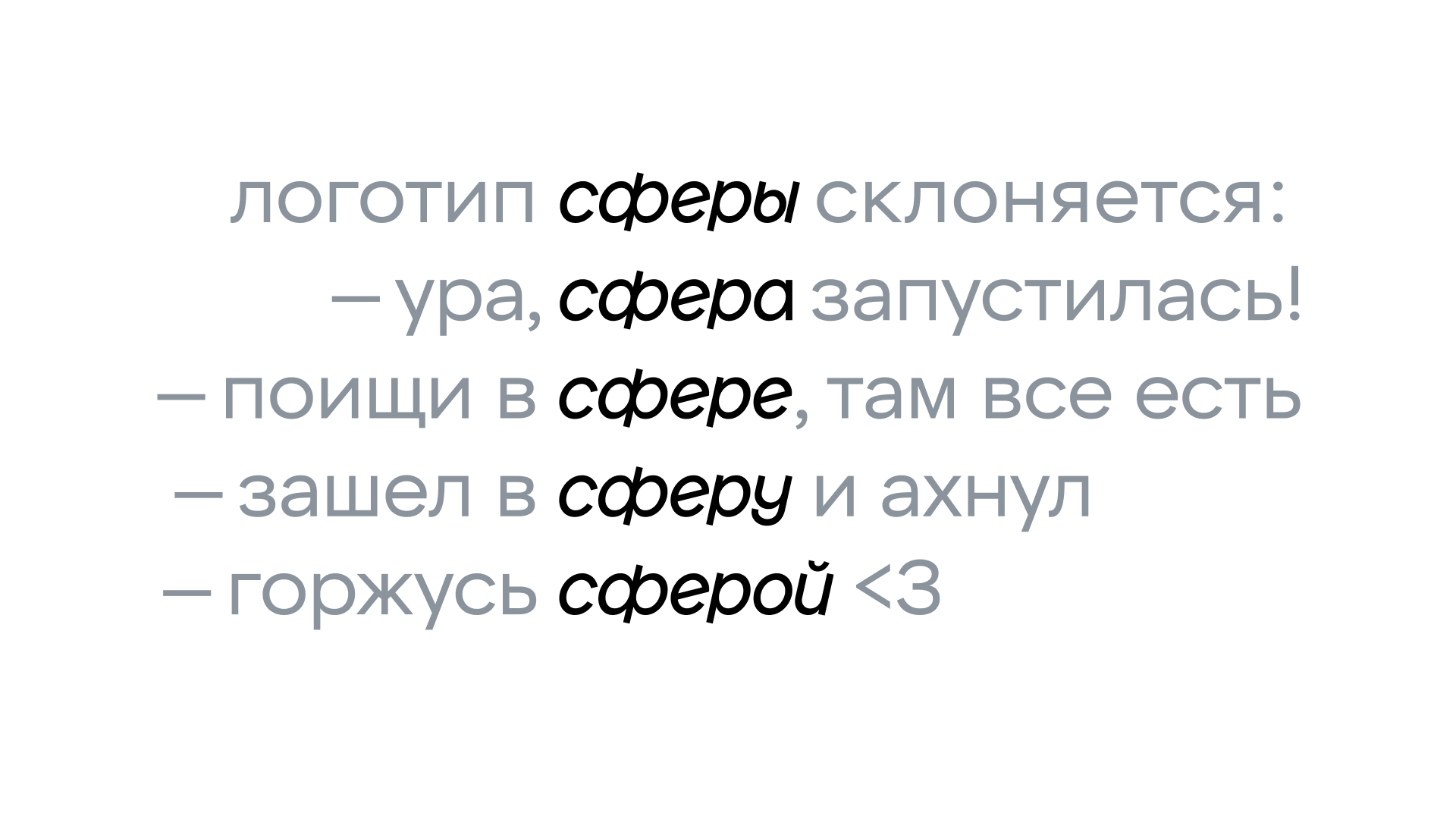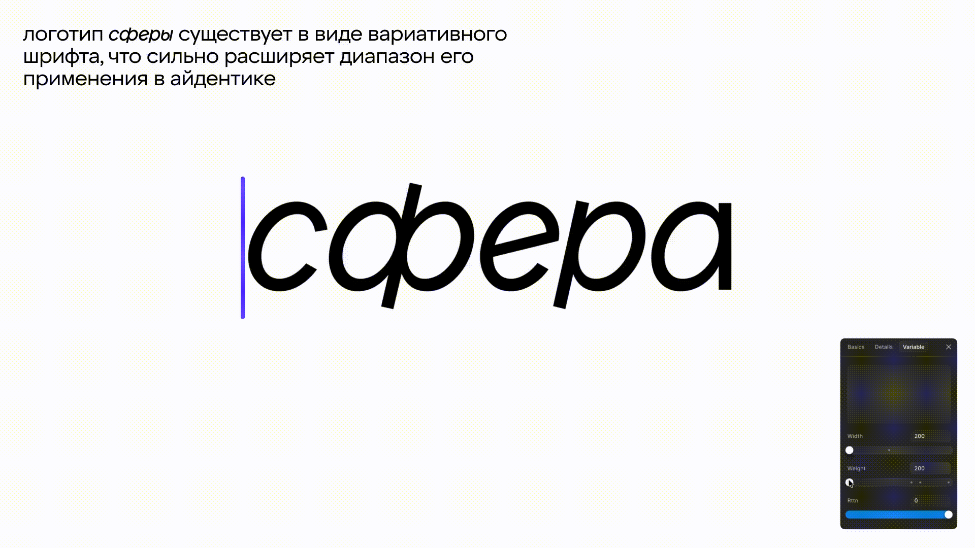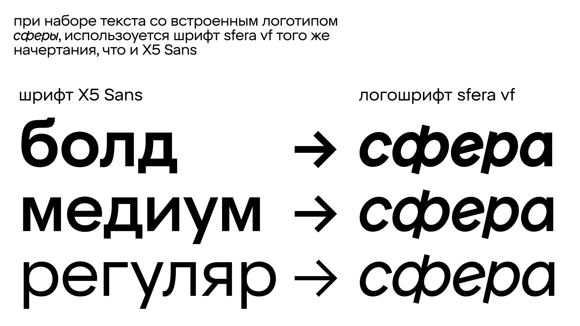 Логотип существует как вариативный шрифт sfera vf, который работает в паре с фирменным шрифтом X5 Sans. Благодаря тому, что логотип умеет склоняться, он органично встраивается в текстовые блоки, сохраняя ритм строки, что расширяет диапазон его использования в айдентике.