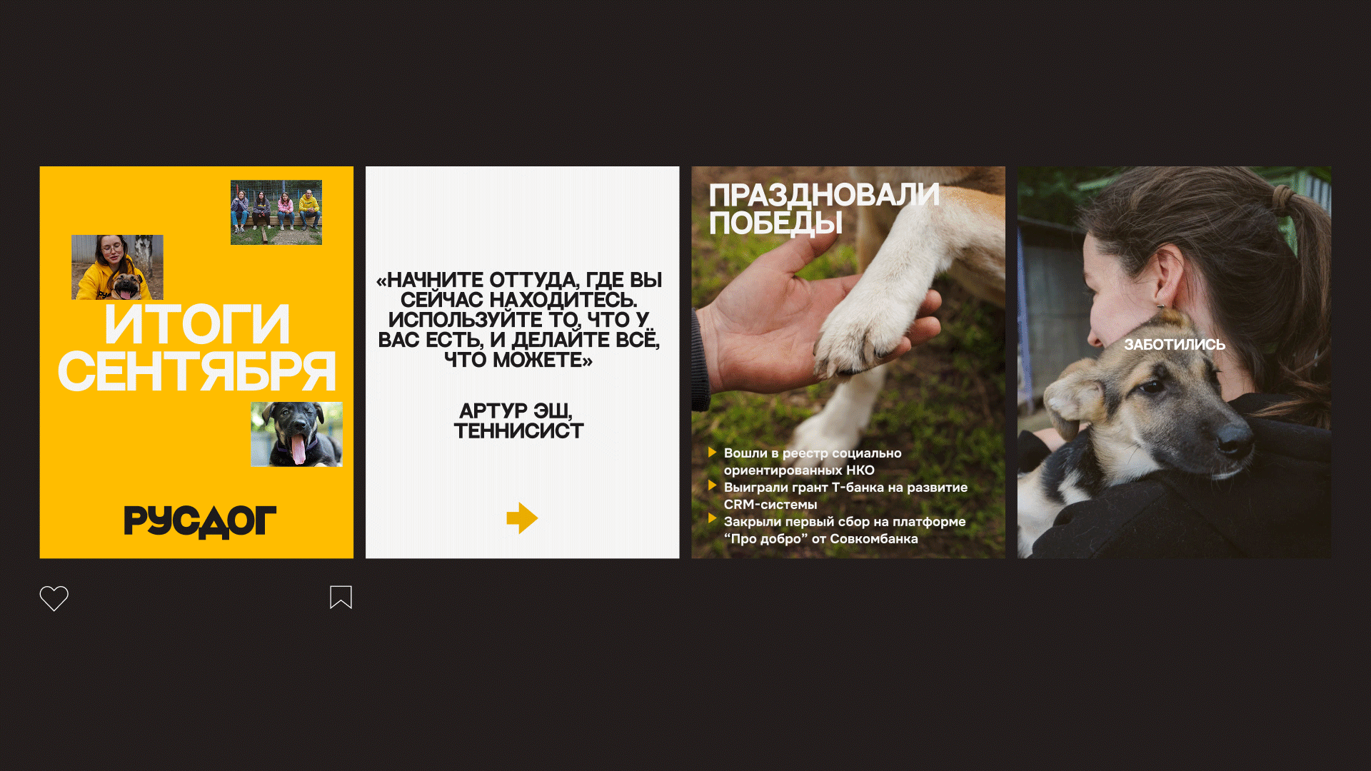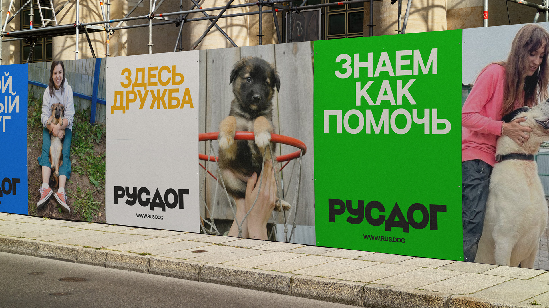 Айдентика строится на контрасте угловатых форм и "тёплого" текста/фото/видео, создающем искреннюю интонацию. Простые композиции, чуть грубоватый лого и шрифт, жизнерадостные цвета передают атмосферу доброжелательности и честности. Стиль легко воспроизводим силами команды (без дизайнера), живёт в соцсетях и на одежде волонтёров, помогая РУСДОГ звучать искренне и по-настоящему
