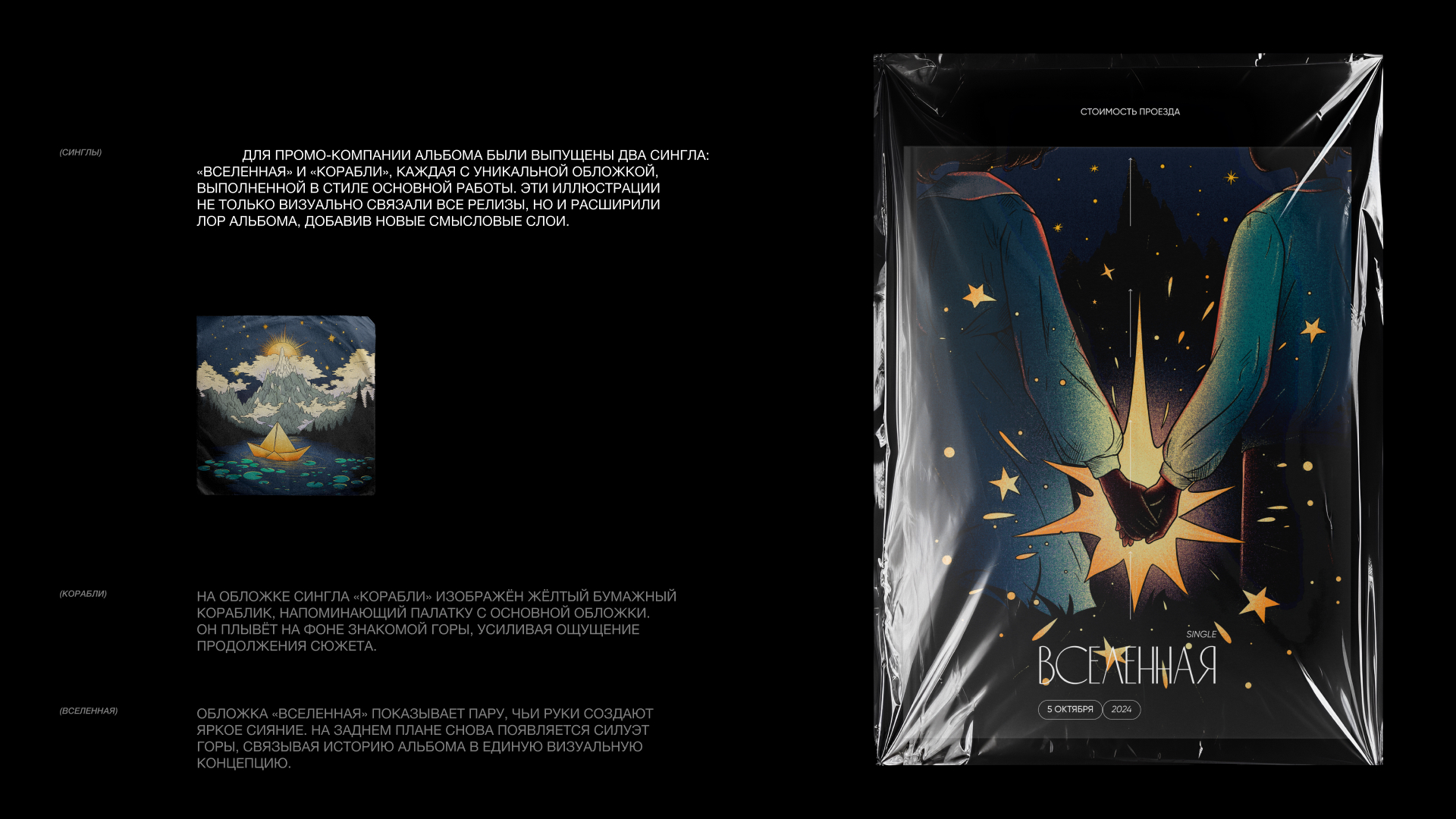 Проект объединяет музыку и визуальный стиль в многослойную вселенную, где каждый элемент — от звука до печатного носителя — создаёт единый опыт восприятия альбома.