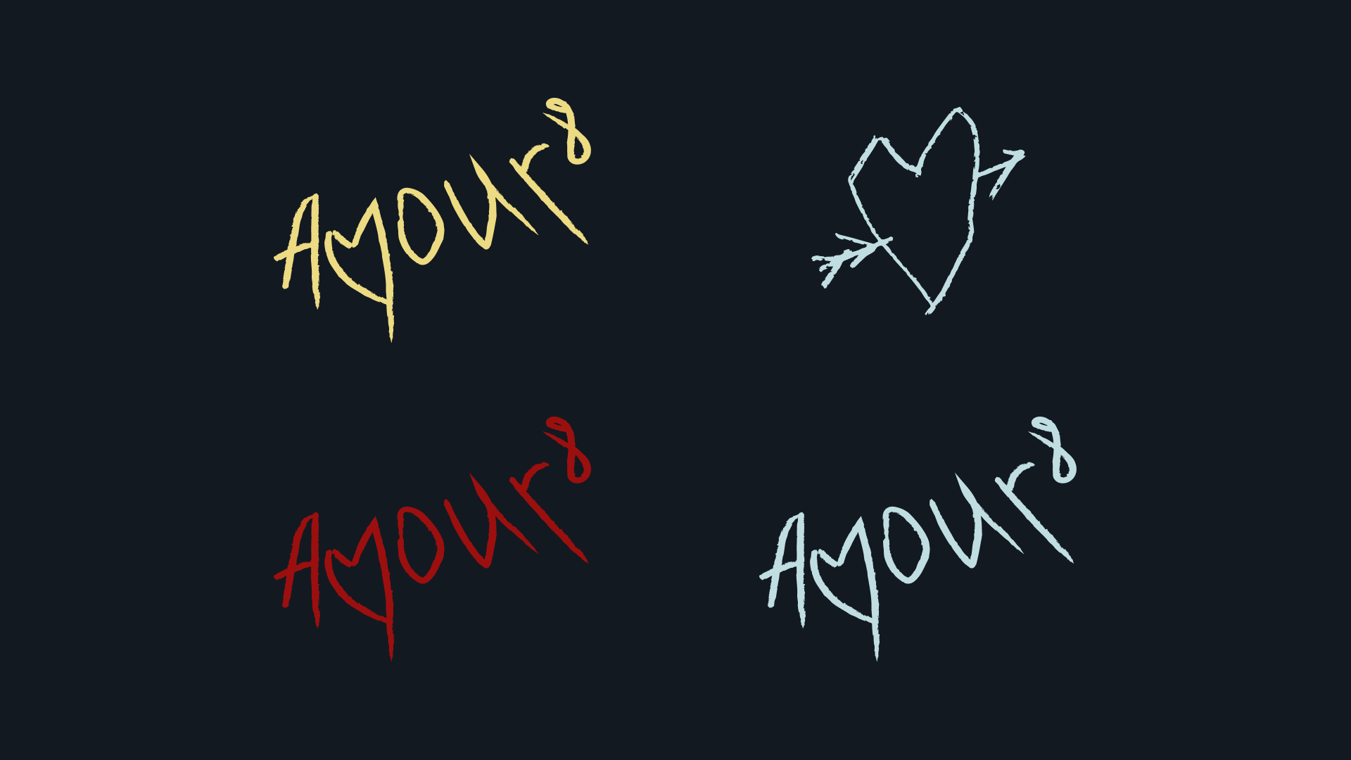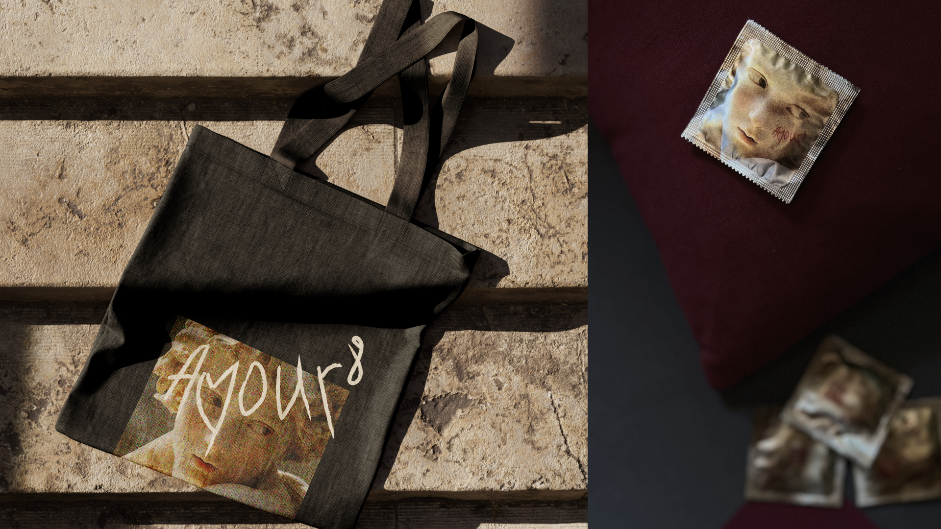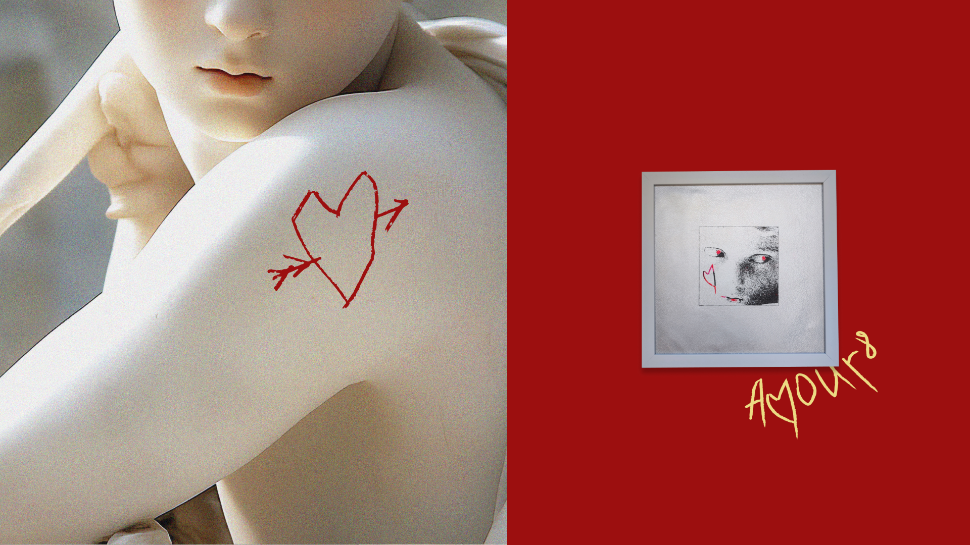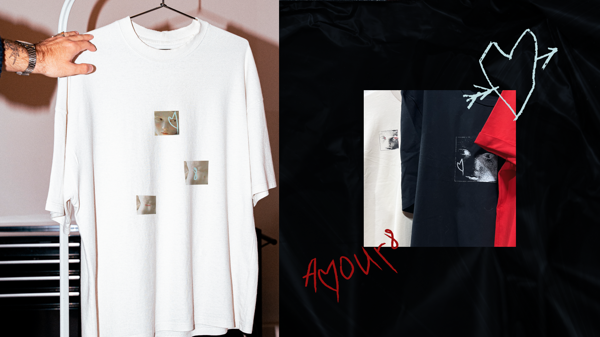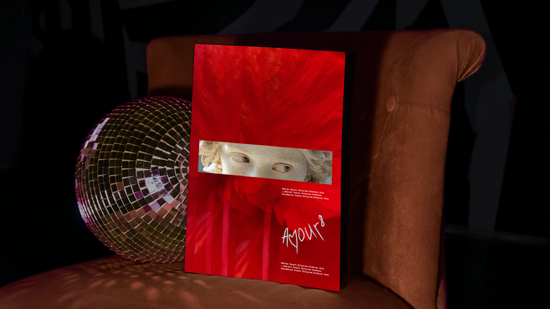 Рукописное AMOUR8, как граффити или кровавое признание, передаёт ощущение бунта, уязвимости и интимности. Резкий, нервный почерк противопоставляется машинописному шрифту. Надменные амурчики разработаны совместно с ИИ, специально для этого проекта.