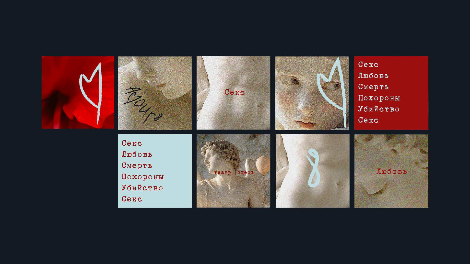 AMOUR8 говорит о табуированных и вечных темах общества. Это разговор о правде тела и темных сторонах культуры, о том, что скрыто под красивыми фасадами и мраморными масками. Любовь = вечность. Эстетика одновременно эротическая и отталкивающая. Спектакли театра затрагивают острые социальные темы, такие, как зависимости (12 шагов), права женщин (Амур и Психея), права человека (Падучая Собака).