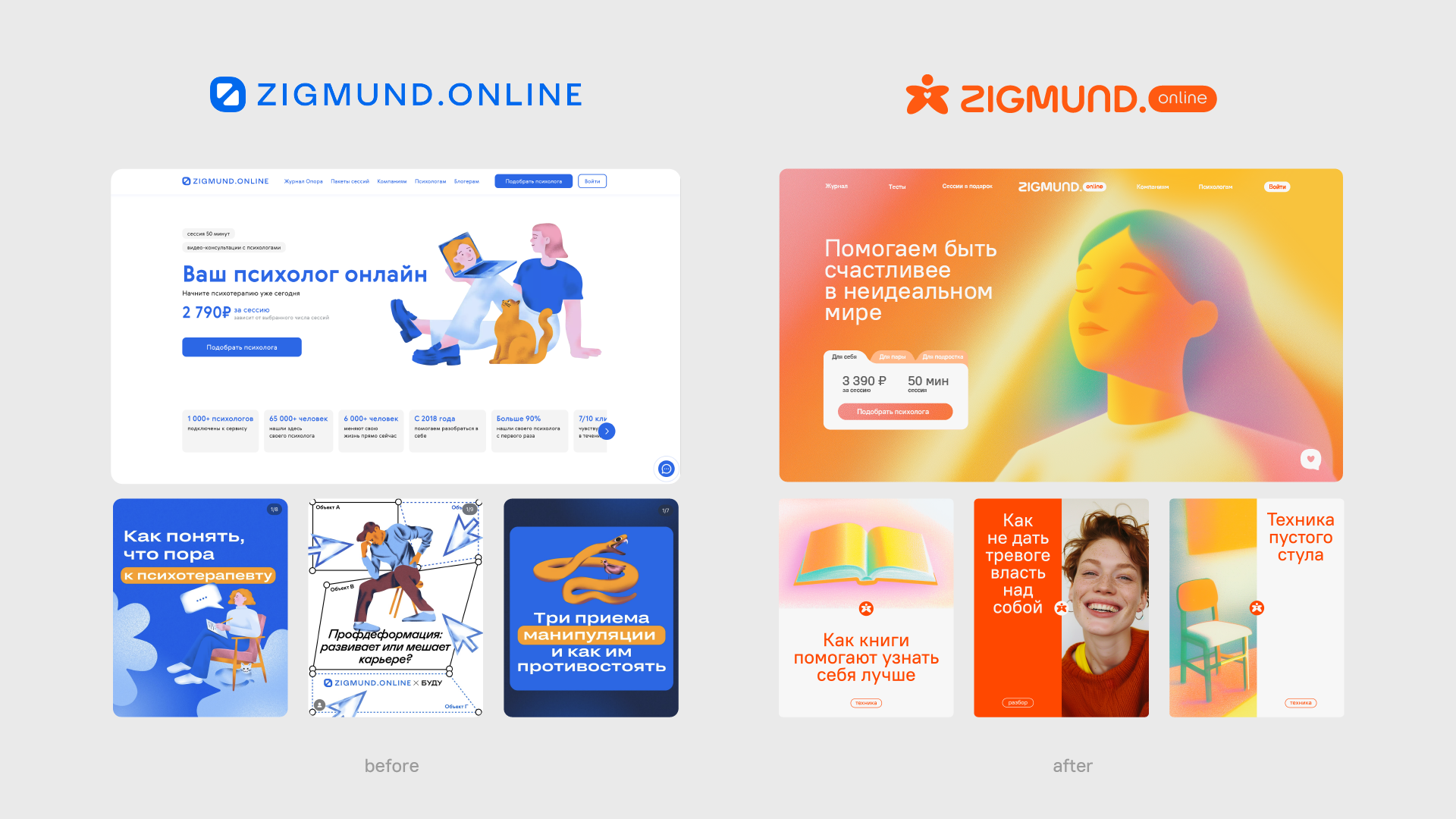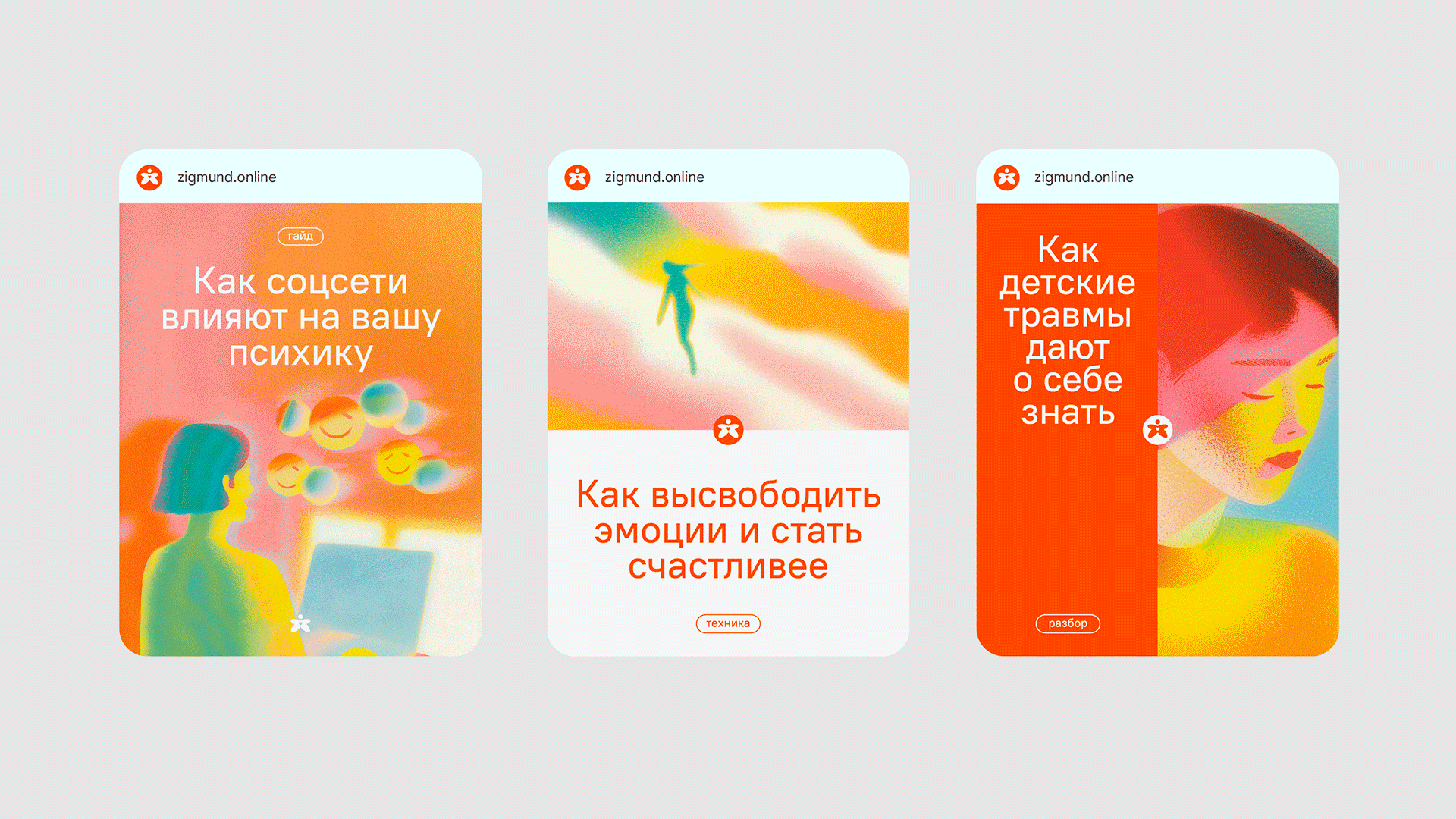 В наше тревожное время особенно важно, чтобы сервис, связанный с ментальным здоровьем, не казался отстранённым и холодным, а наоборот — вызывал доверие, тепло и ощущение поддержки. Мы переосмыслили визуальный стиль Zigmund.online, чтобы он стал проще, человечнее и ближе к каждому. Холодный синий цвет уступил место тёплому оранжевому. Строгий логотип заменил человечек с раскрытыми руками — символ заботы, участия и открытости. Новый визуальный язык говорит не о дистанции, а о том, что здесь вас действительно слышат и готовы помочь. Мы также создали новую иллюстративную систему с помощью нейросетей. Благодаря этому бренд теперь может быстро и последовательно создавать нужные образы — от фоновых паттернов до персонажей, сохраняя цельность и узнаваемость. Такой подход делает визуальный контент гибким, адаптивным и готовым к масштабированию. Новая айдентика легко работает в любых форматах — на сайте, в социальных сетях, в наружной рекламе и печатных материалах. Zigmund стал не просто онлайн-сервисом, а тёплым и понятным пространством, где каждому рады.