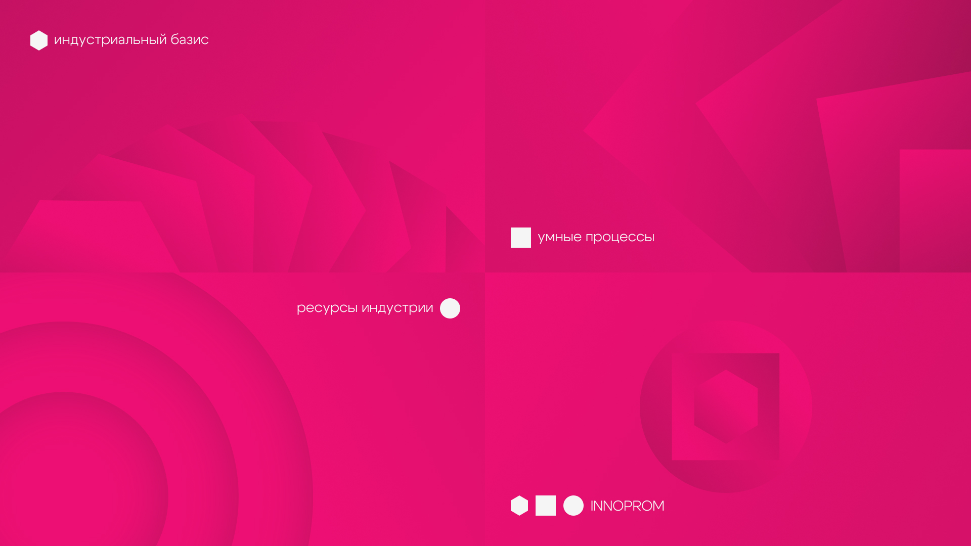 Объединяет ключевые смыслы бренда и выставки. Взаимодействие квадрата, круга и шестиугольника символизирует интеграцию, стратегическое мышление и целостность экосистемы INNOPROM.