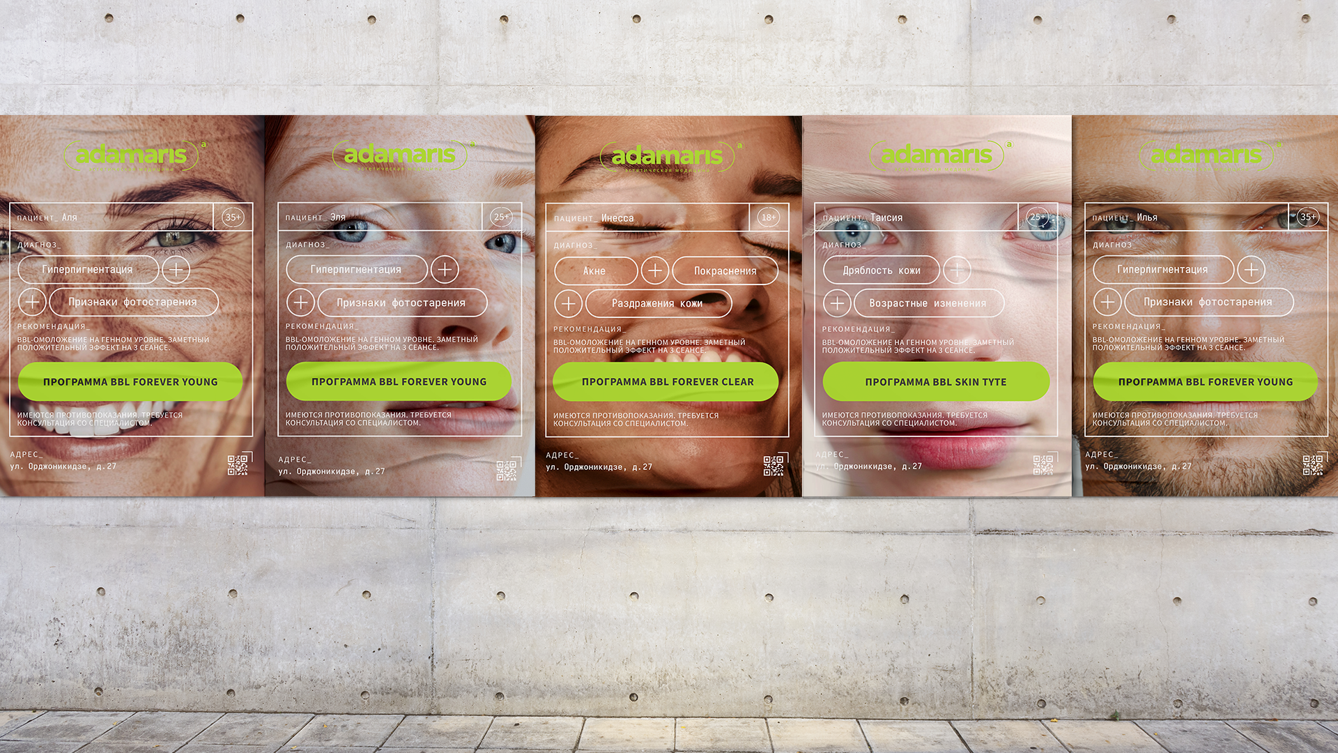 Ключевой элемент айдентики — ампула «Адамарис», символ технологичности и научного совершенства. Она отсылает к медицинской точности и визуально рифмуется с формой фирменных скобок, связывая все элементы в единую визуальную экосистему.