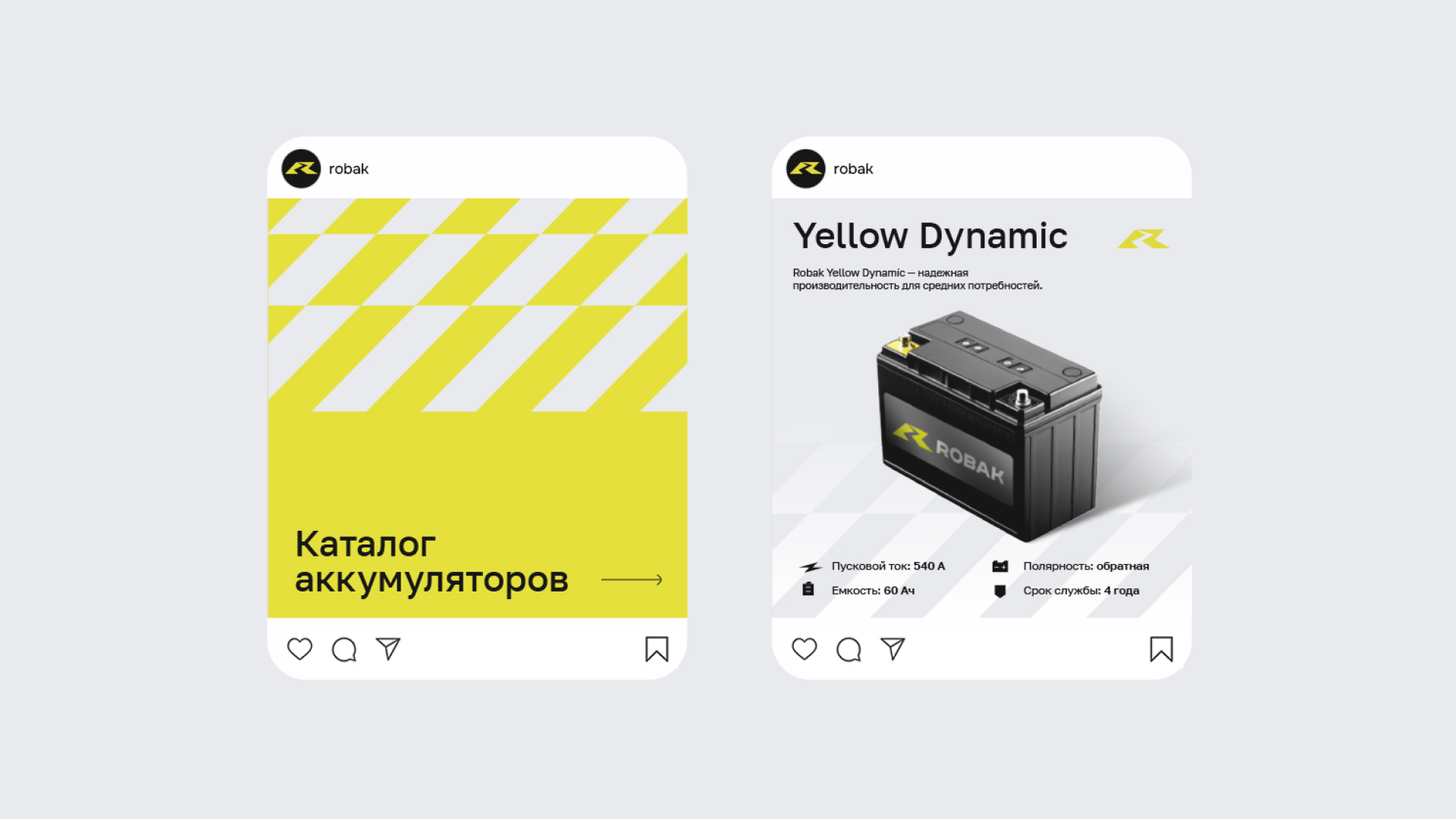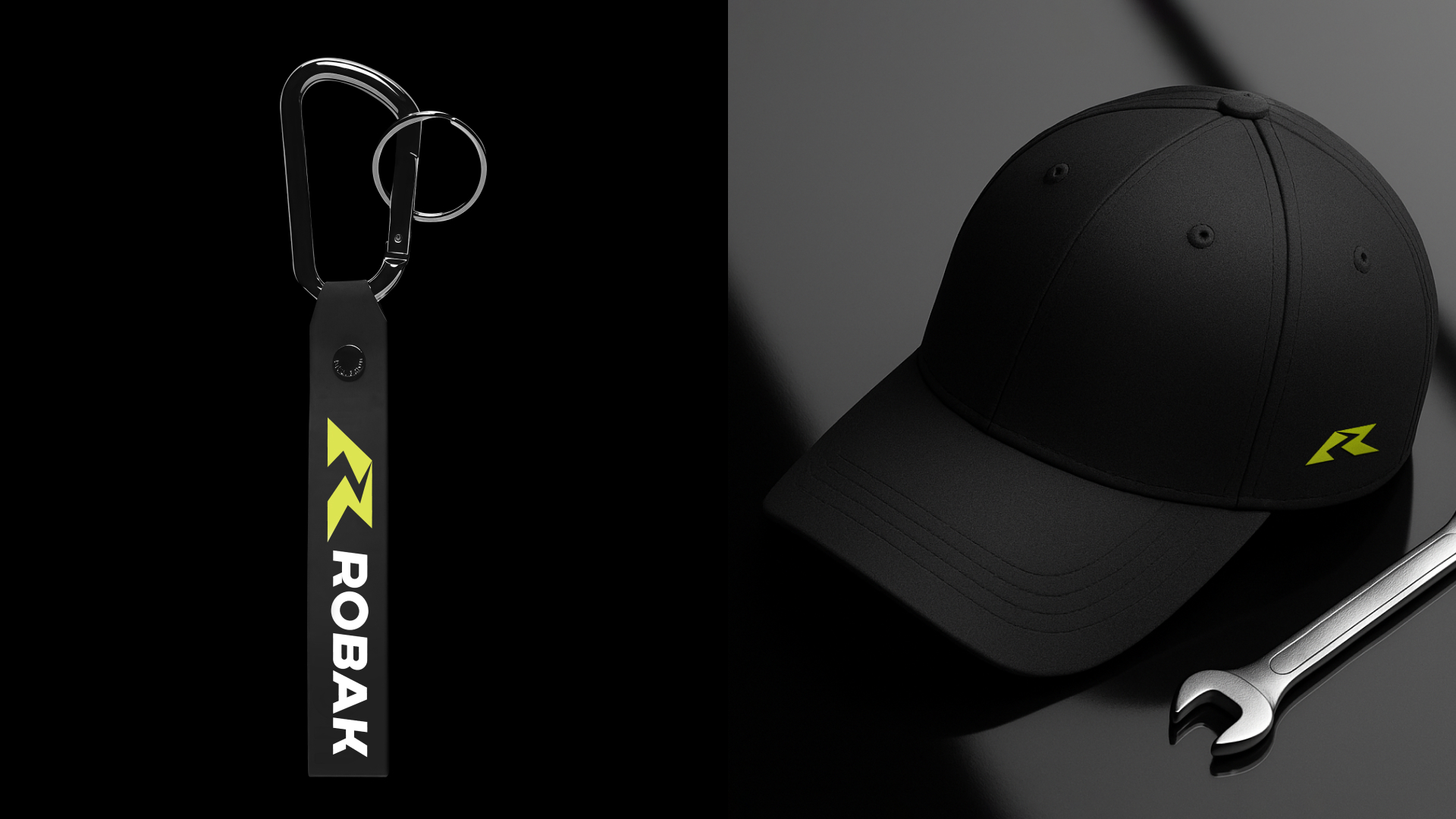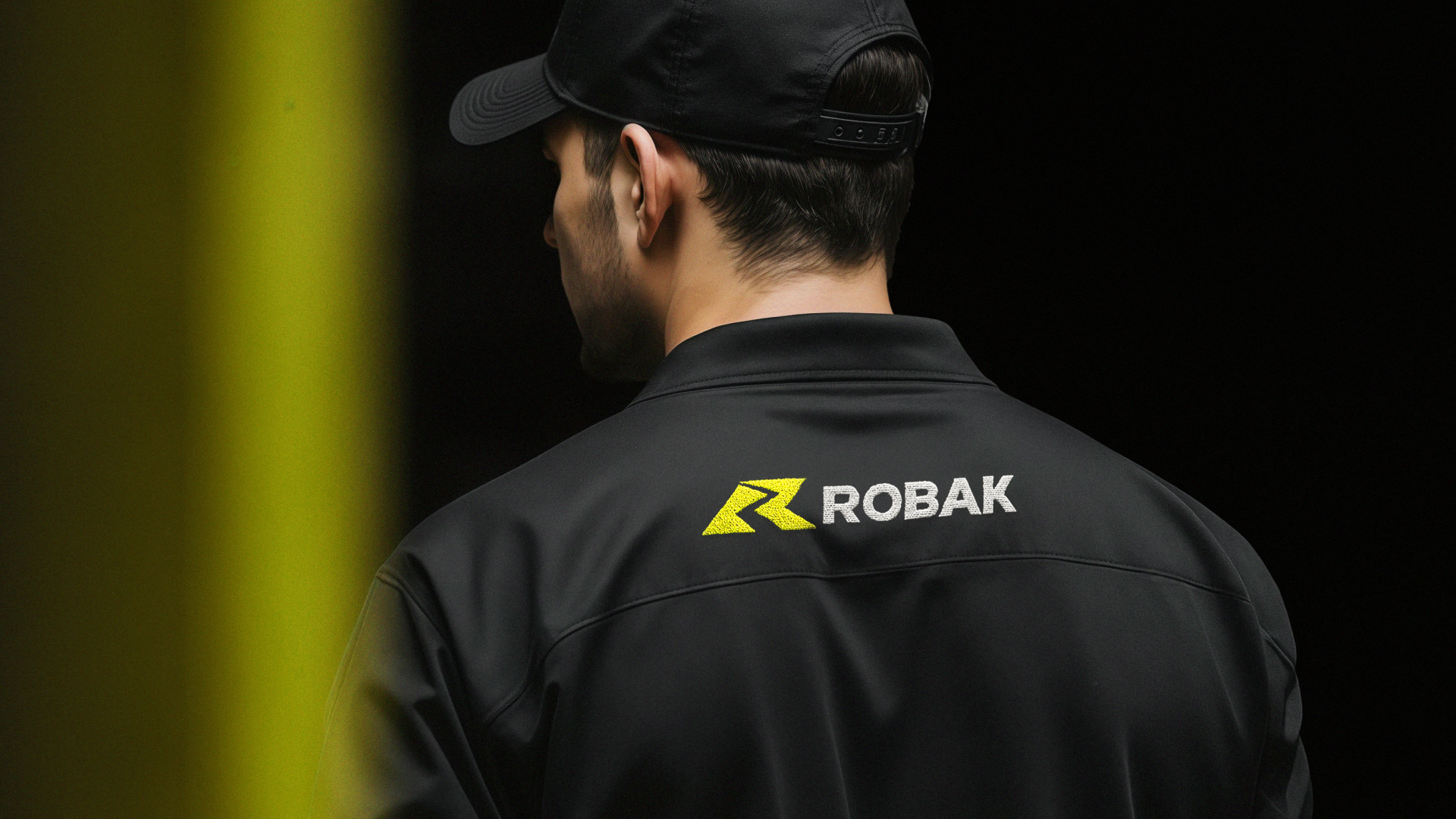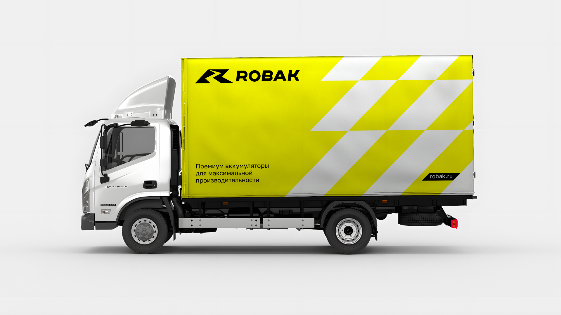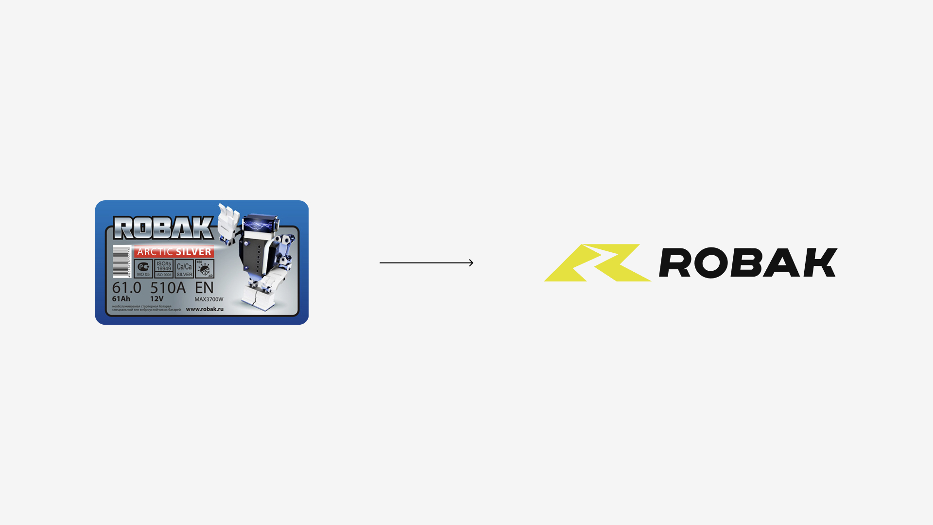 Символ объединяет несколько смыслов: буква «R» отражает название Robak, молния передаёт принцип работы аккумулятора и идею мгновенного запуска, а силуэт дороги подчёркивает динамику бренда. Специально разработанное шрифтовое начертание усиливает технологичный и премиальный характер.