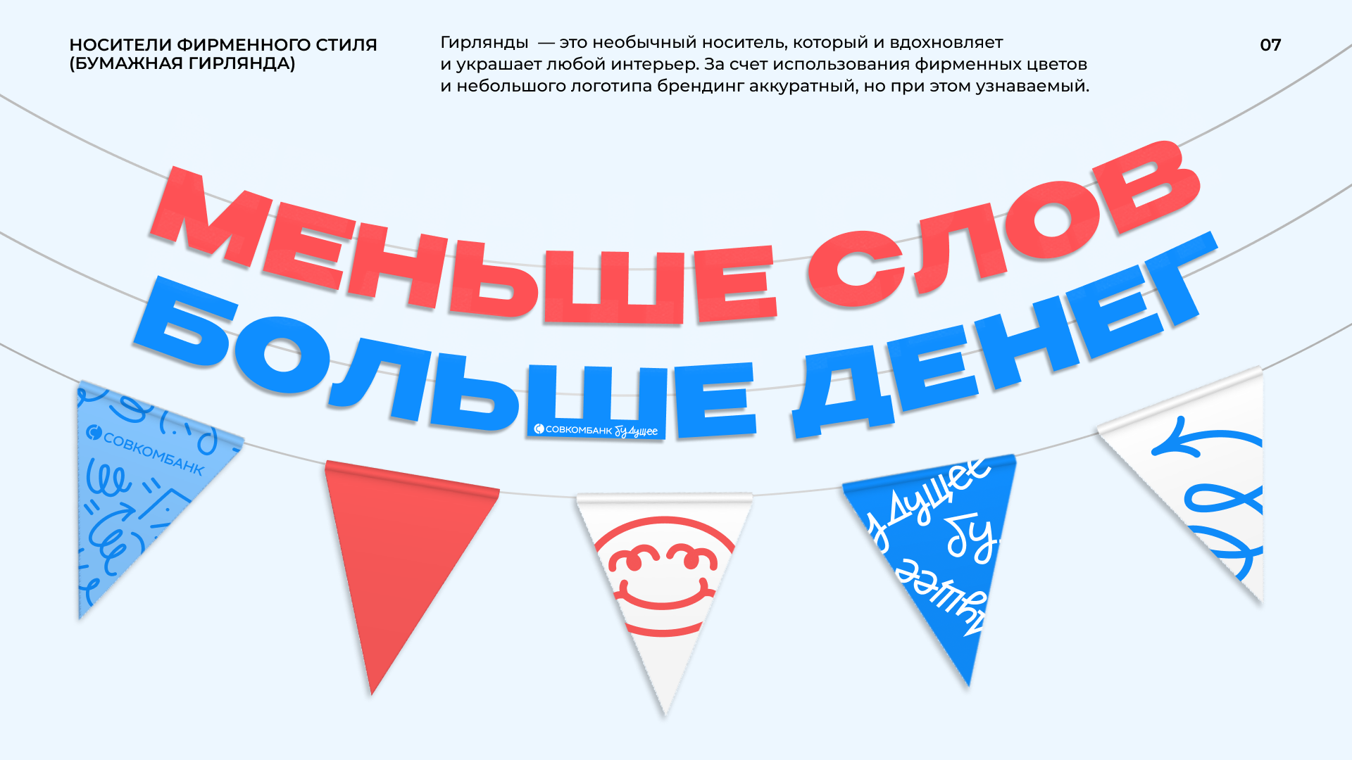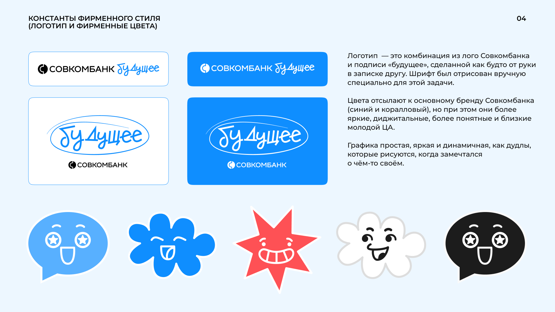 Для этого мы полностью обновили фирменный стиль, сделали его ярким, дружелюбным и трендовым: внедрили сочное сочетание голубого и кораллового, которое отсылает к основным цветам Совкомбанка, отрисовали кастомный шрифт (как будто начерченный от руки) специально под этот проект, добавили графические элементы, похожие на рисунки-дудлы, и дружелюбных персонажей, с которыми хочется общаться.
