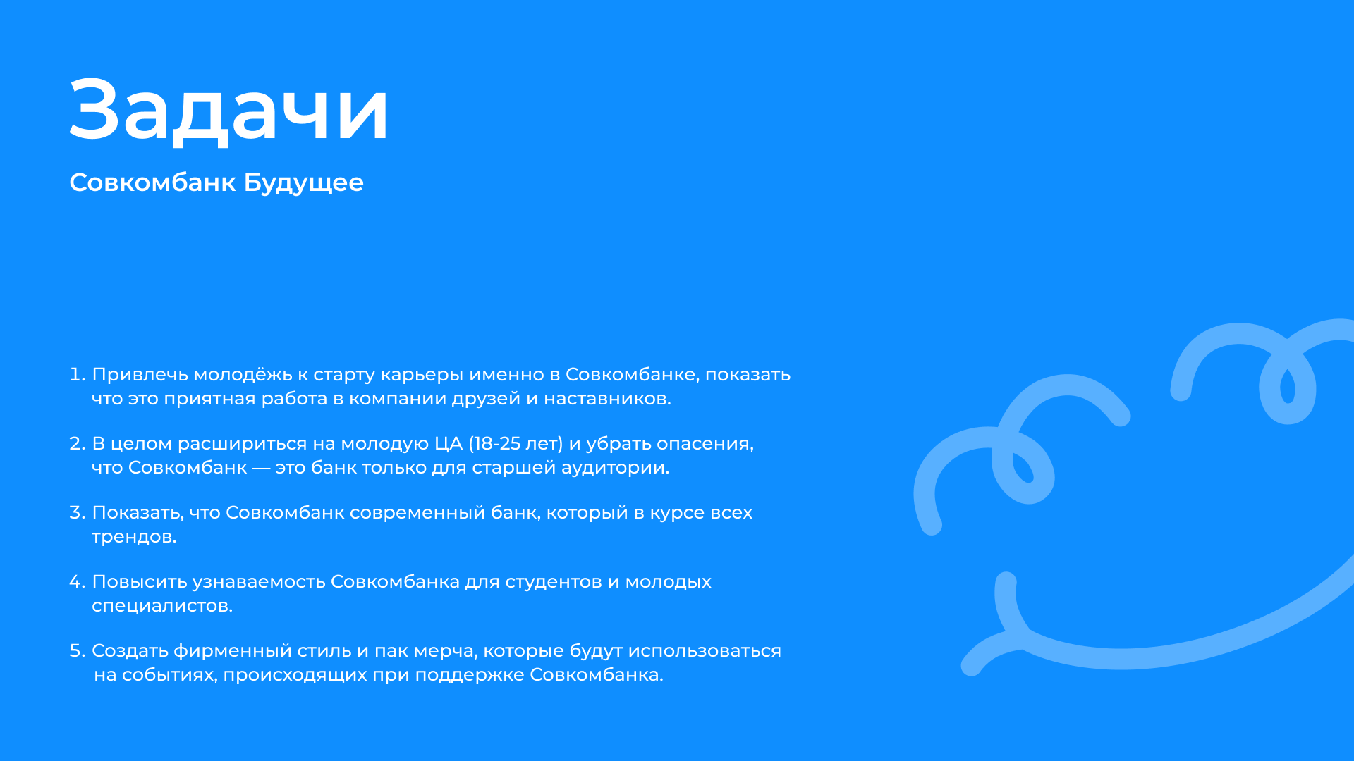Мы хотели привлечь молодую аудиторию (до 25 лет) к старту карьеры в Совкомбанке, показать, что это приятная работа в компании друзей и наставников, а также рассказать о том, что Совкомбанк современный банк, который в курсе всех трендов.