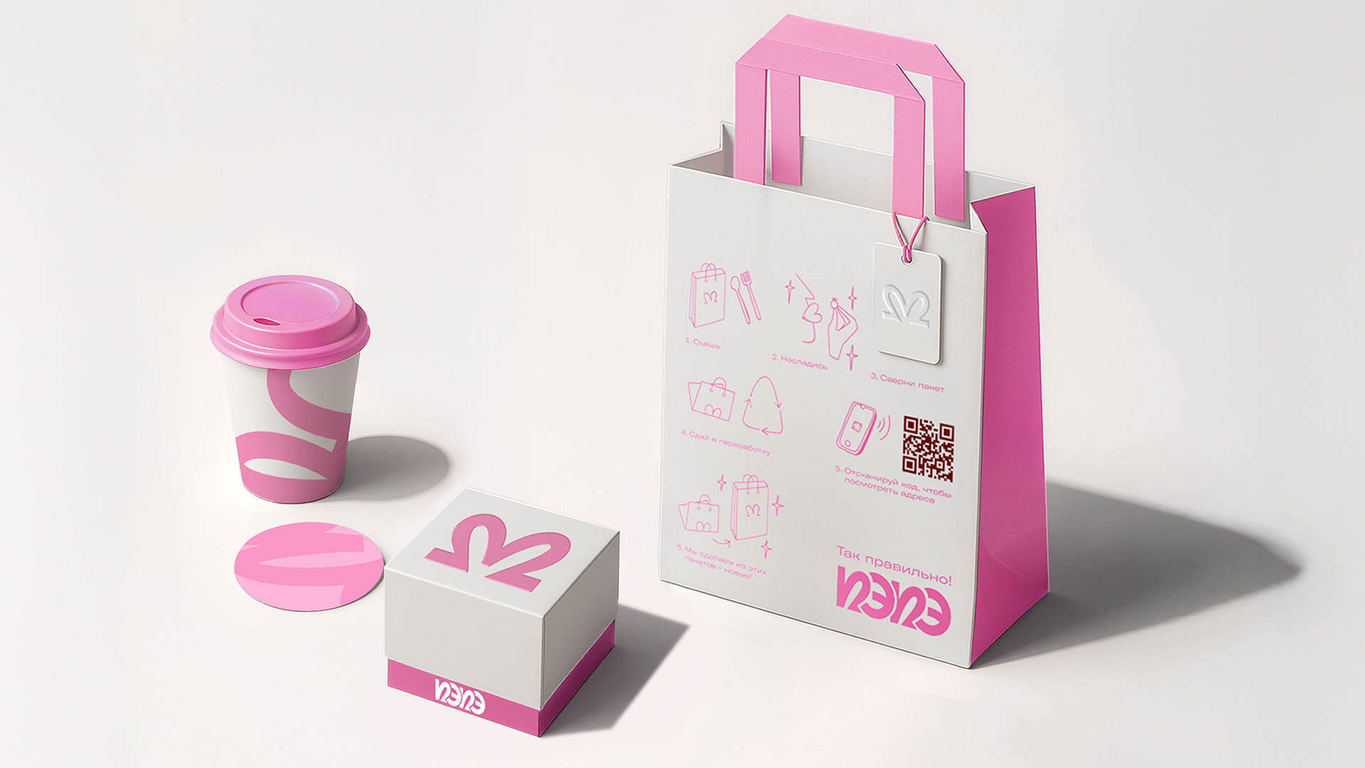 Что ещё? Кастом-шрифт на основе пластики логотипа, продуманная упаковка (от стаканчиков до мисок для собак), мерч как новый билборд, навигация, фотозоны, гайд оформления деловой документации, смм-гайд и крейзи-фешн фотостиль. Всё сведено в 100-страничный брендбук, который позволяет франчайзи расширять визуальную систему без потерь.