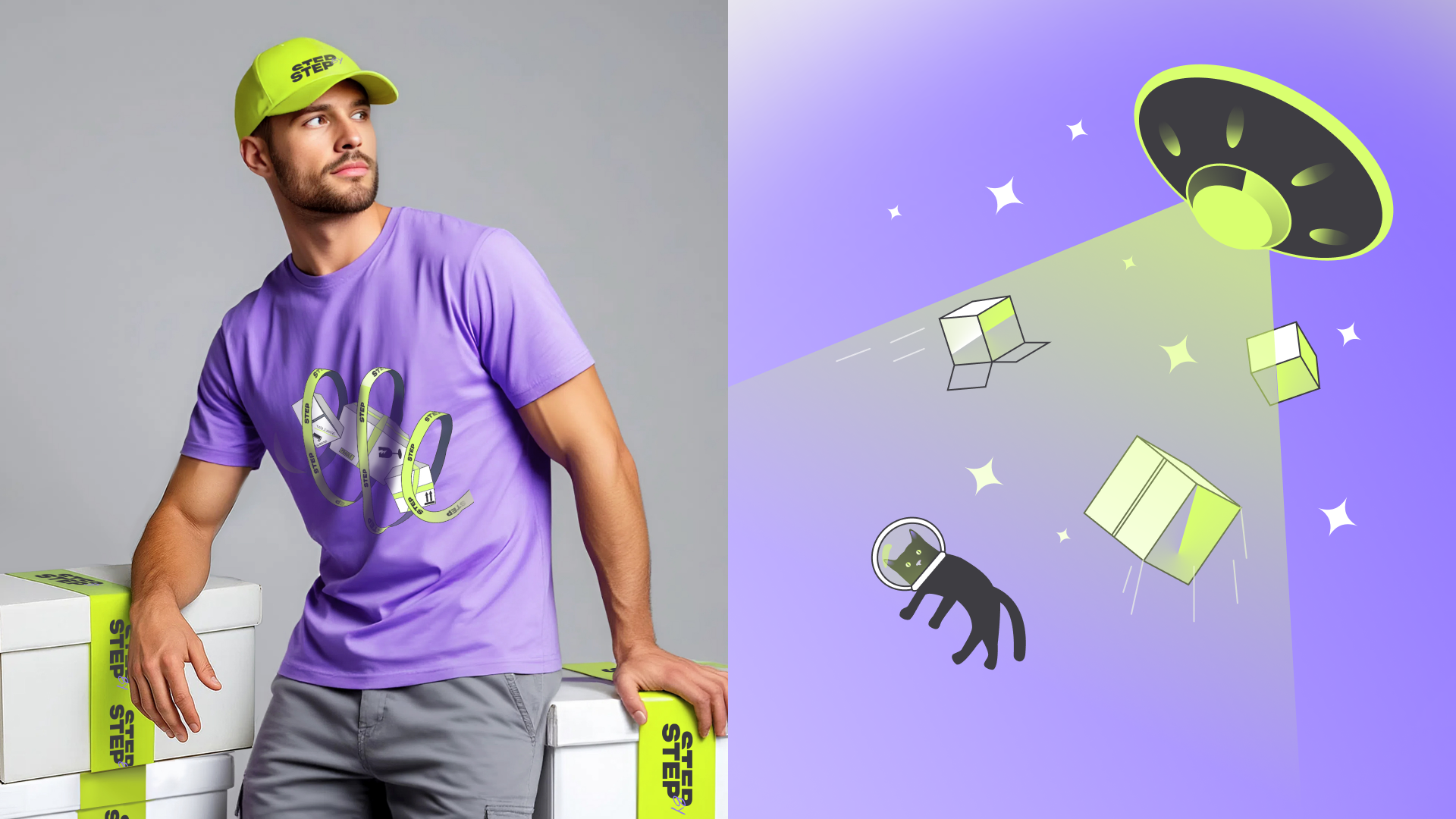 Отсюда и цель — создать не стиль, а ауру. Забота, лёгкость, простота и яркость, ощущение, что переезд — это не проблема. Использование сочных красок на фоне унылого города. Графика — энергичный, как танец, комикс. И главный мотив — волшебство, намек на магию, на технологичное чудо. Оно прилетает, и вас больше нет там. Вы уже здесь. В новом месте. С котом. И с улыбкой.