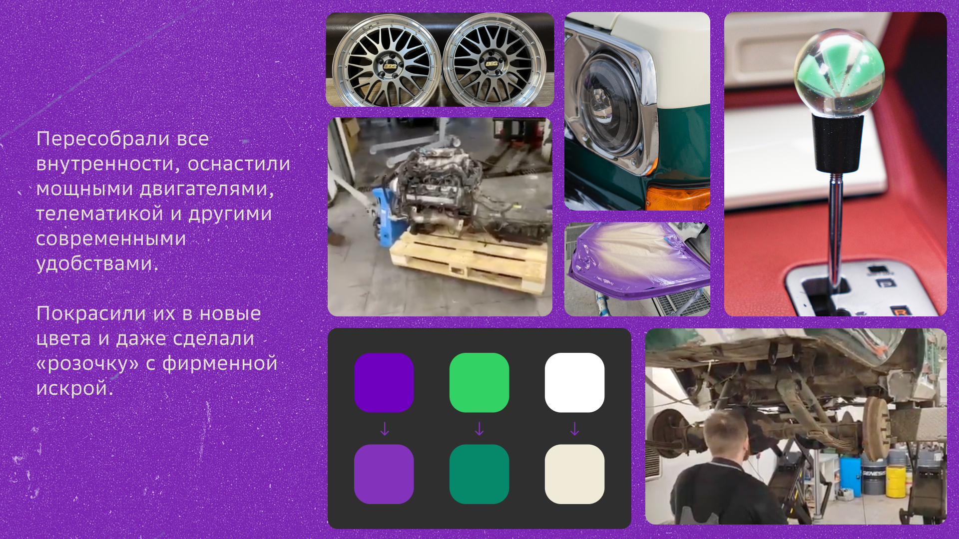 Машины восстановили на собственных СТО — от двигателя до покраски. Каждая деталь прорабатывалась совместно с дизайнерской командой, чтобы сохранить дух эпохи и добавить комфорт современности.