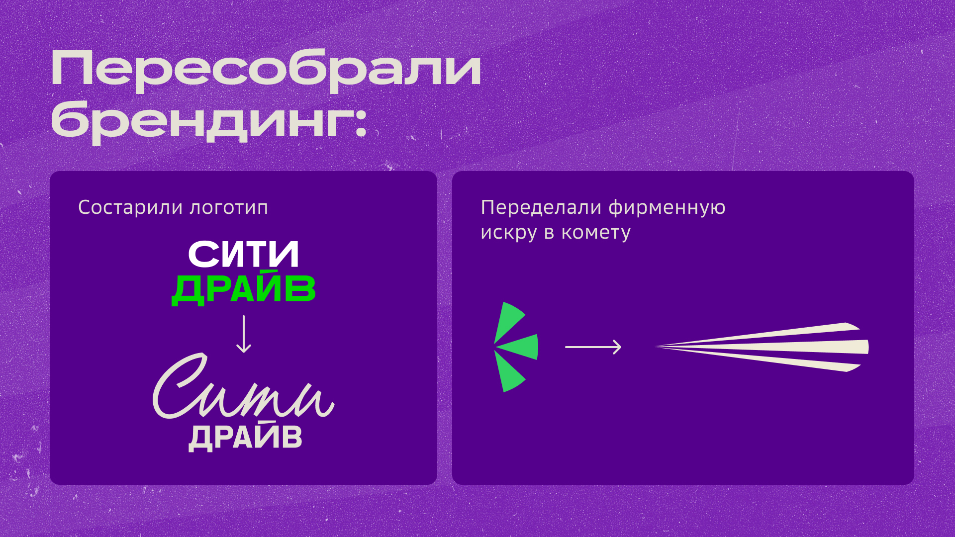 Мы изменили палитру, сделав фирменные цвета теплее и глубже: приглушили насыщенный фиолетовый и кислотный зеленый, так они приобрели новое бархатное звучание. «Искра» Ситидрайва превратилась в комету — символ движения и времени, а логотип превратился в ретро-версию, вднохновлённую экспонатами музея ГАЗ.