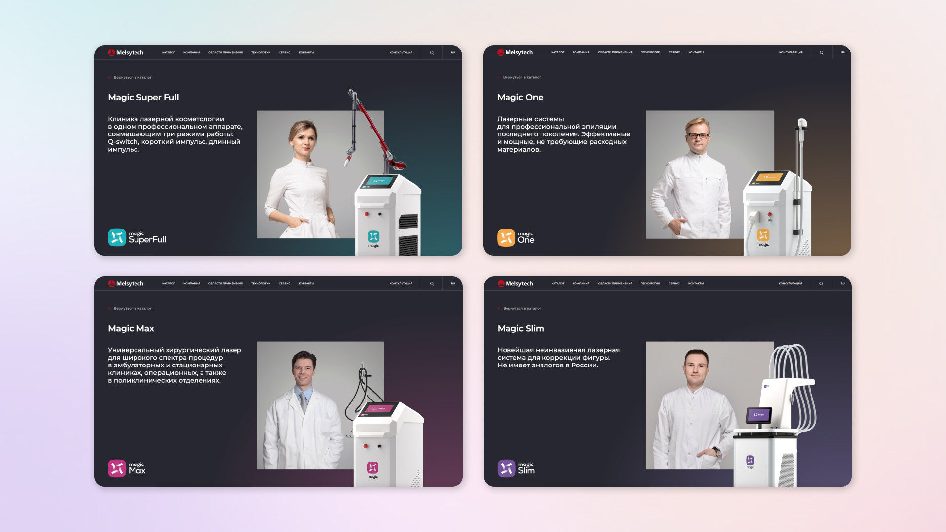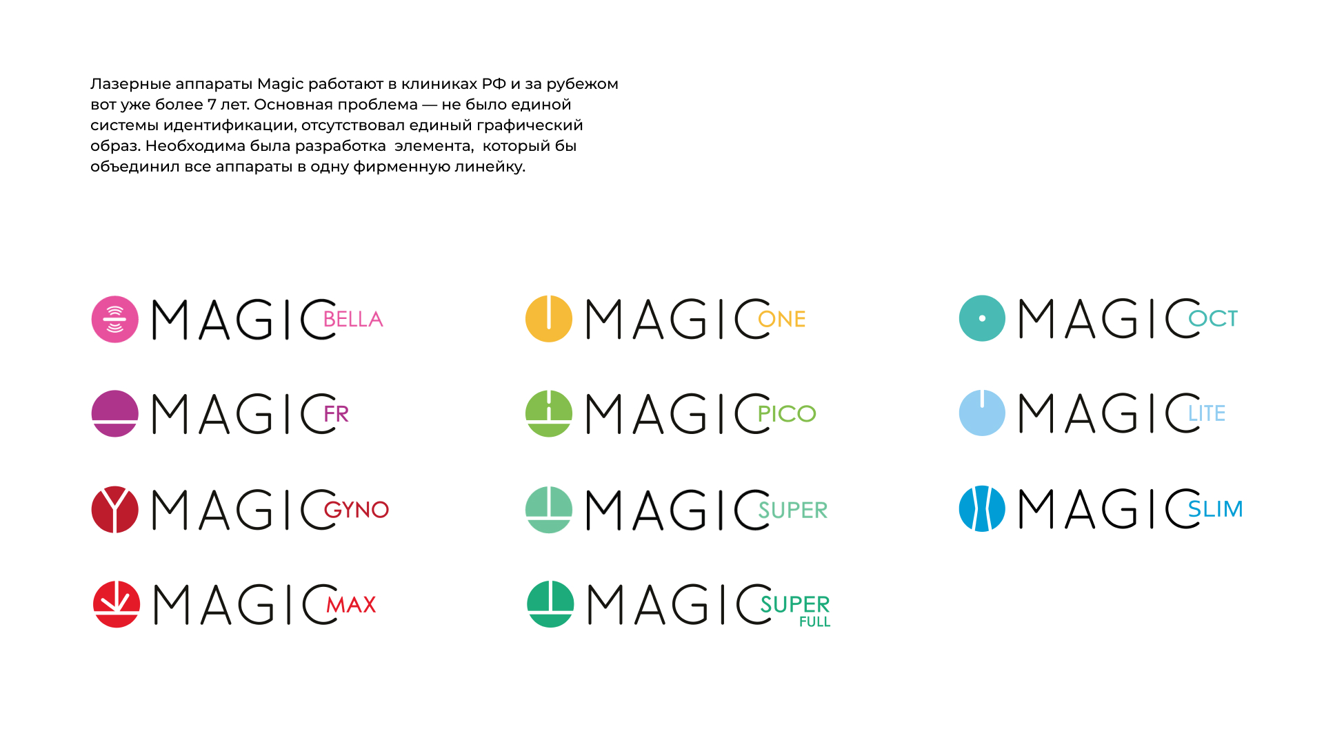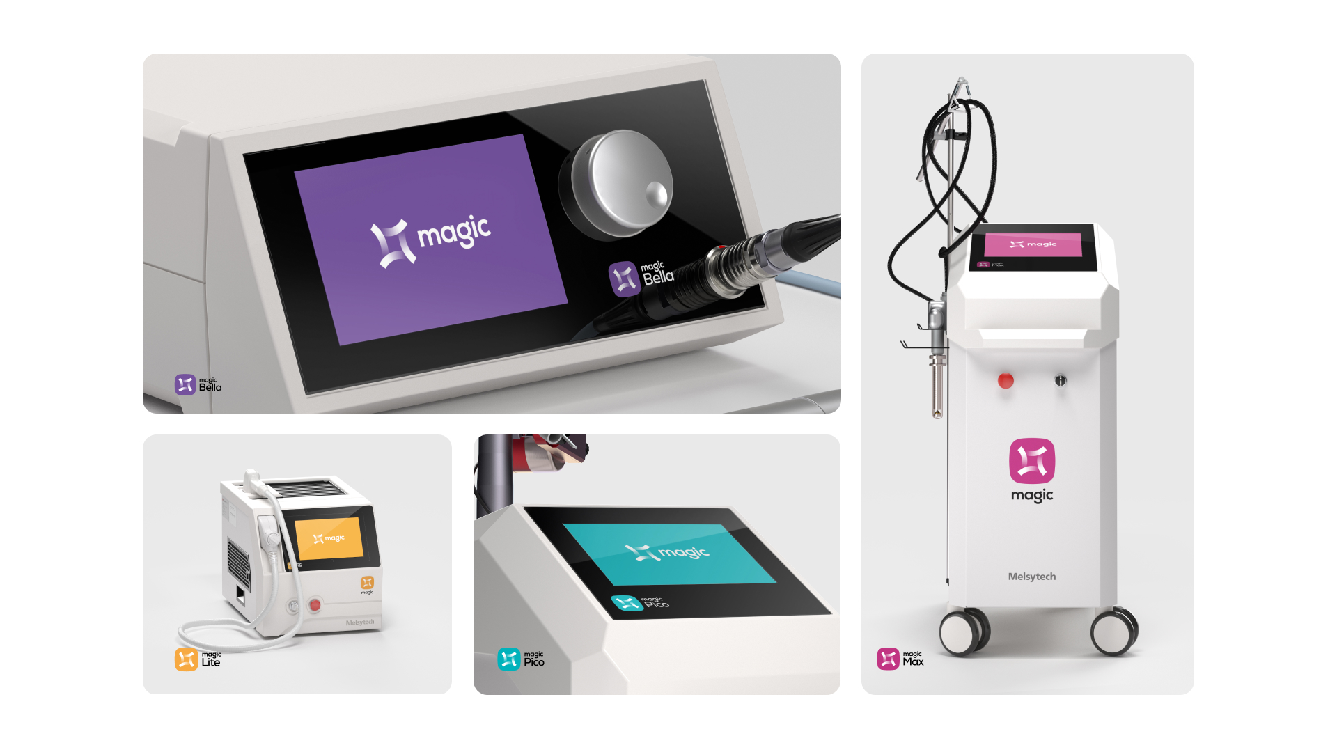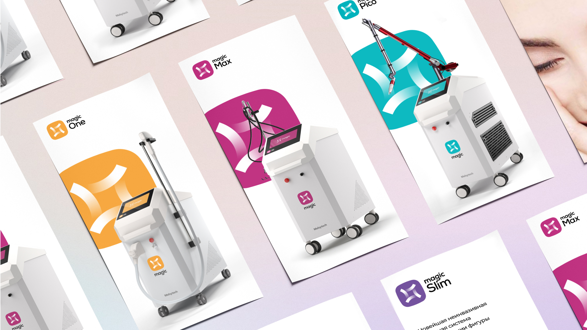 Система айдентики Magic для линейки профессиональных лазерных аппаратов от компании Melsytech решила основную проблему прежней идентификации бренда — отсутствия единого графического образа. Ранее в зависимости от модели менялся и фирменный знак, при этом гарнитура оставалась единой. Это вводило в заблуждение клиентов и партнёров компании, что сказывалось на продажах и аренде оборудования.