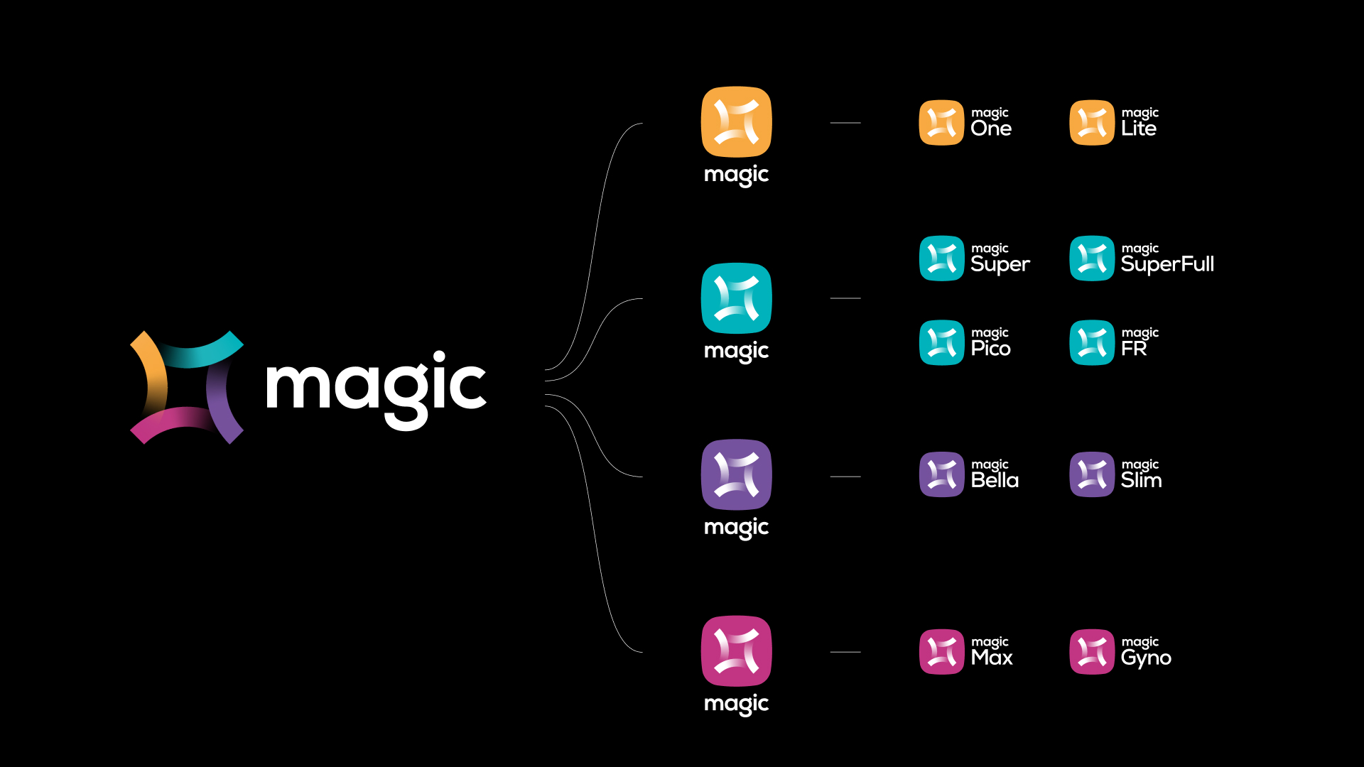 Было неудобно — стало удобно. Форма знака образована из четырёх компонентов, символизирующих сегменты работы аппаратов: эпиляция, косметология, аппараты по телу и медицина. Эстетика подачи продиктована направлениями. Фирменный знак напоминает и наконечник волшебной палочки, и стилизованную вспышку, и сияние звезды. Магия технологий. Такой разный и одинаковый одновременно, теперь это основа идентификации всех направлений в рамках одной линейки — Magic!