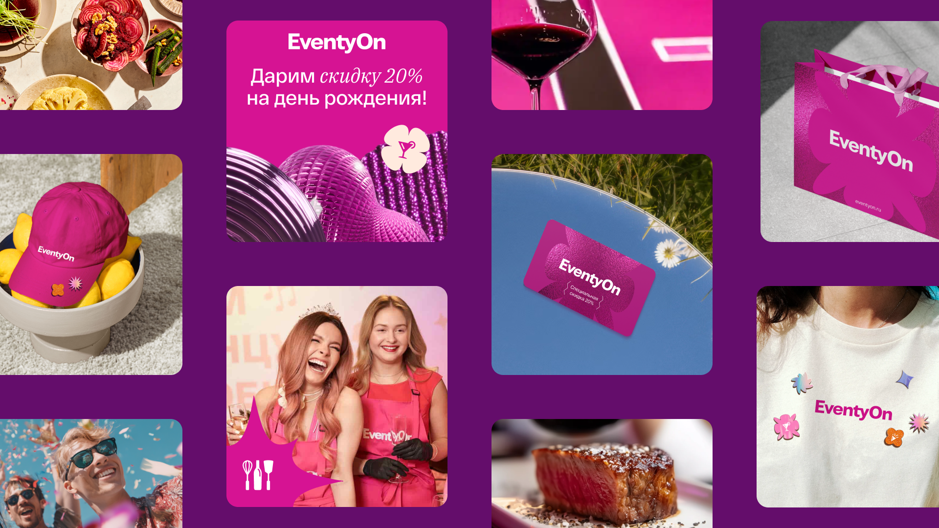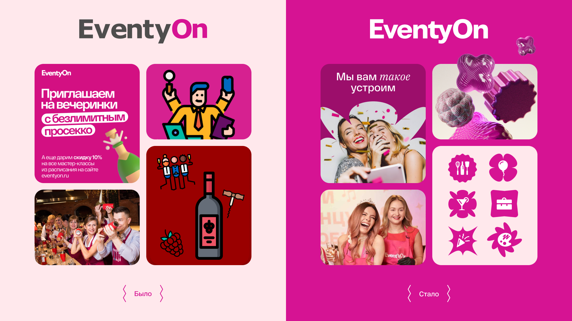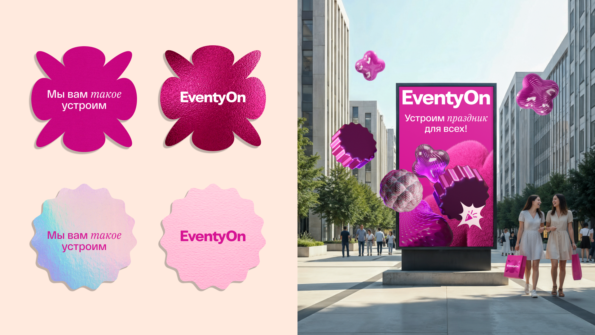 В сочетании с цветовой гаммой шейпы создают стиль, который передаёт ощущения гостей от взаимодействия с EventyOn. Слоган завершает эмоциональный образ — «мы вам такое устроим»! Ярко, смело и дерзко.