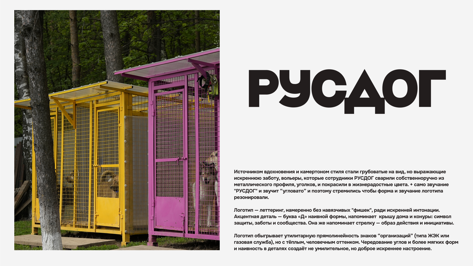 Пластика и стиль вдохновлены вольерами, которые сотрудники РУСДОГ заботливо сварили своими руками из металлического профиля, уголков, и покрасили в жизнерадостные цвета. Эти простые, угловатые, но добрые формы вдохновили логотип, выбор шрифта, подход к композиции и цветам.