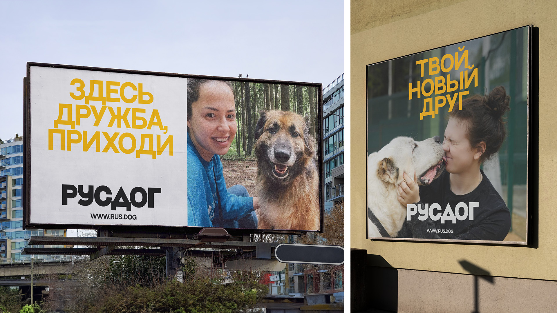 Айдентика строится на контрасте угловатых форм и "тёплого" текста/фото/видео, создающем искреннюю интонацию. Простые композиции, чуть грубоватый лого и шрифт, жизнерадостные цвета передают атмосферу доброжелательности и честности. Стиль легко воспроизводим силами команды (без дизайнера), живёт в соцсетях и на одежде волонтёров, помогая РУСДОГ звучать искренне и по-настоящему