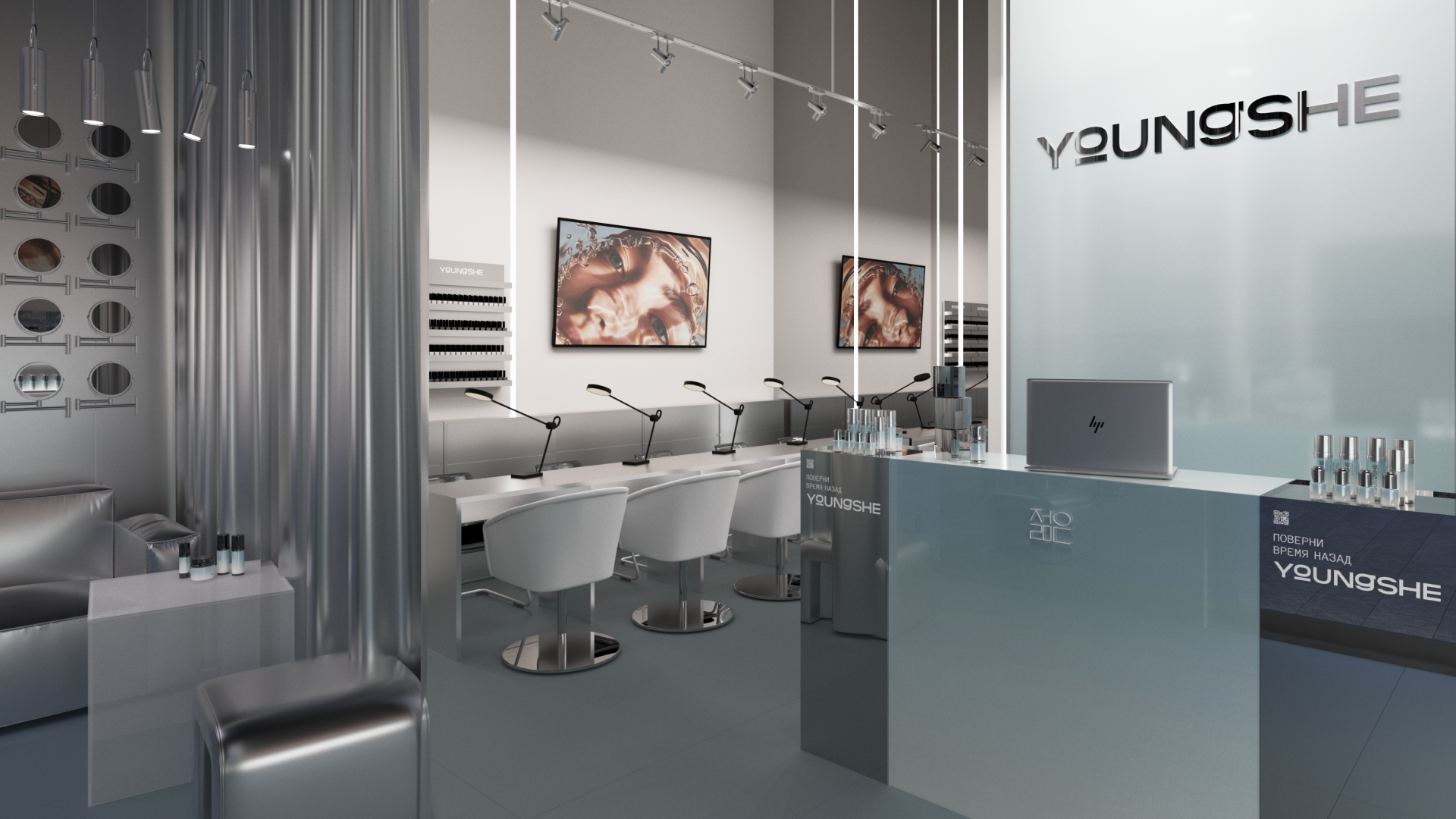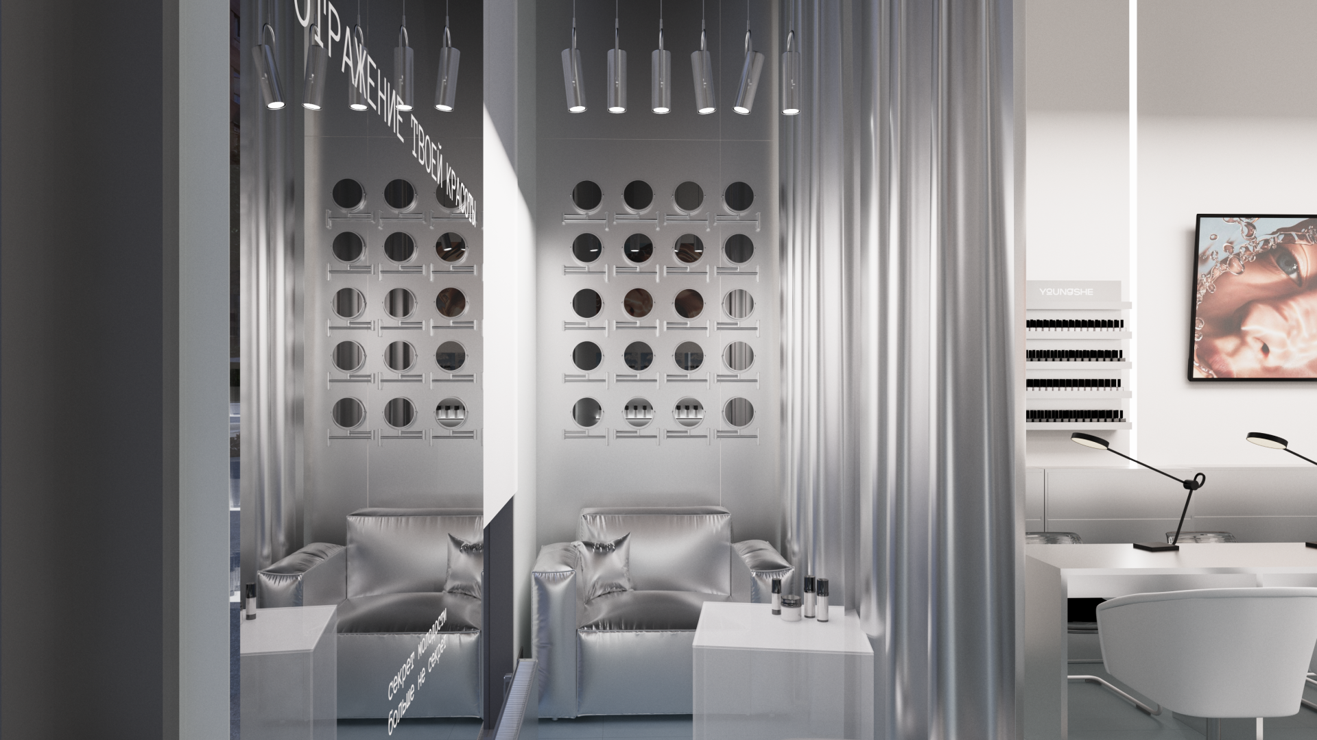 Метафора зеркала нашла проявление в визуальной среде бренда. В интерьере — обилие света, отражающих поверхностей, стекла и полированного металла, создающих эффект «мягкого сияния». Посетитель оказывается как бы внутри метафоры: пространство реагирует на движение и взгляд, напоминая, что истинная красота всегда отражается.