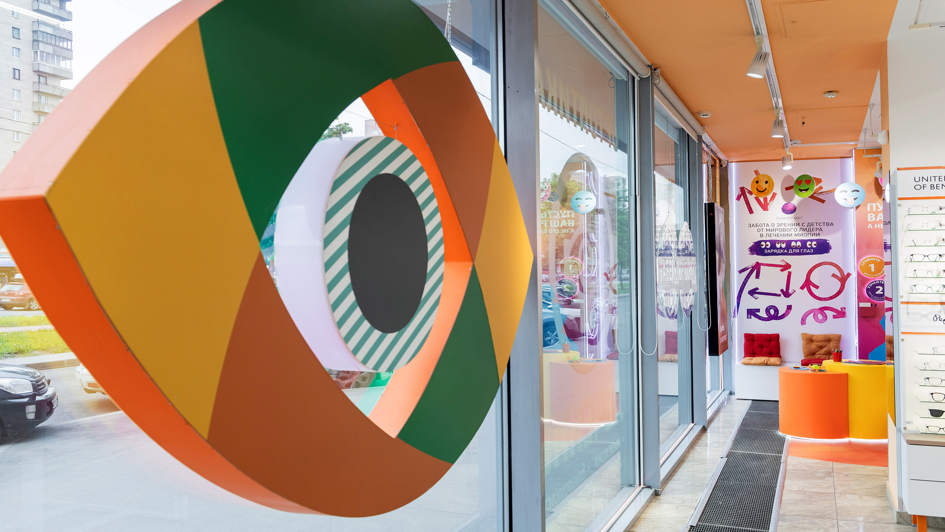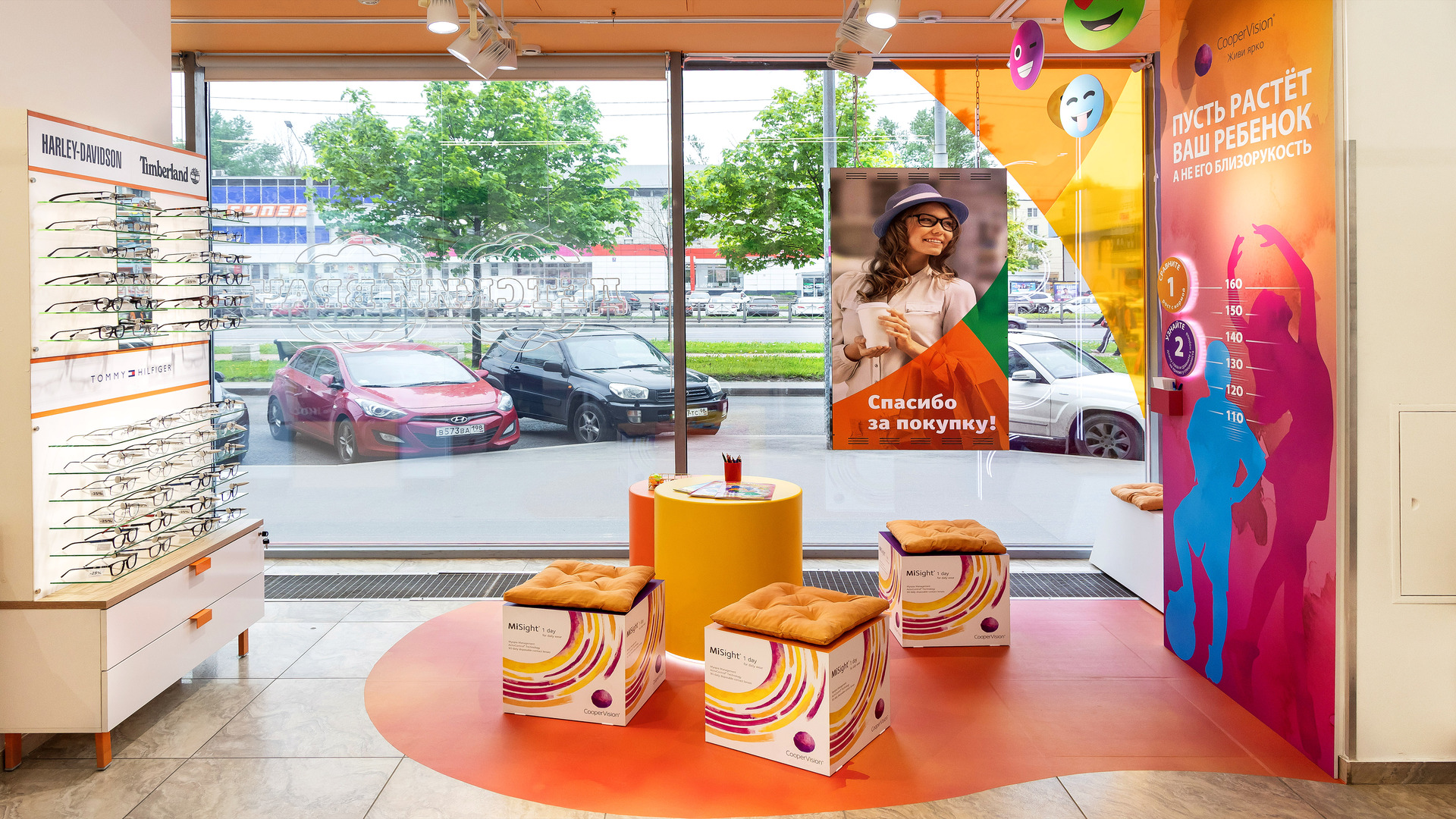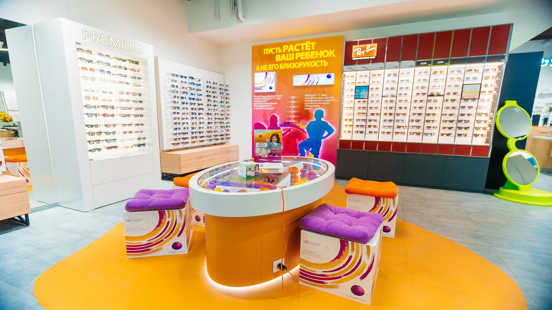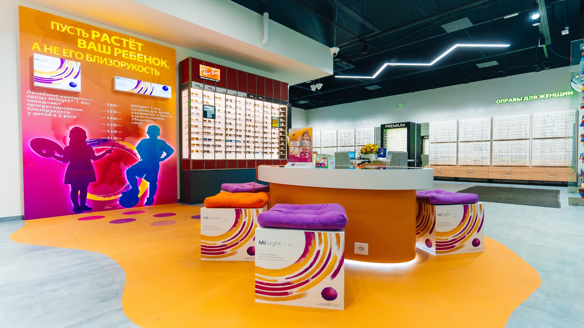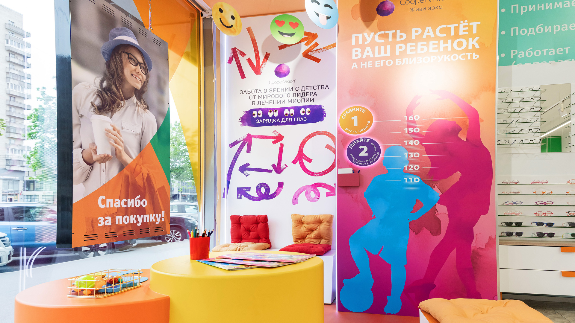 Детская линейка MySight: инновационные линзы, замедляющие миопию. Созданы яркие, дружелюбные зоны, превращающие поход в оптику из «медицинской процедуры» в комфортный семейный опыт. Мягкие формы и акцентные цвета снижают тревожность, делают визит в оптику позитивным и привлекают внимание проходящих мимо. Детские зоны, вовлекающие родителей в тему ранней диагностики миопии, не имеют аналогов.