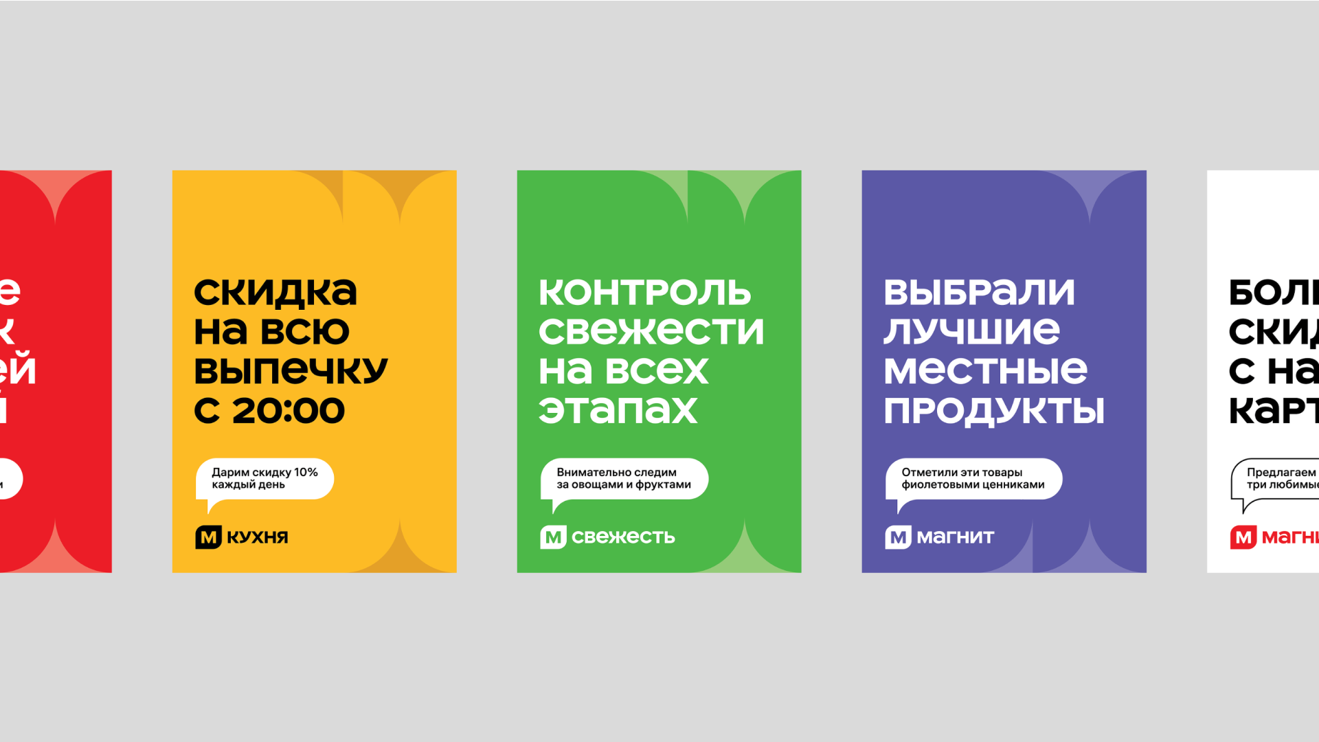 Для оформления всех торговых точек сети мы задизайнили Магнитус — дружелюбный неогротеск, наполненный интересными и свежими деталями. Прямо как товары в супермаркете!
