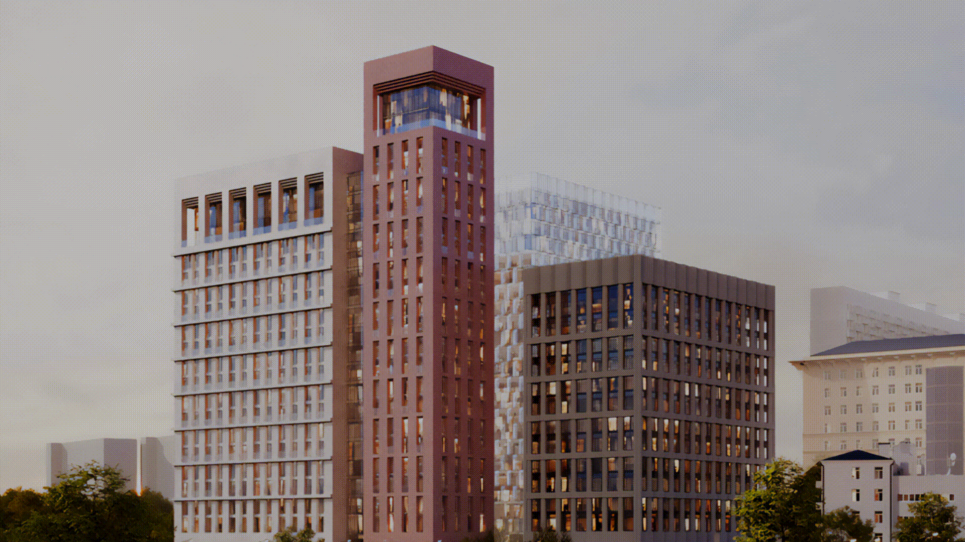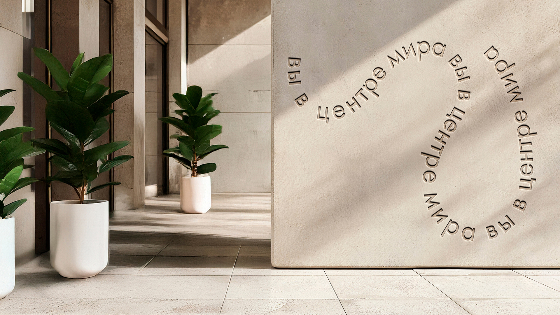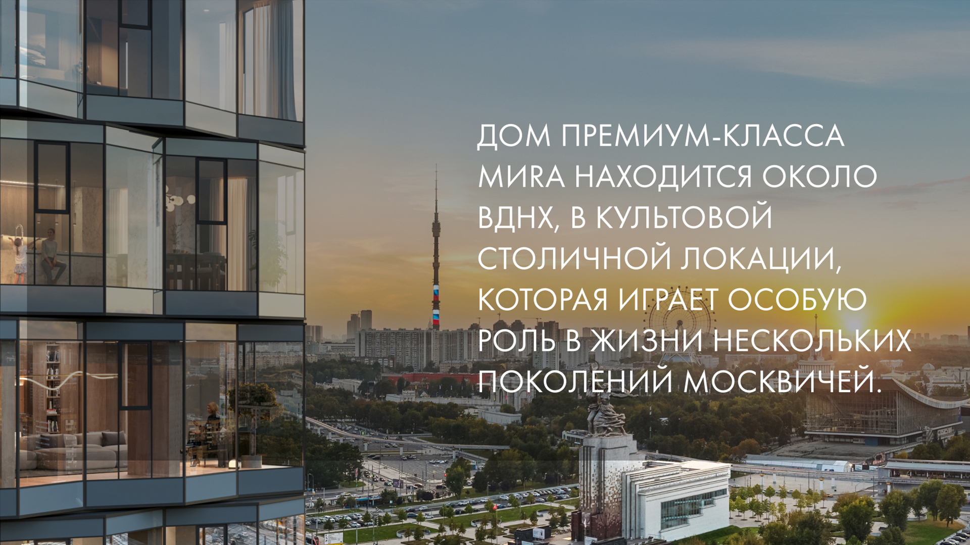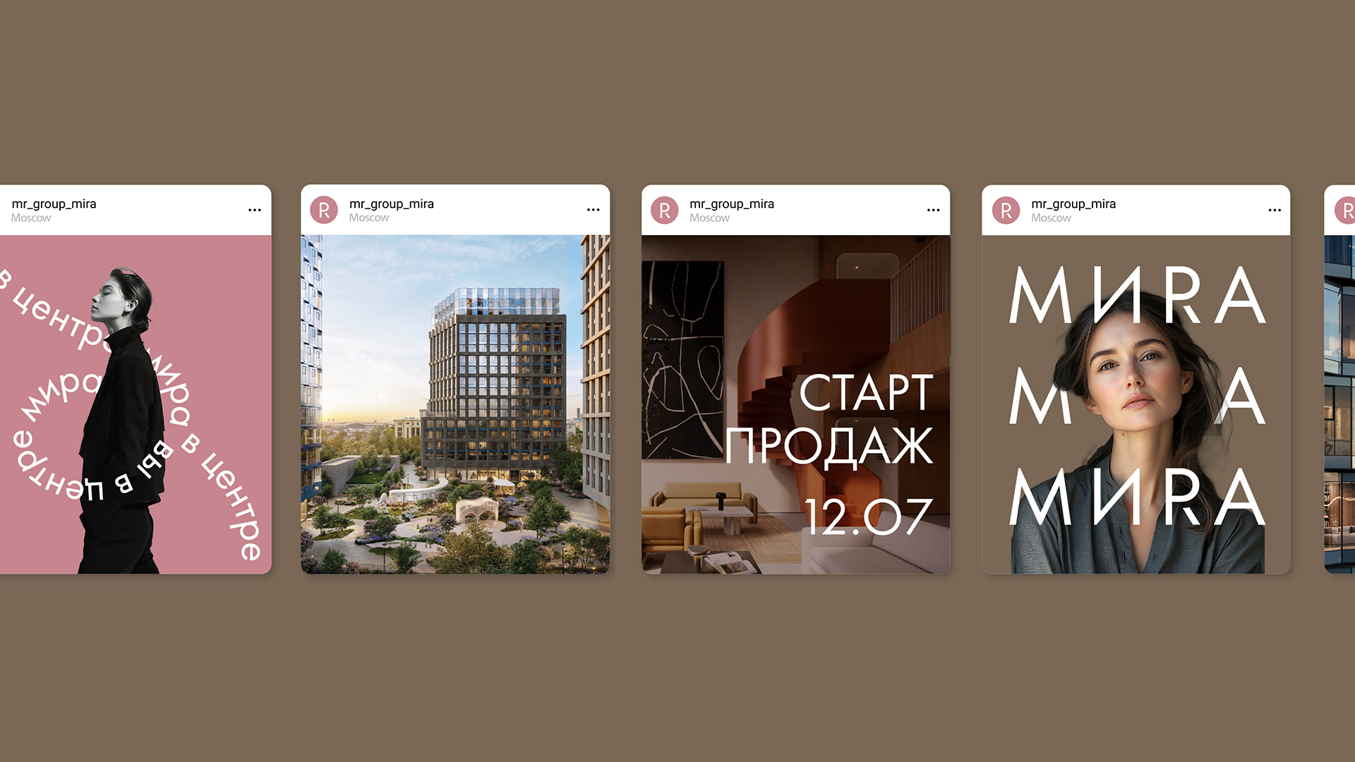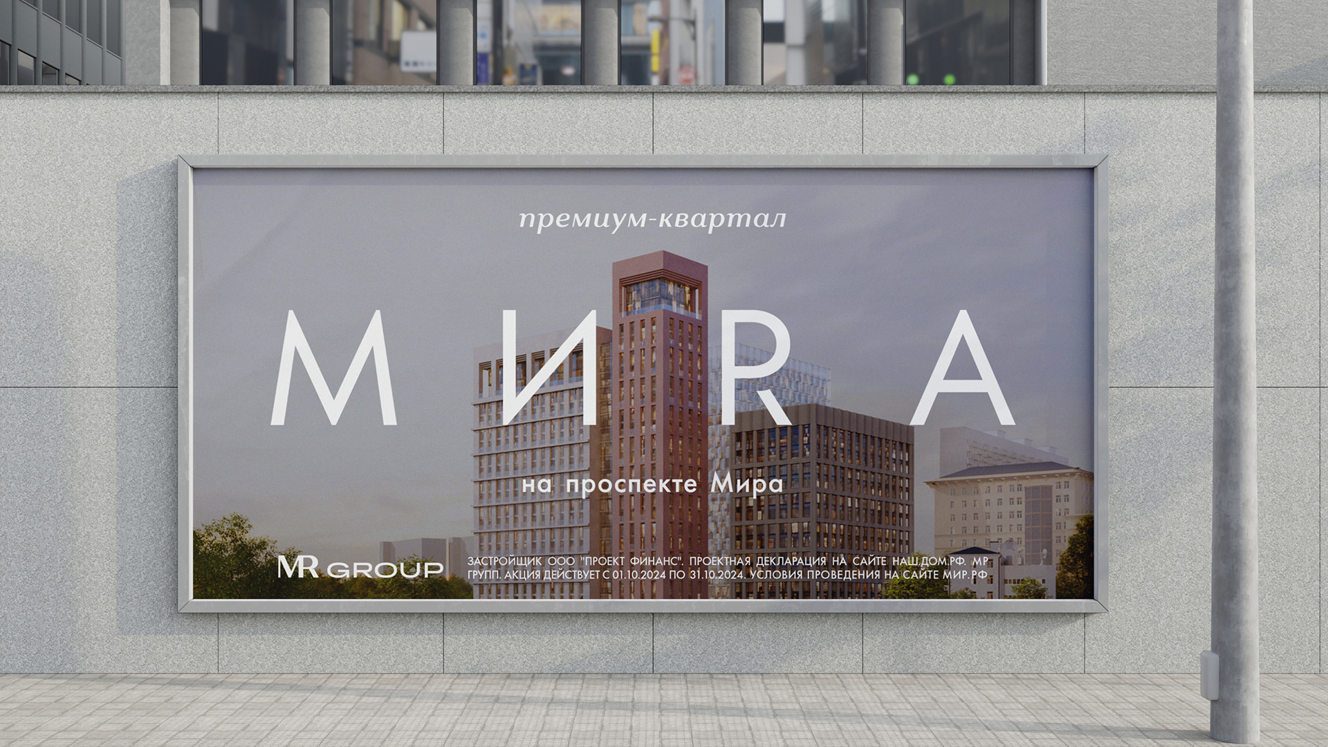 Дом премиум-класса MИRA расположен на проспекте Мира, напротив ВДНХ. Проект создавался как точка спокойствия и уюта для сообщества людей с близким статусом и ценностями. Главная концепция — «Вы в центре мира». Это не просто слоган, а философия, воплощённая в визуальном языке. Ключевой графический элемент — динамичная текстовая лента, окутывающая здания и другие объекты, создает метафору камерности и защищённости. Её плавное движение символизирует жизнь в MИRA: спокойную и осмысленную.